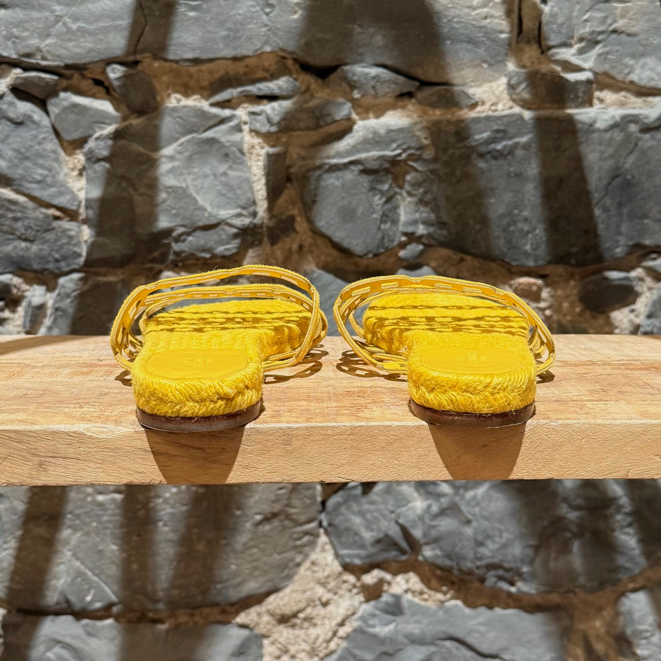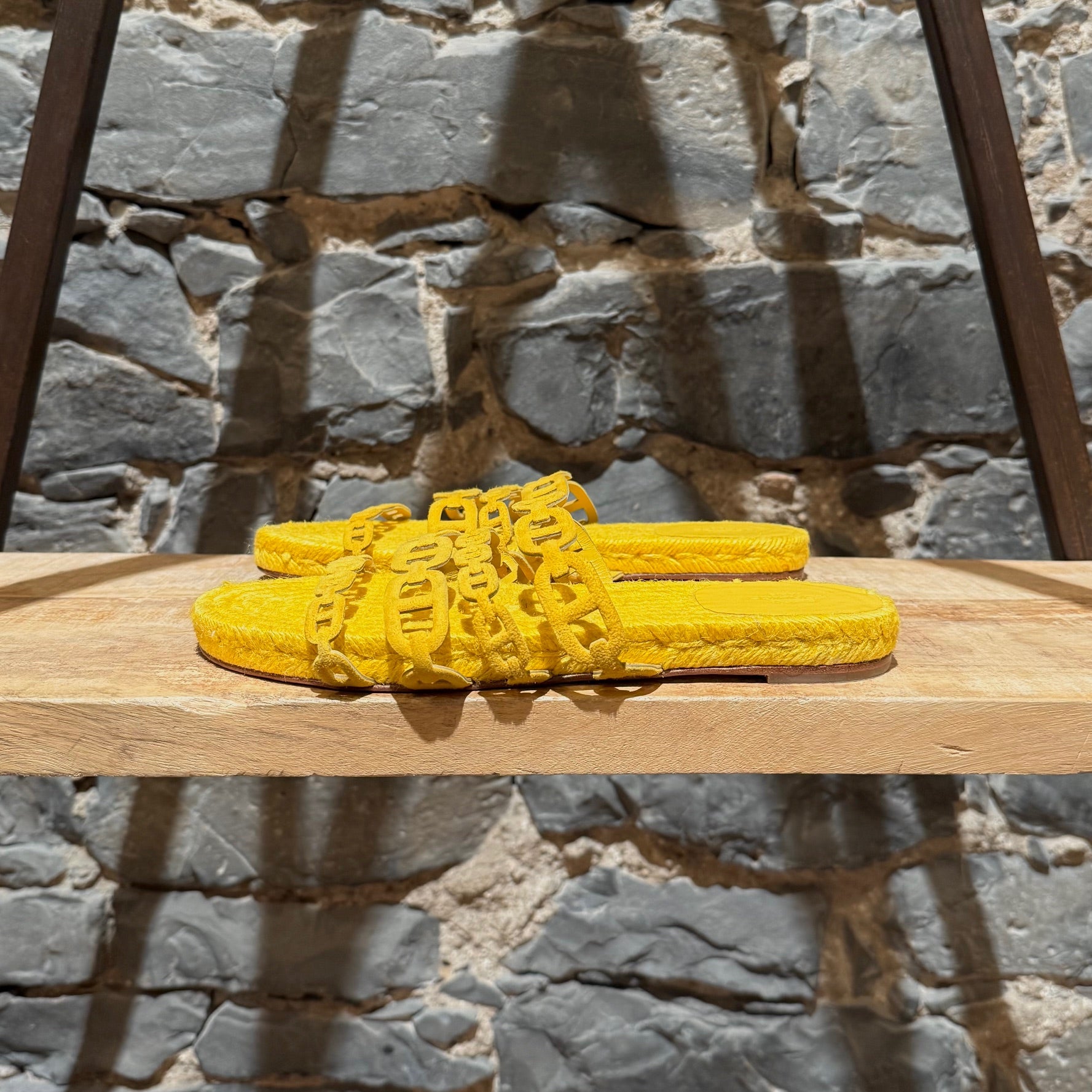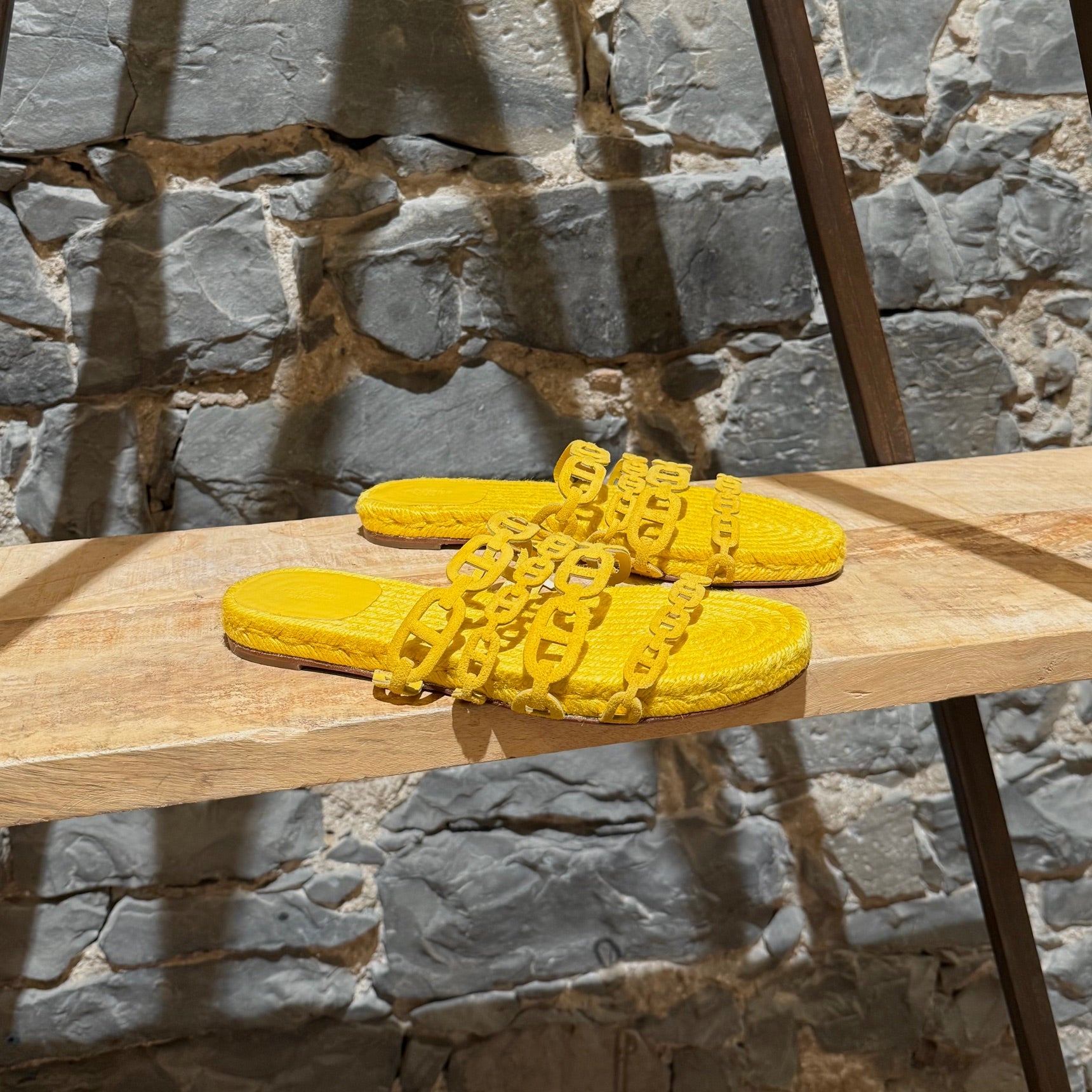 Hermès Yellow Ancone Thalassa Chaine d'Ancre Sandals. Yellow natural braided jute base with a flat espadrille-style sole. Smooth leather insole at heel. Five (5) multi sizes chain straps, inspired by the iconic Chaine d'Ancre motif, in tonal leather lined suede. Leather outsoles. Made in Spain. They come with dustbags.