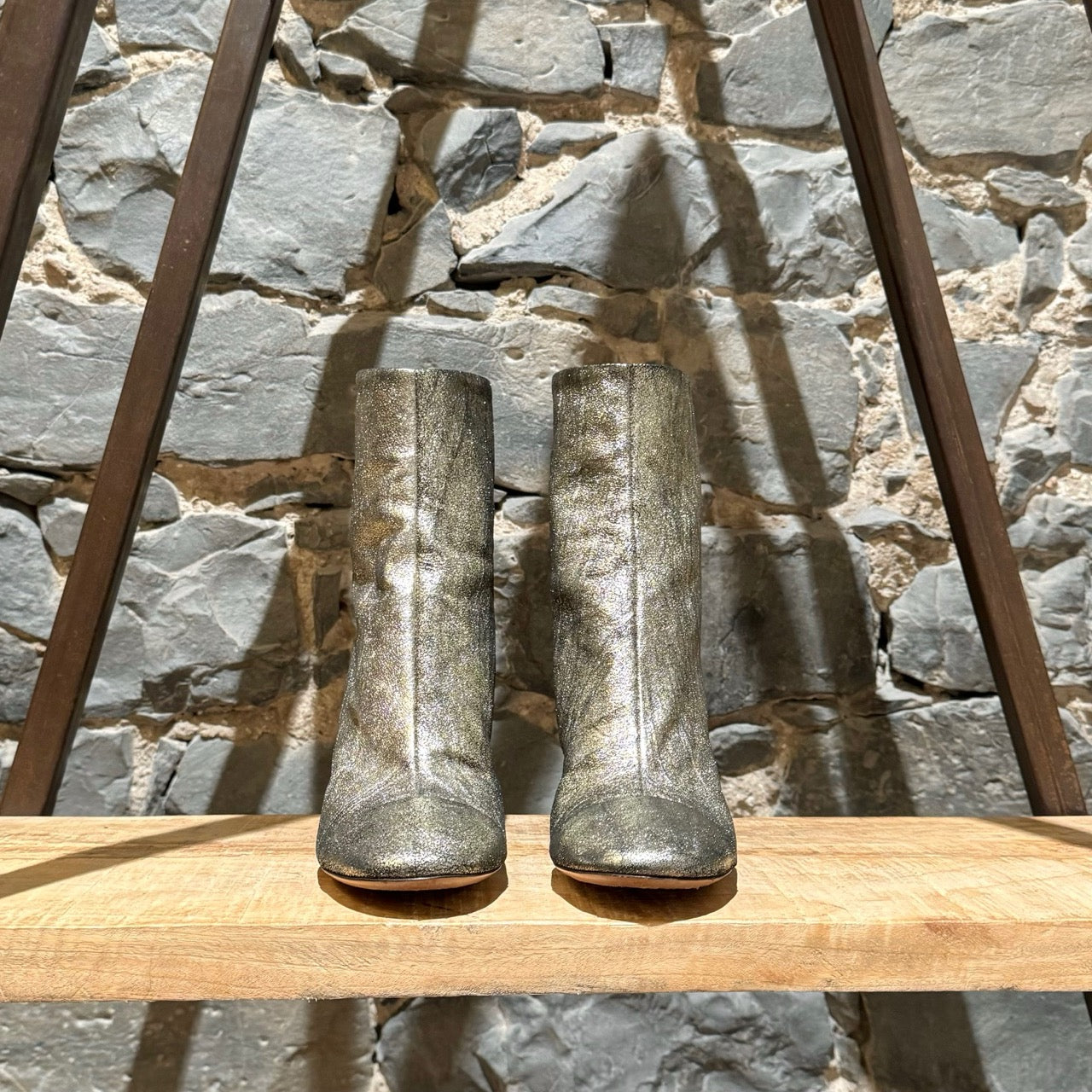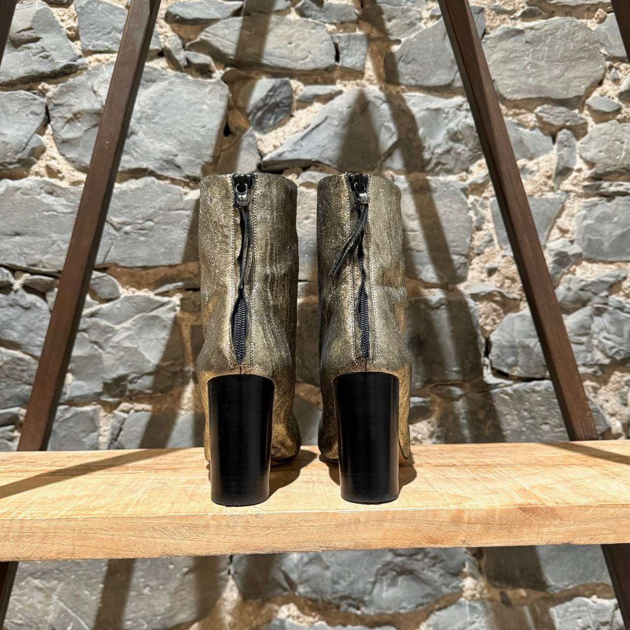 Metallic gold leather upper. Round toes with cap toe effect. Back zip closure. Silver-tone hardware. Black high block heel. Leather insoles. Made in Italy. Come with a dustbag.
