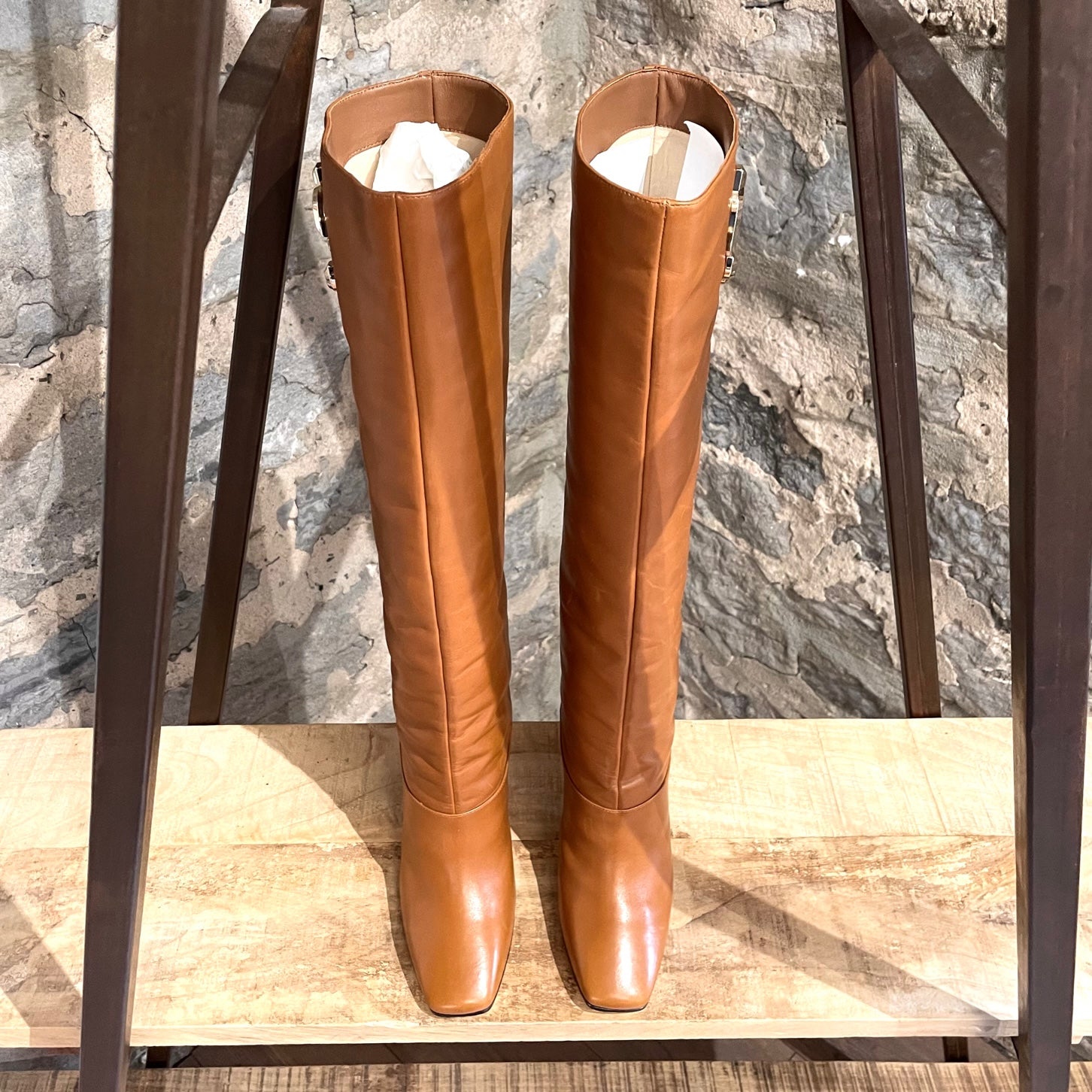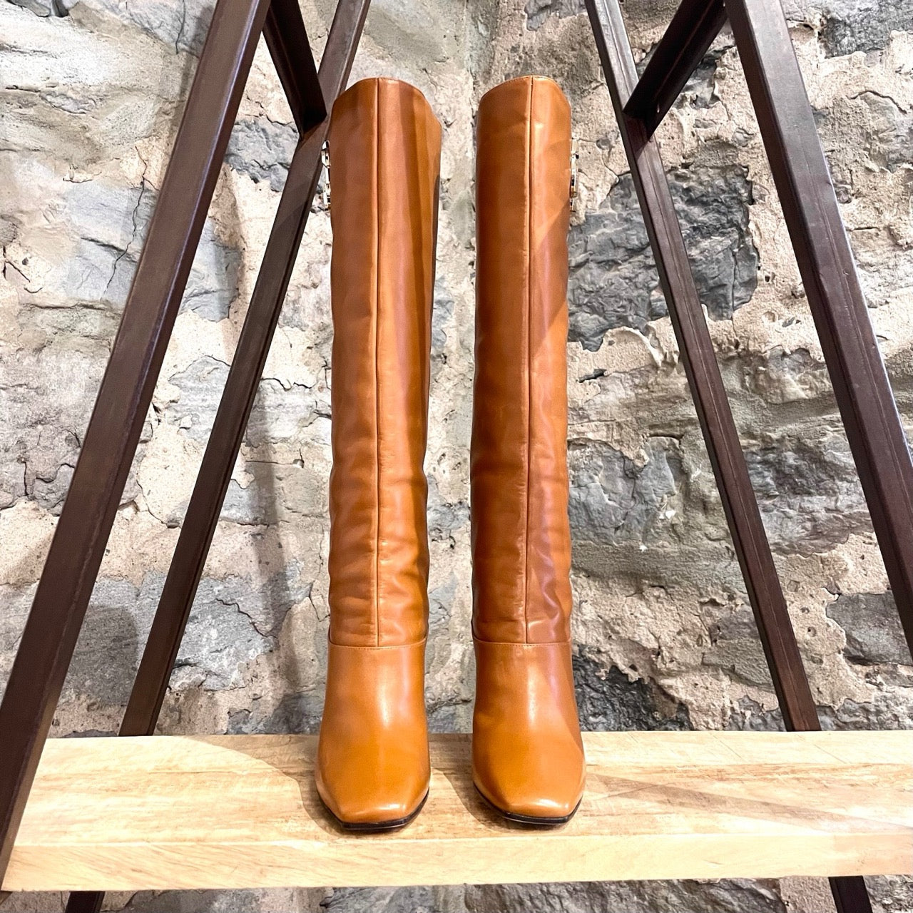 Heeled tall pull-on boots. Light gold-tone logo plaque at outer sides. Bloc heel. Square toe. Beige leather insoles. Made in Italy. Come with a dustbag.