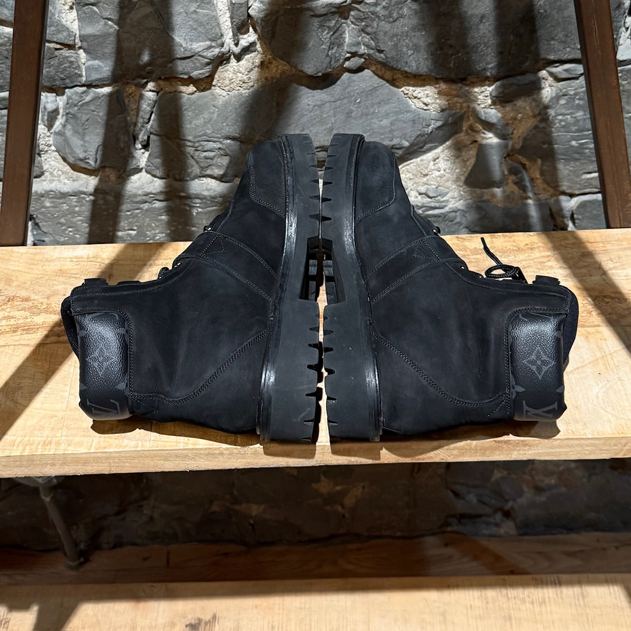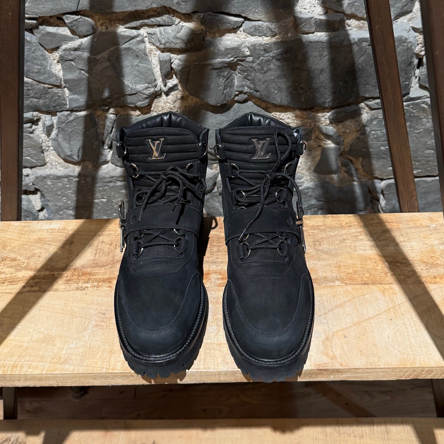 Part of the Louis Vuitton Staples Edition by Virgil Abloh. Ankle boots. Black nubuck leather with Monogram Eclipse padded collar. Branded silver-tone hardware. Front lace-up closure with round laces and metal eyelets. Adjustable midfoot strap secured by metal attach. Lateral side decorated metal plaque. LV metal logo at tongue. Lugged rubber sole with Monogram flower metal studs. Interior leather insoles. Made in Italy. Comes as is.