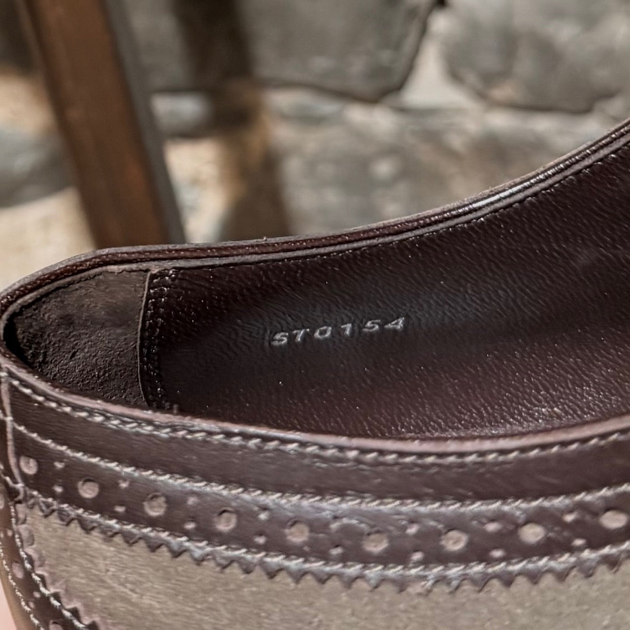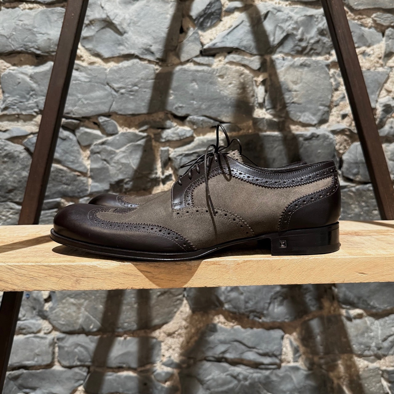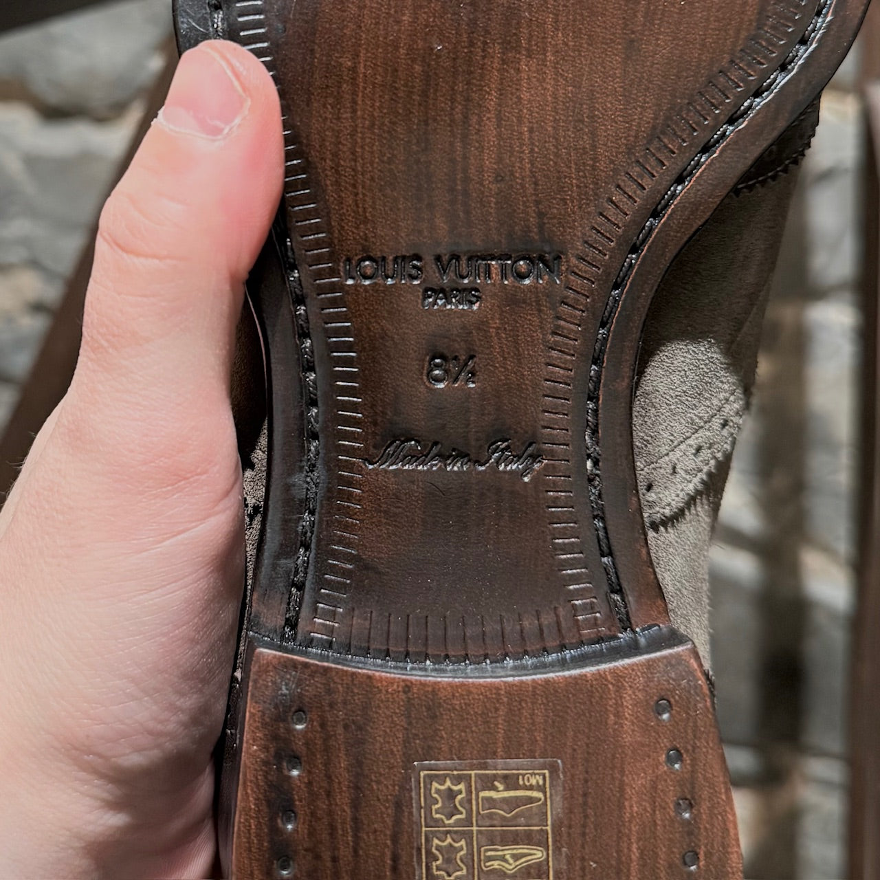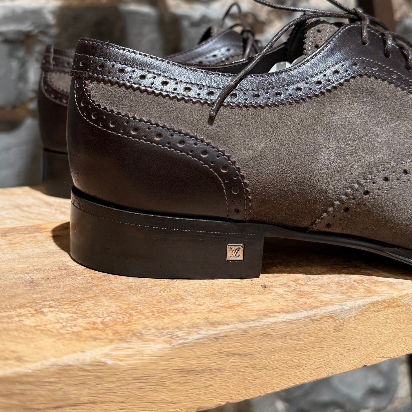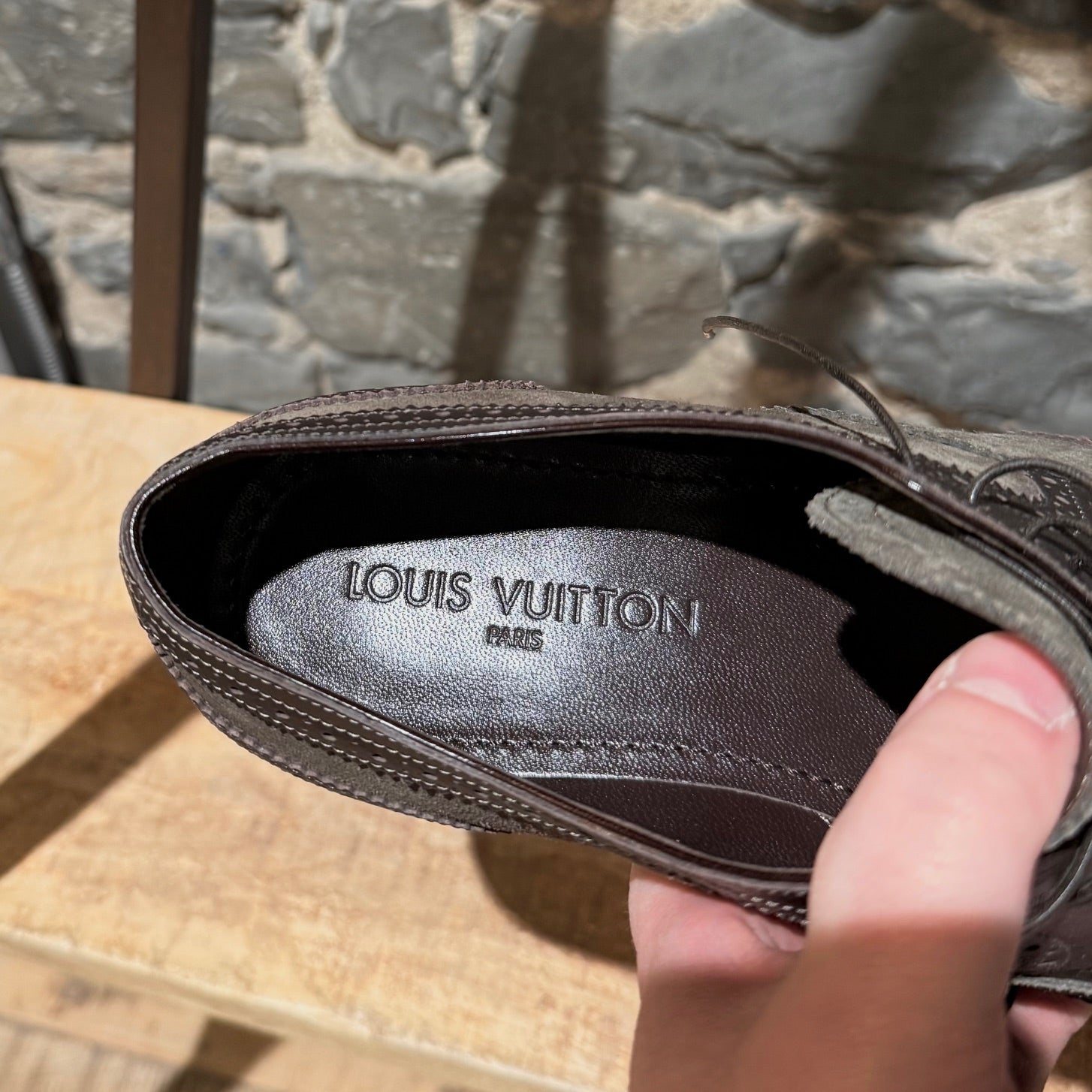 Classic lace-up Oxford dress shoes in khaki suede with dark brown leather overlays. Wingtip-style brogue edges. Lace-up closure. Round leather cap toe. Small LV metal detail at heel. Leather lining, insole and outsole. Come as is.