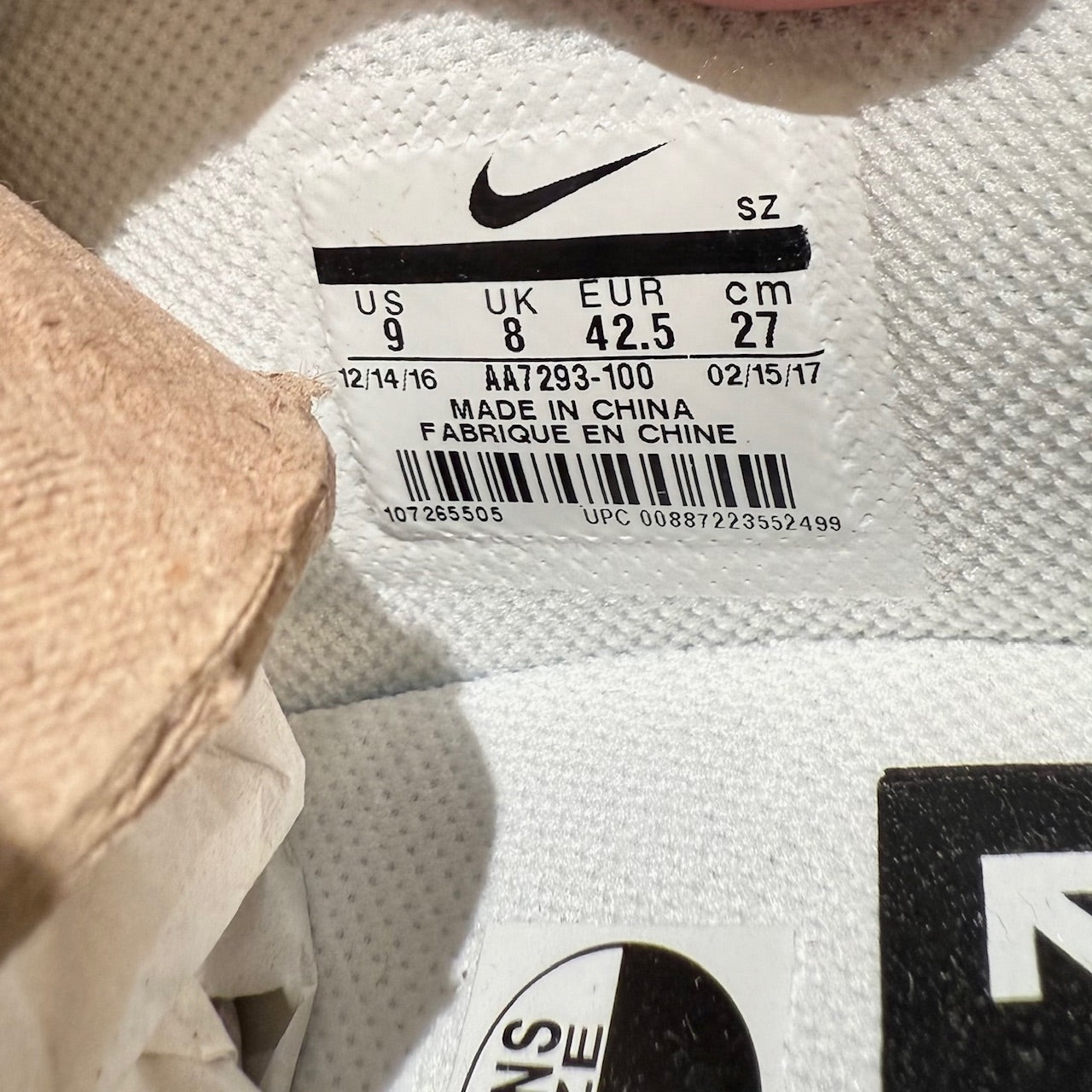 Limited edition collaboration designed by Virgil Abloh for Nike. Ivory and white with muslin and grey accents. Mesh upper with suede and leather overlays on sides and back. Tonal white Swoosh detailing on both sides. Padded foam tongue and ankle collar with stitched Nike Air tab. Black text print on the side with a contrast black eyestay overlay. Visible Max Air unit in the midsole for lightweight cushioning and impact protection. Fabric insole. Translucent rubber midsole with lugged outsole. Includes two (2) flat lace pairs: orange for one shoe, green for the other, each with “SHOELACES” text. Signature Off-White Tie-Wrap intact. Made in China. Comes with original box.