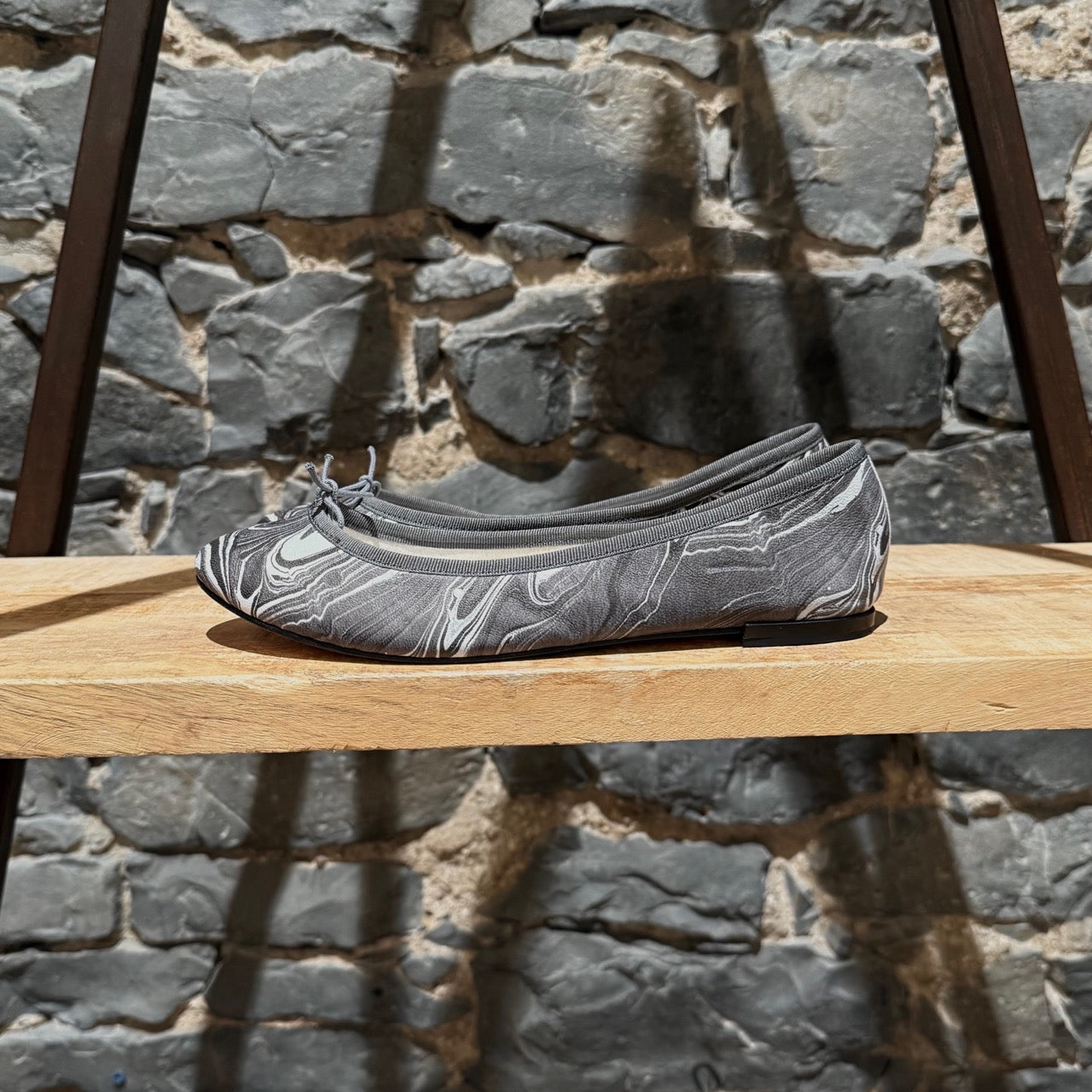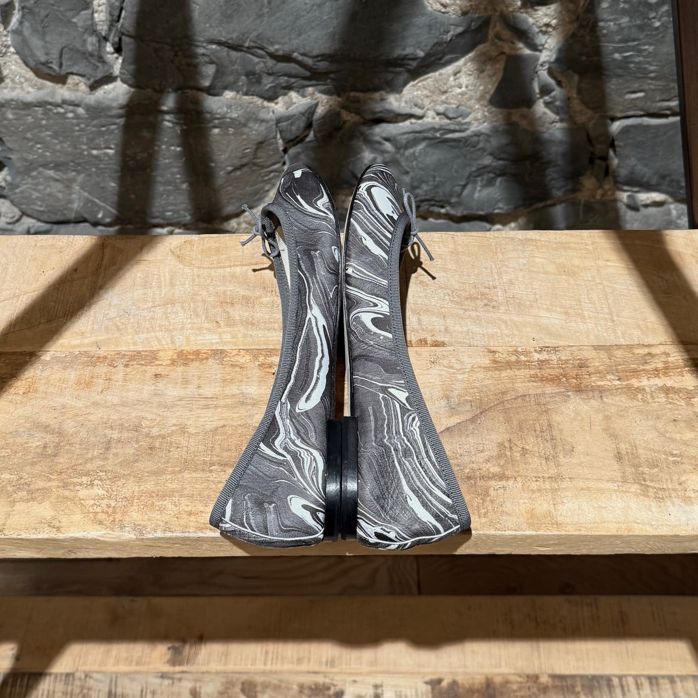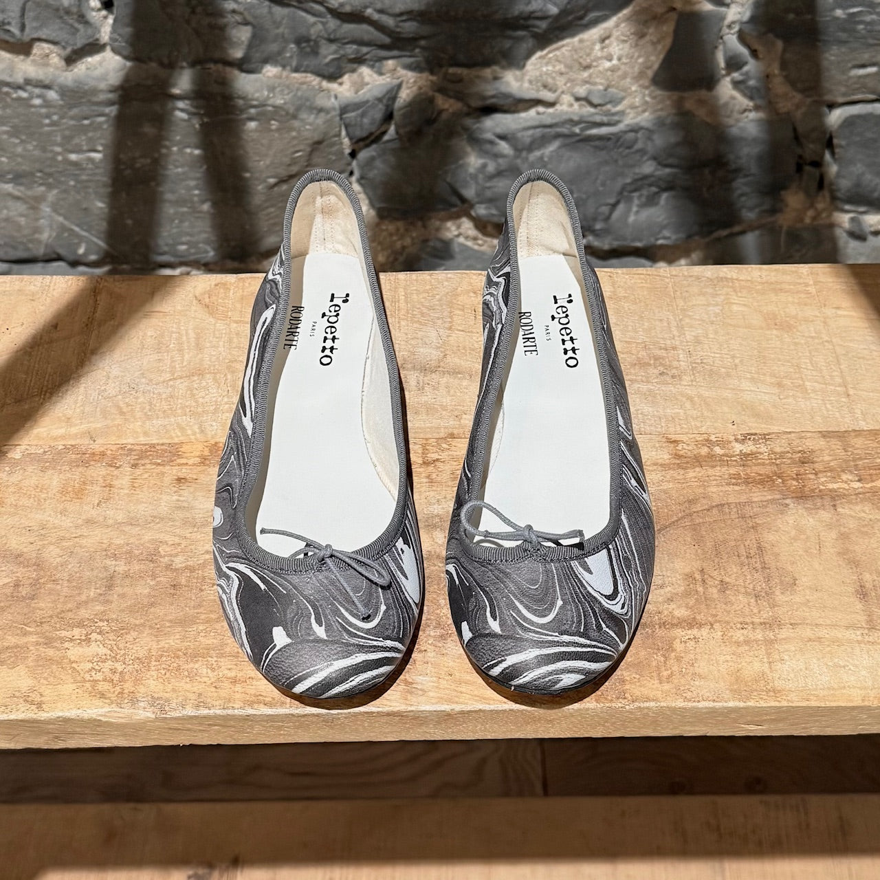 Limited collaboration from Repetto Paris x Rodarte. Classic round toe ballet flats. Grey and white marble print leather upper. Grey grosgrain trim with fabric bow. Low black stacked heel with rubber insert. Fabric lining. Ivory padded leather insole. Leather outsole. Made in France. Come with original box.