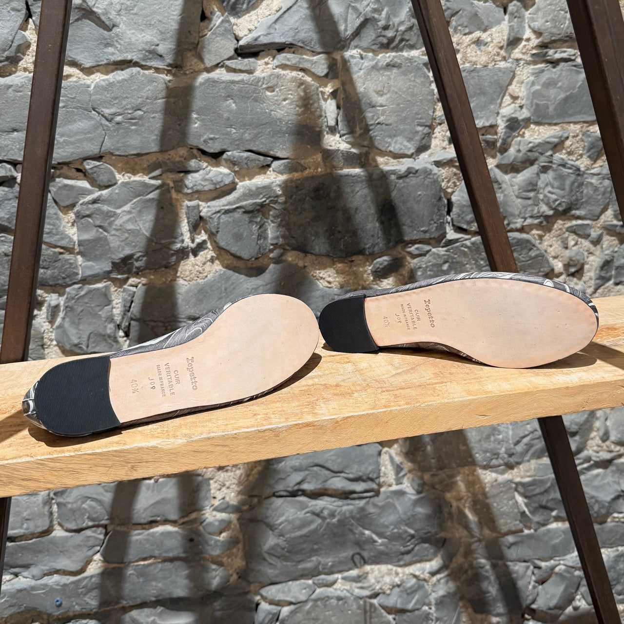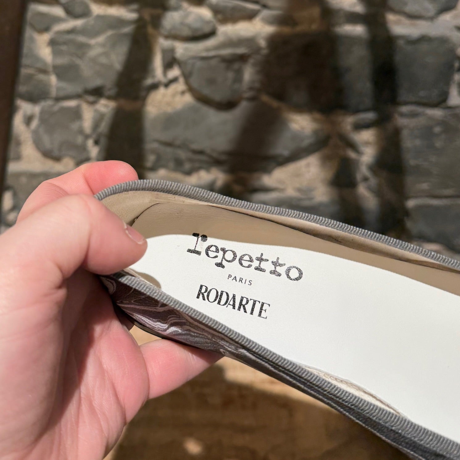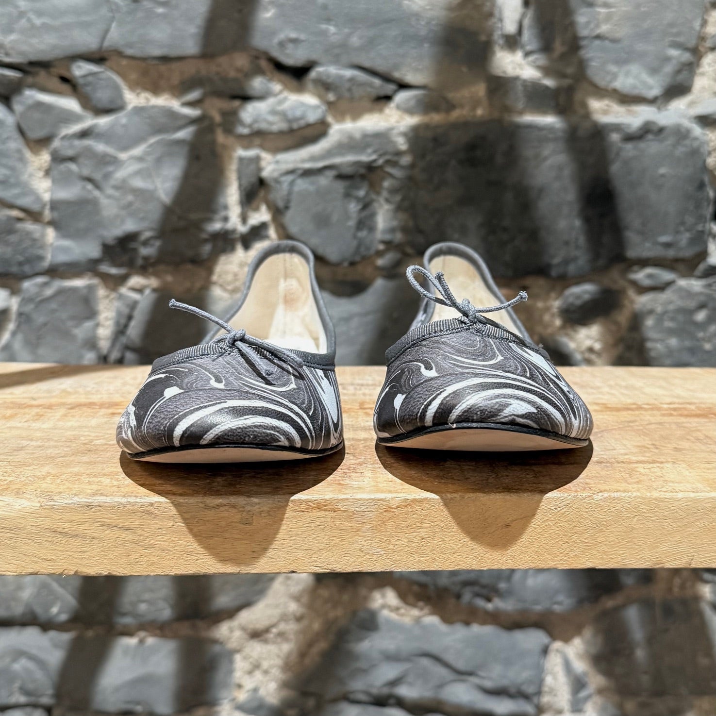 Limited collaboration from Repetto Paris x Rodarte. Classic round toe ballet flats. Grey and white marble print leather upper. Grey grosgrain trim with fabric bow. Low black stacked heel with rubber insert. Fabric lining. Ivory padded leather insole. Leather outsole. Made in France. Come with original box.