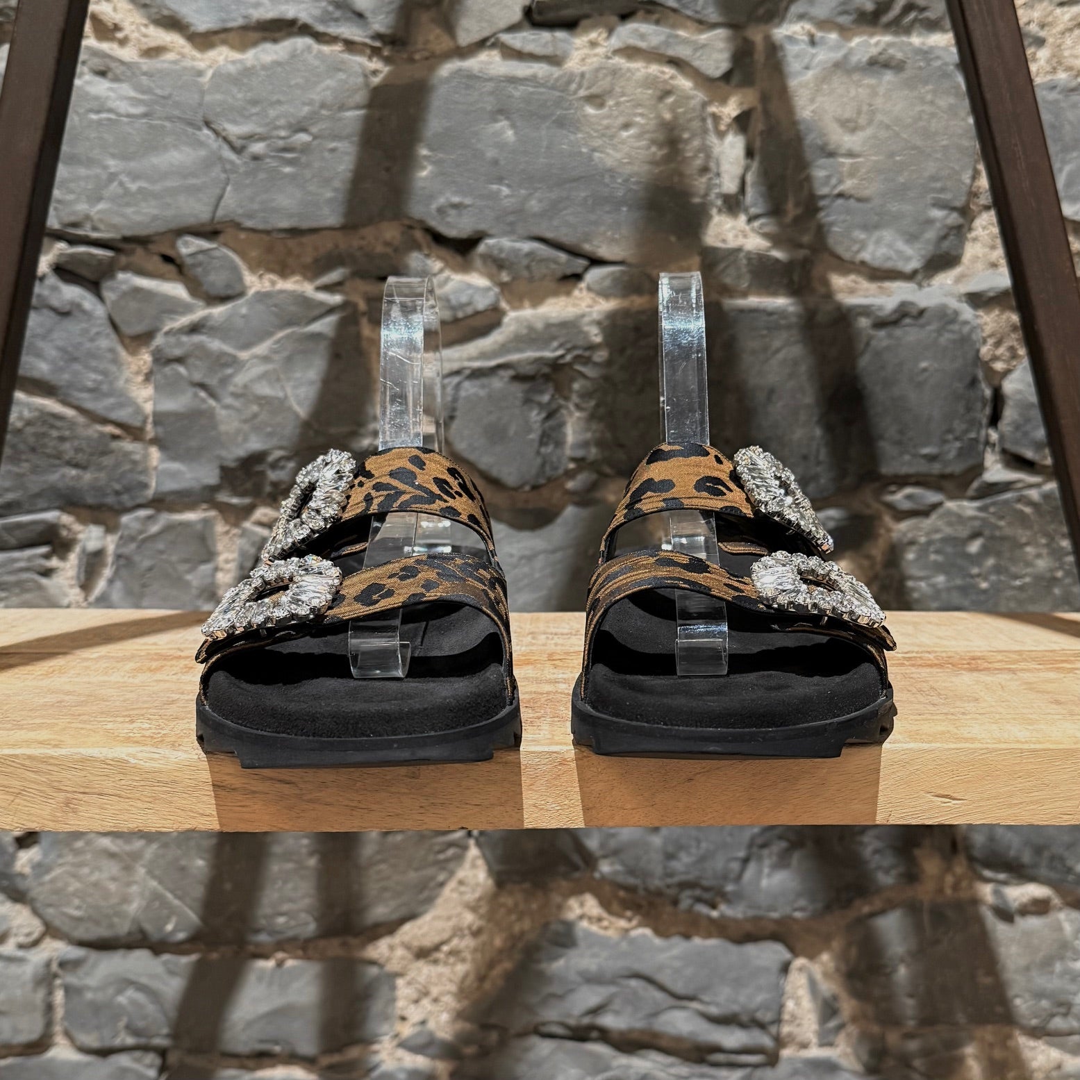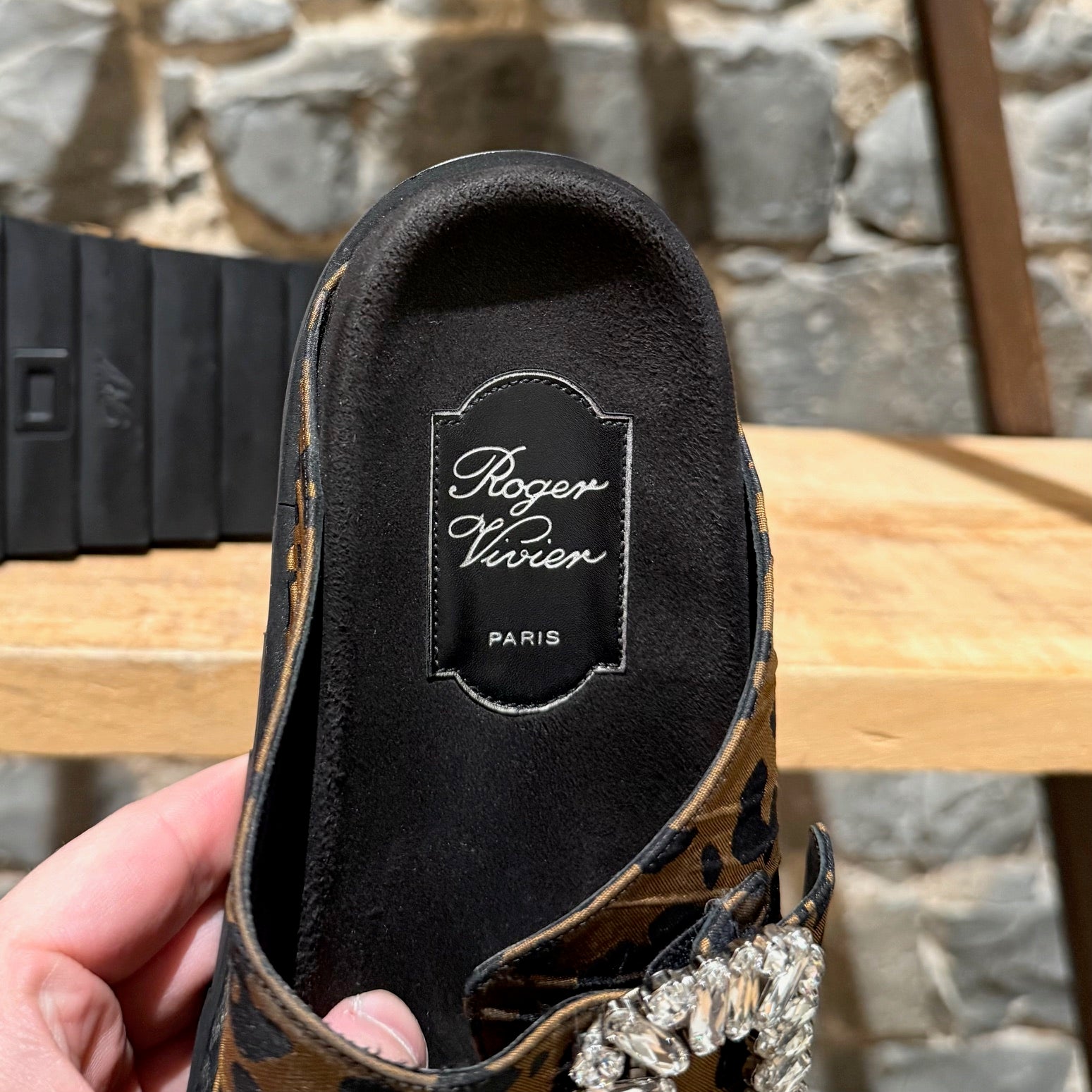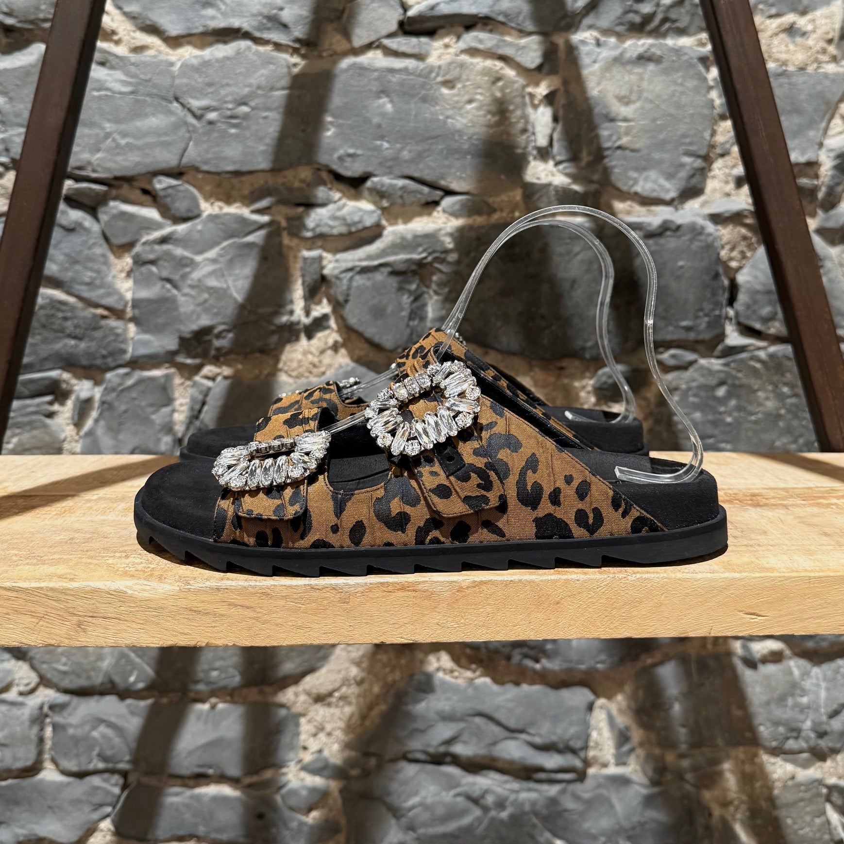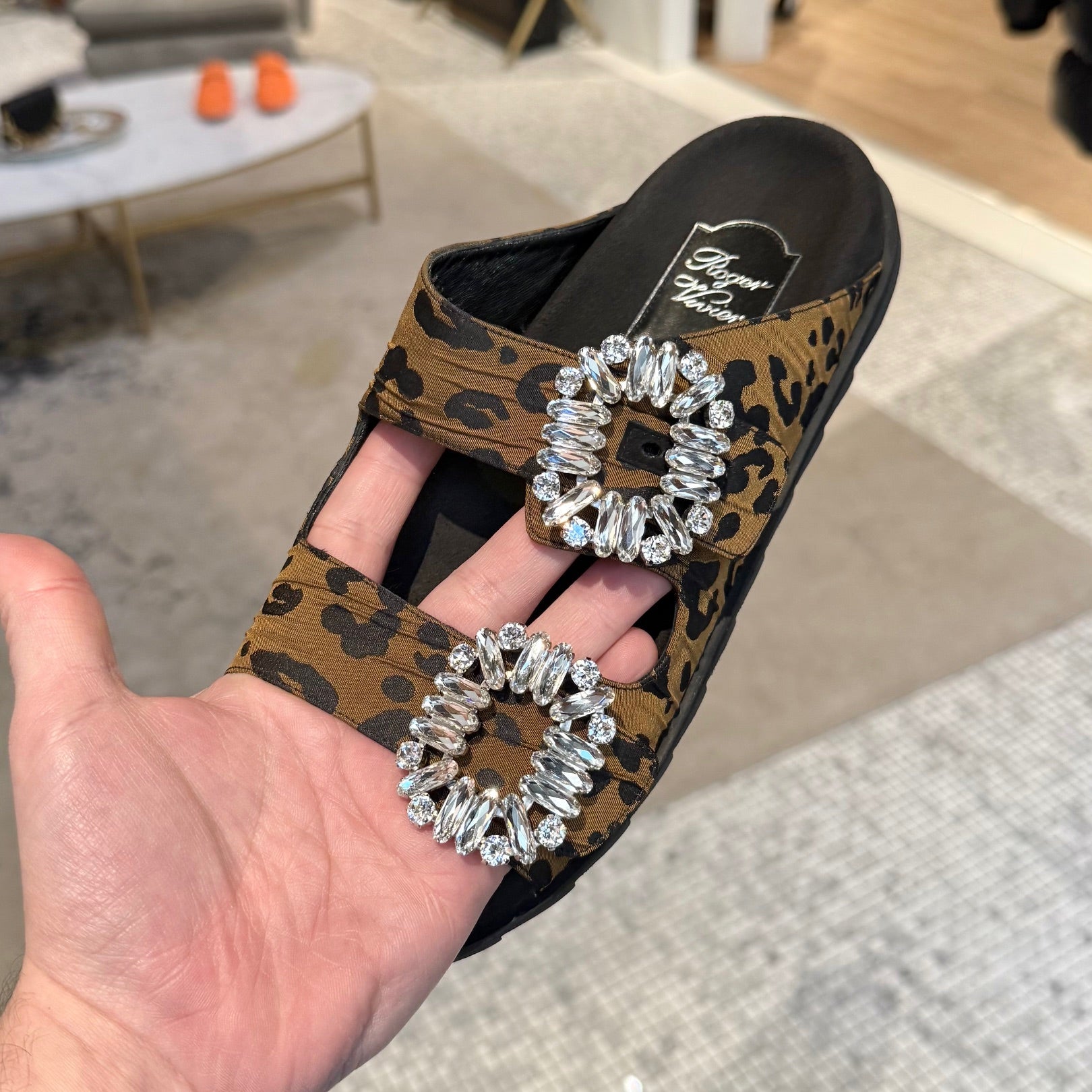 Open-toe slide design. Leopard print textile upper. Dual straps. Top strap is adjustable with peg and hole closure. Crystal-embellished square buckles. Black suede insole. Serrated rubber outsole embossed with RV signature. Made in Italy. Come as is.