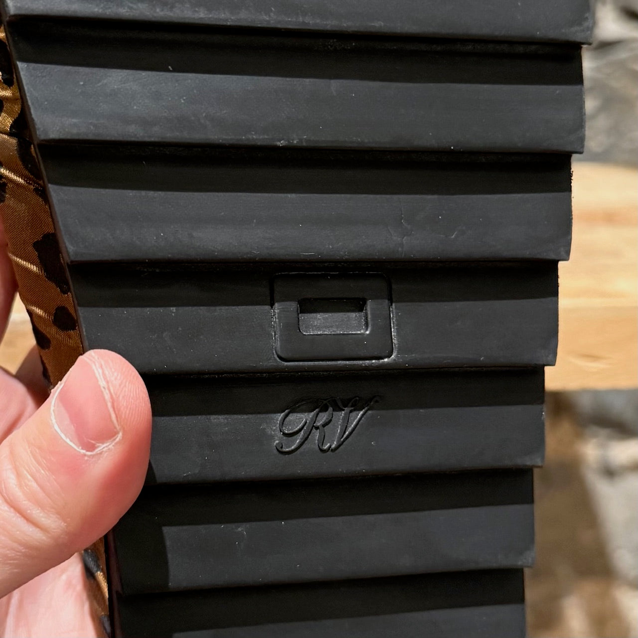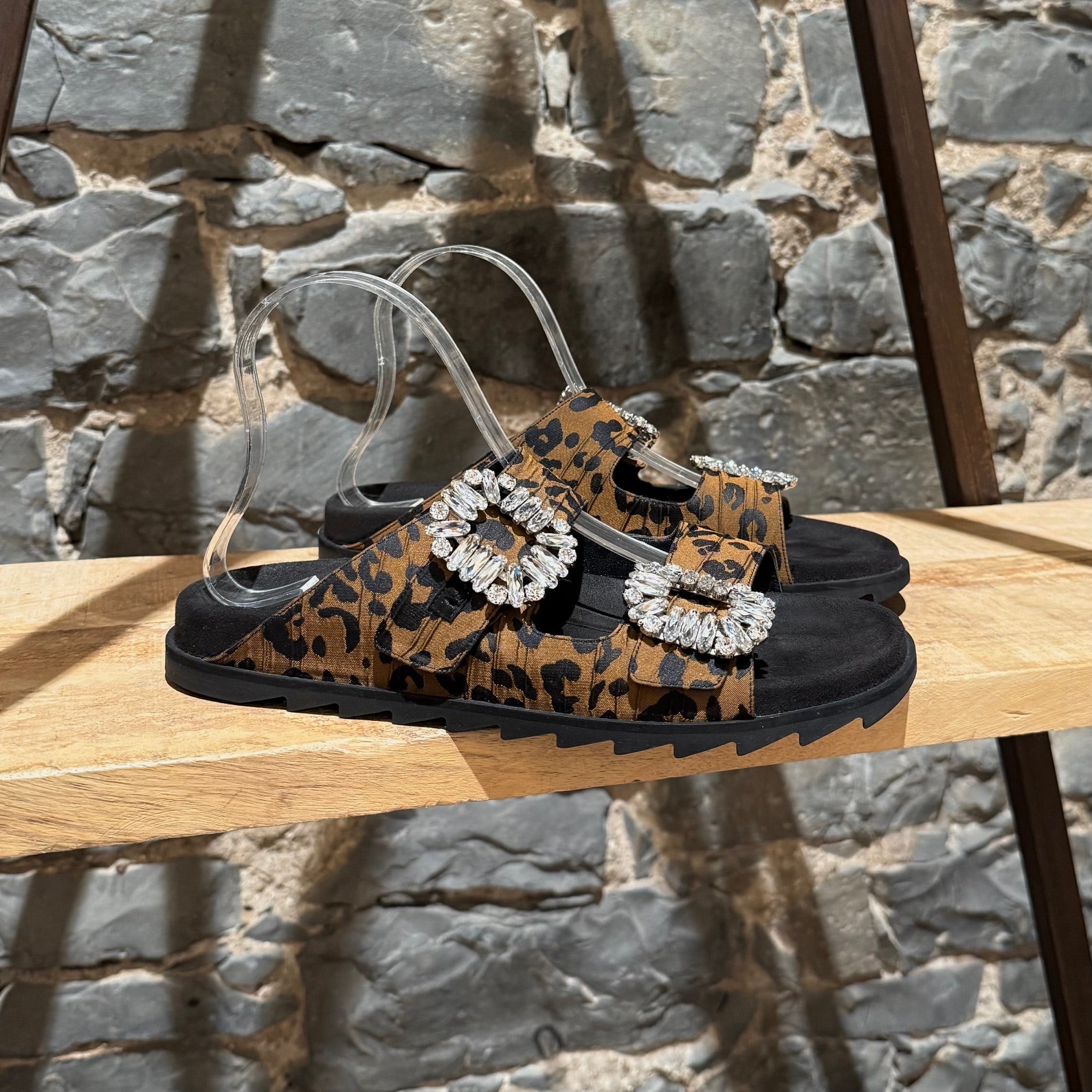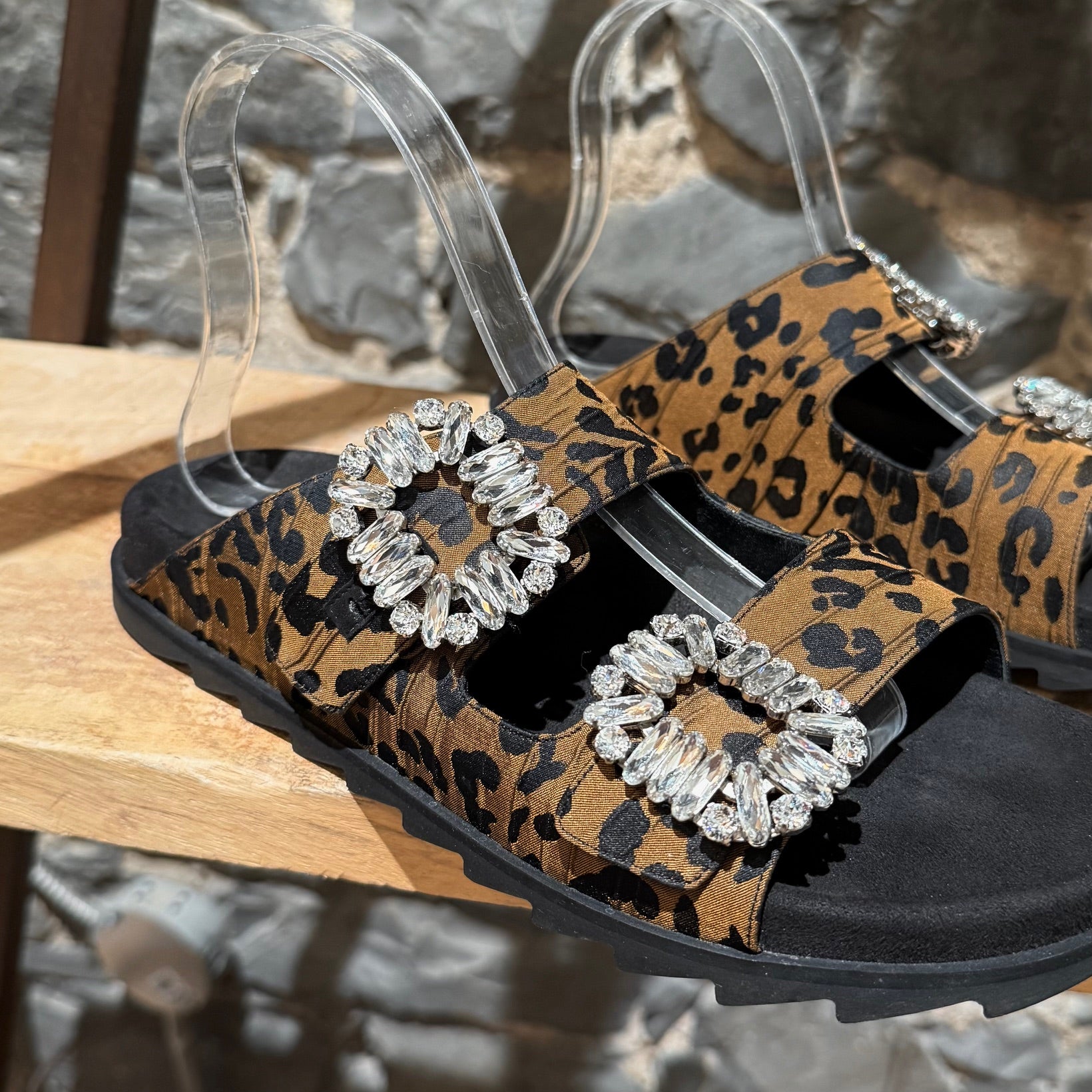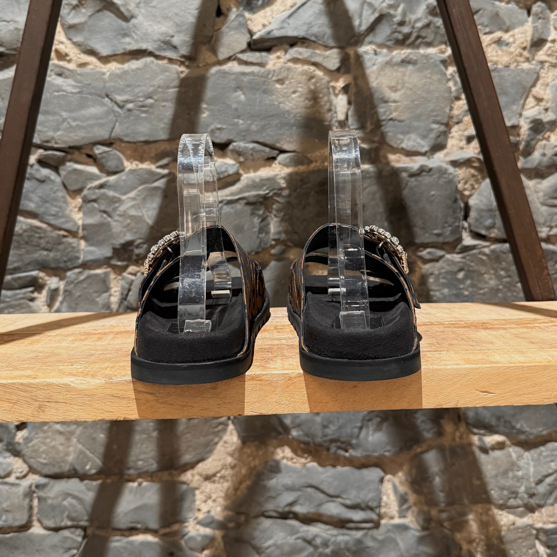 Open-toe slide design. Leopard print textile upper. Dual straps. Top strap is adjustable with peg and hole closure. Crystal-embellished square buckles. Black suede insole. Serrated rubber outsole embossed with RV signature. Made in Italy. Come as is.