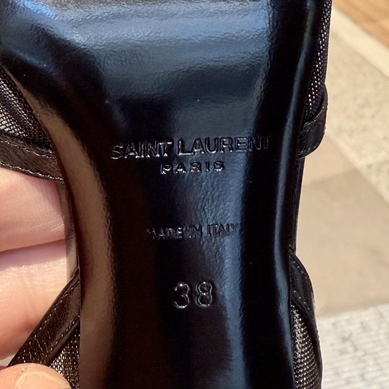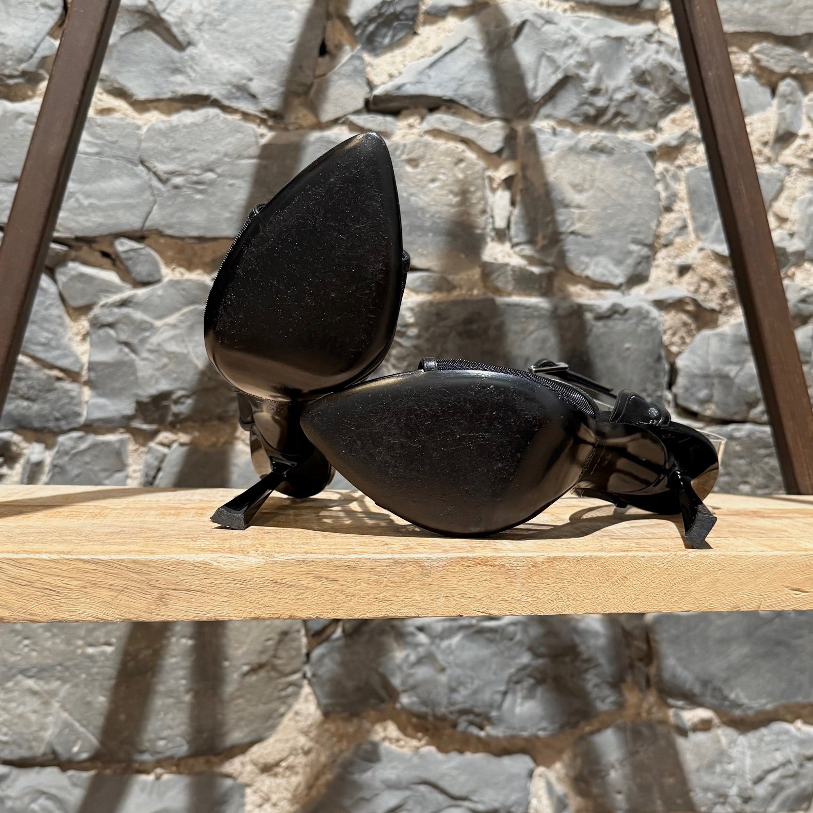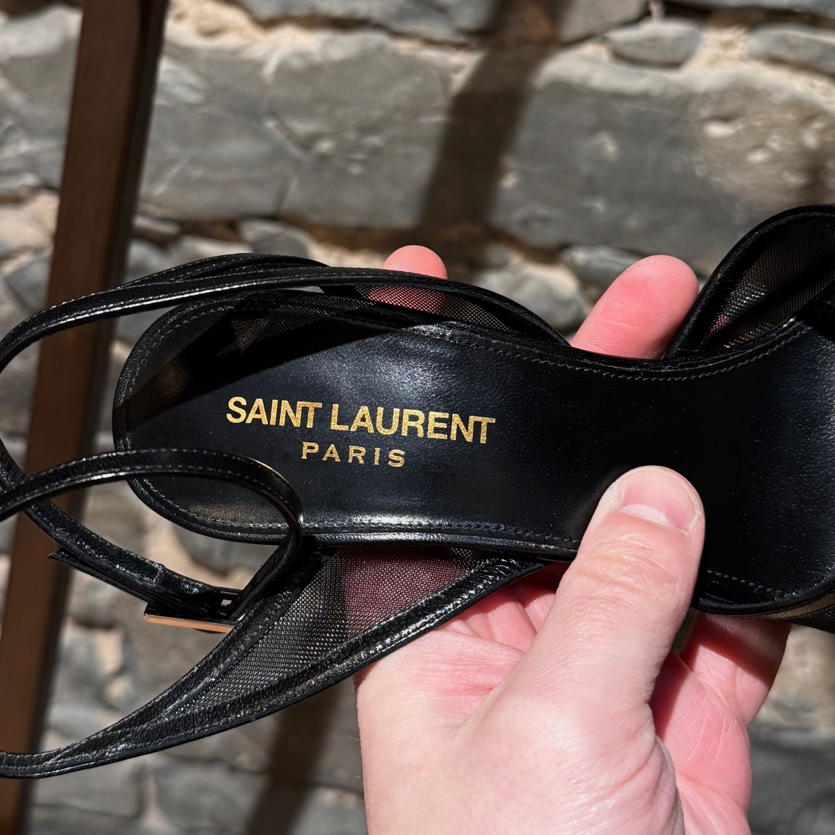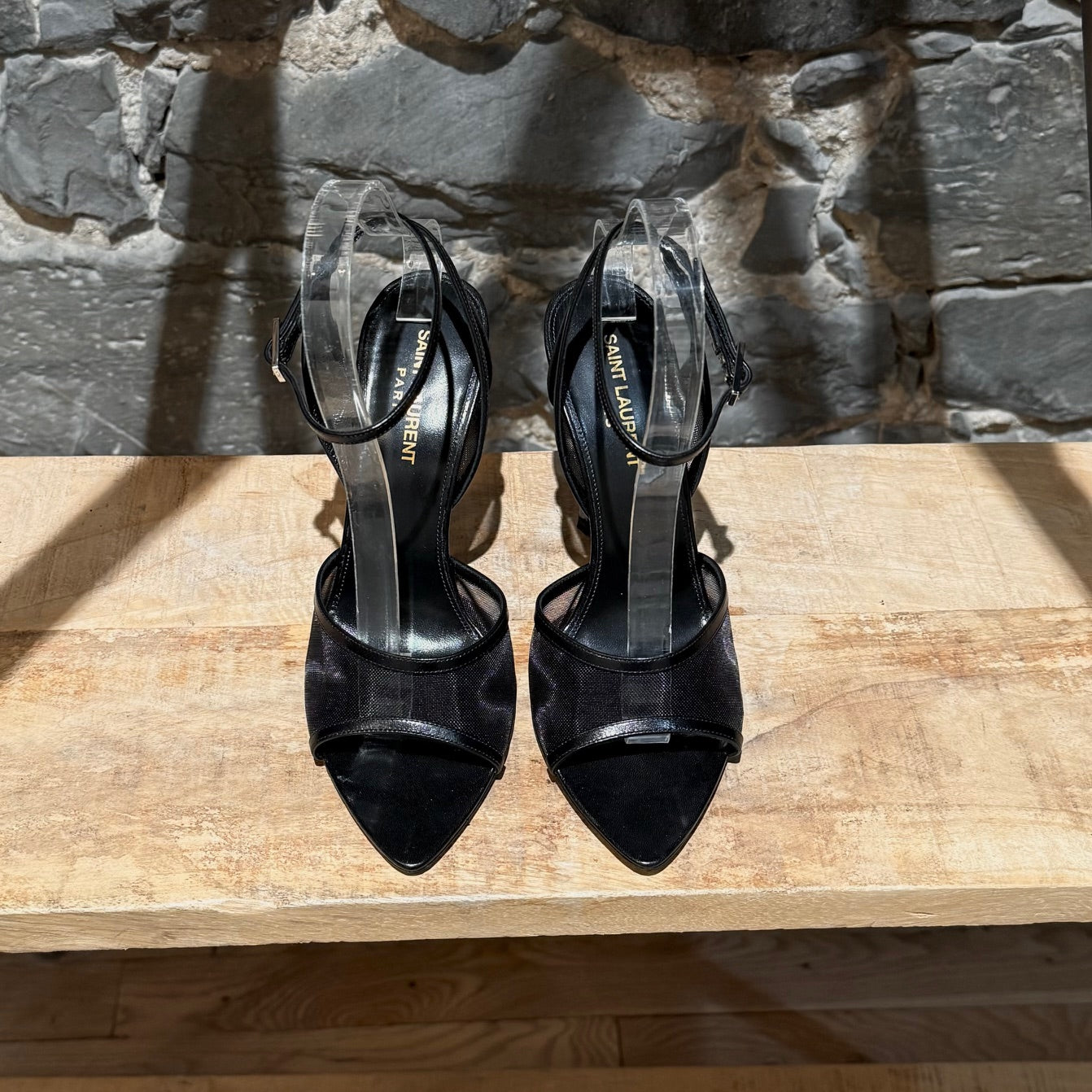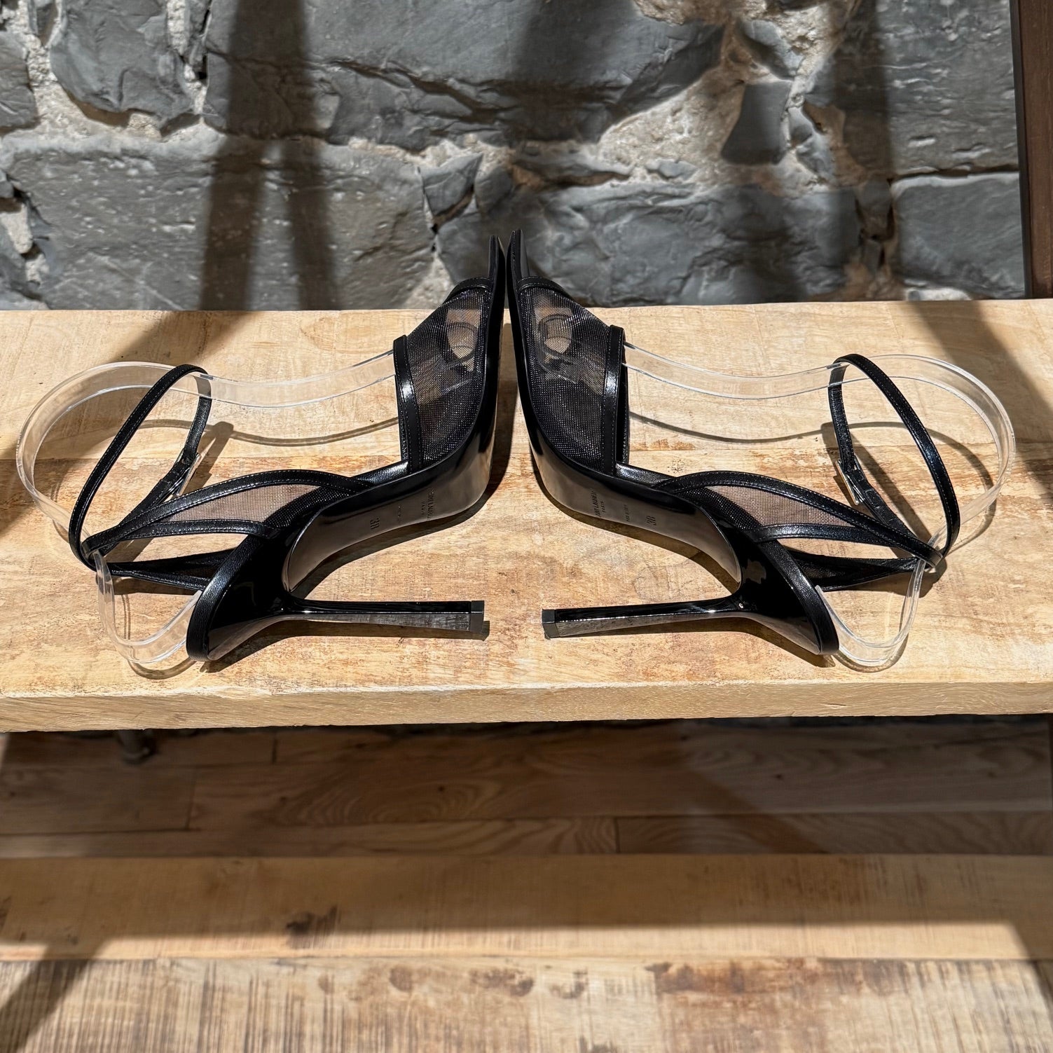 Pointed open-toe design. Sheer black sturdy mesh upper. Smooth leather trim and edges. Slim ankle strap with adjustable metal buckle closure. Cut-out sides. Lacquered high stiletto heel. Leather insole and outsole. Made in Italy. Come as is.
