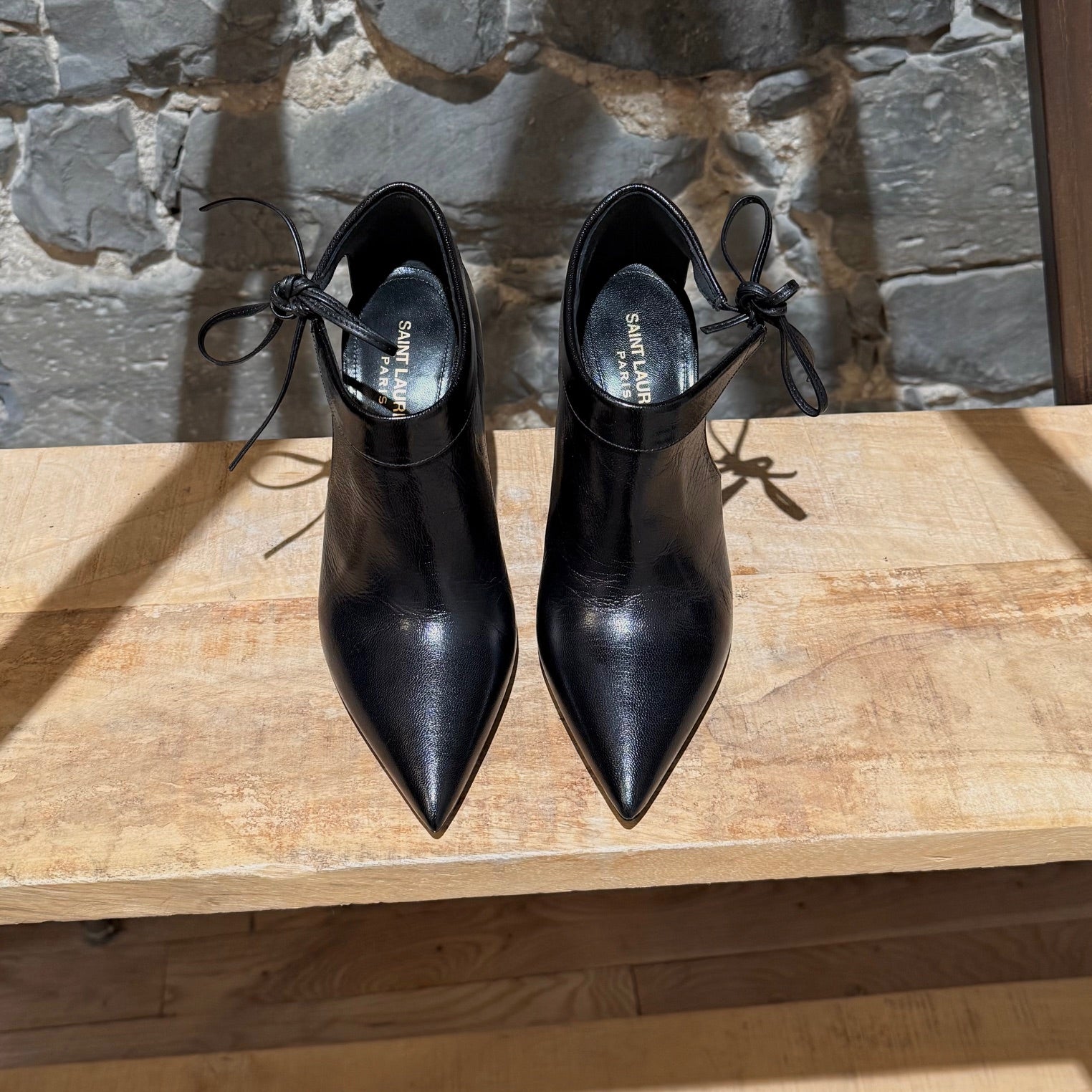 Side cut-out ankle bootie with pointed toe. Black glossy smooth leather. Slim stiletto heel. Knot tie ankle strap. Leather insole and outsole. Made in Italy. Come as is.