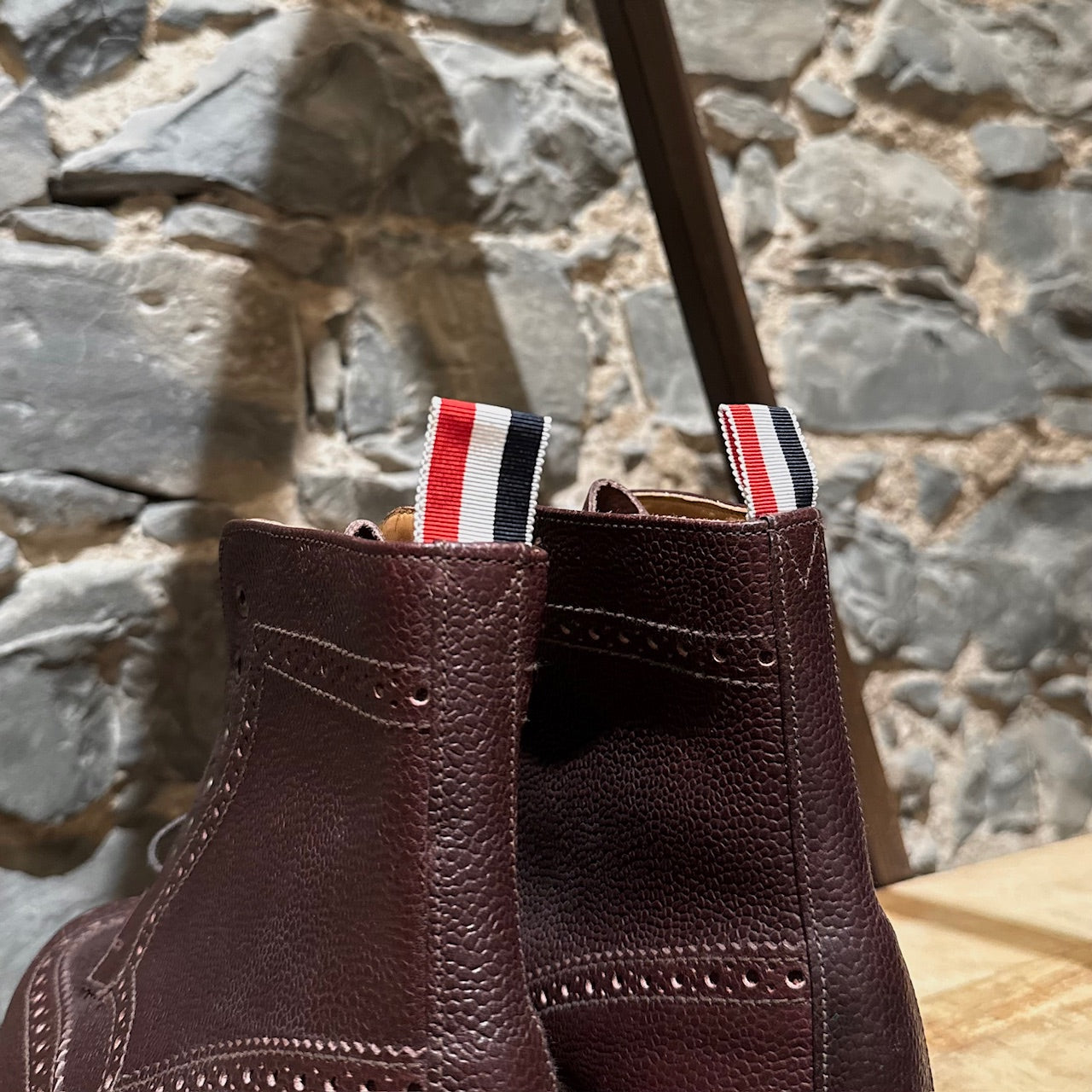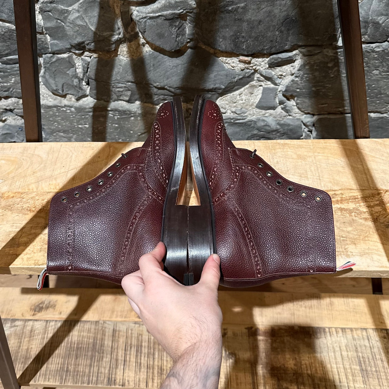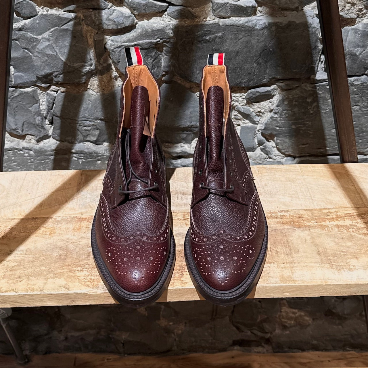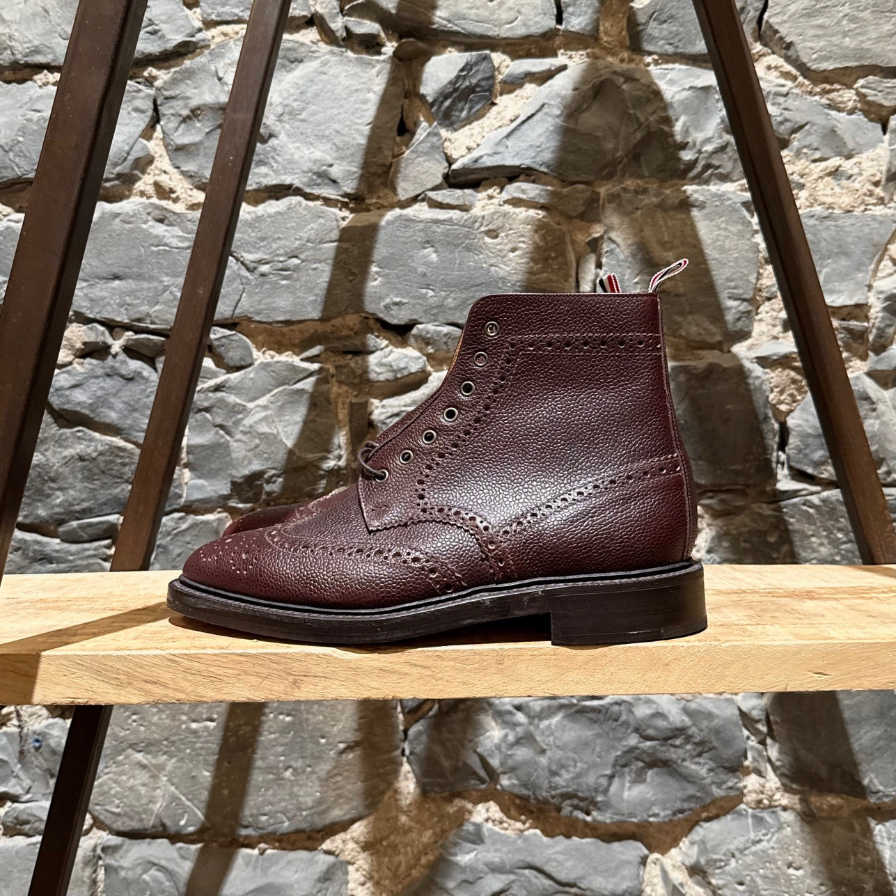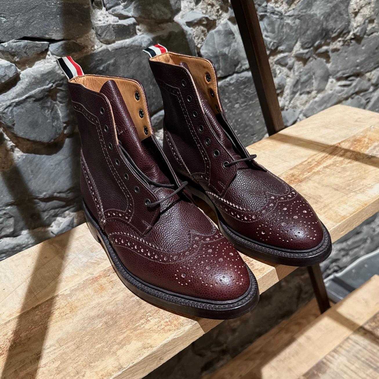 Burgundy pebbled leather with brogue detailing. Features traditional wingtip perforations and serrated edging. Lace-up and almond toe design. Signature tricolour grosgrain pull tab at the back. Tan leather lining and insole. Tan leather outsole with black rubber insert. Comes as is.