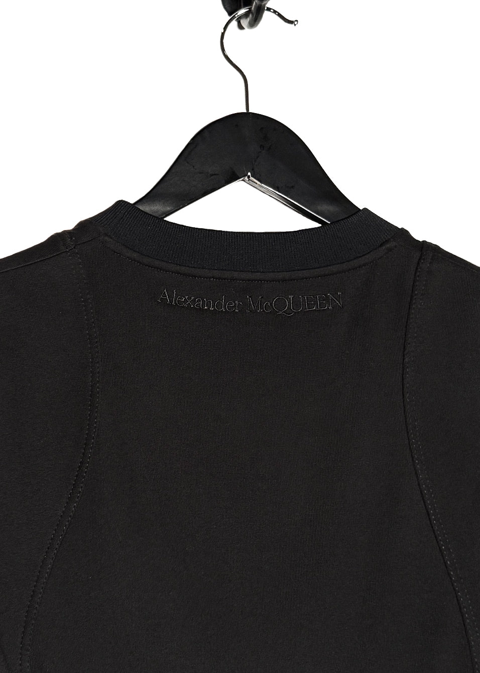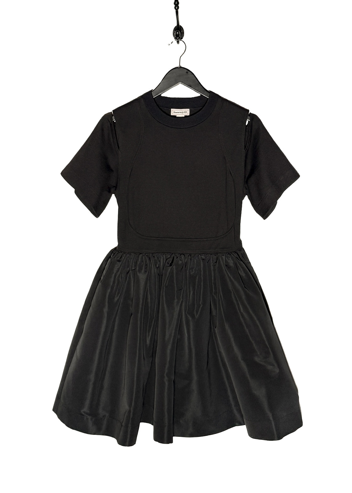 Panelled cotton jersey bodice features a crew neckline, short sleeves with subtle cut-out shoulders, and a fitted waist. The skirt contrasts in texture with lightweight taffeta, creating a voluminous gathered and flared silhouette. Hidden side zip closure and functional side pockets. Embroidered tonal Alexander McQueen logo at the back neckline. Made in Italy.