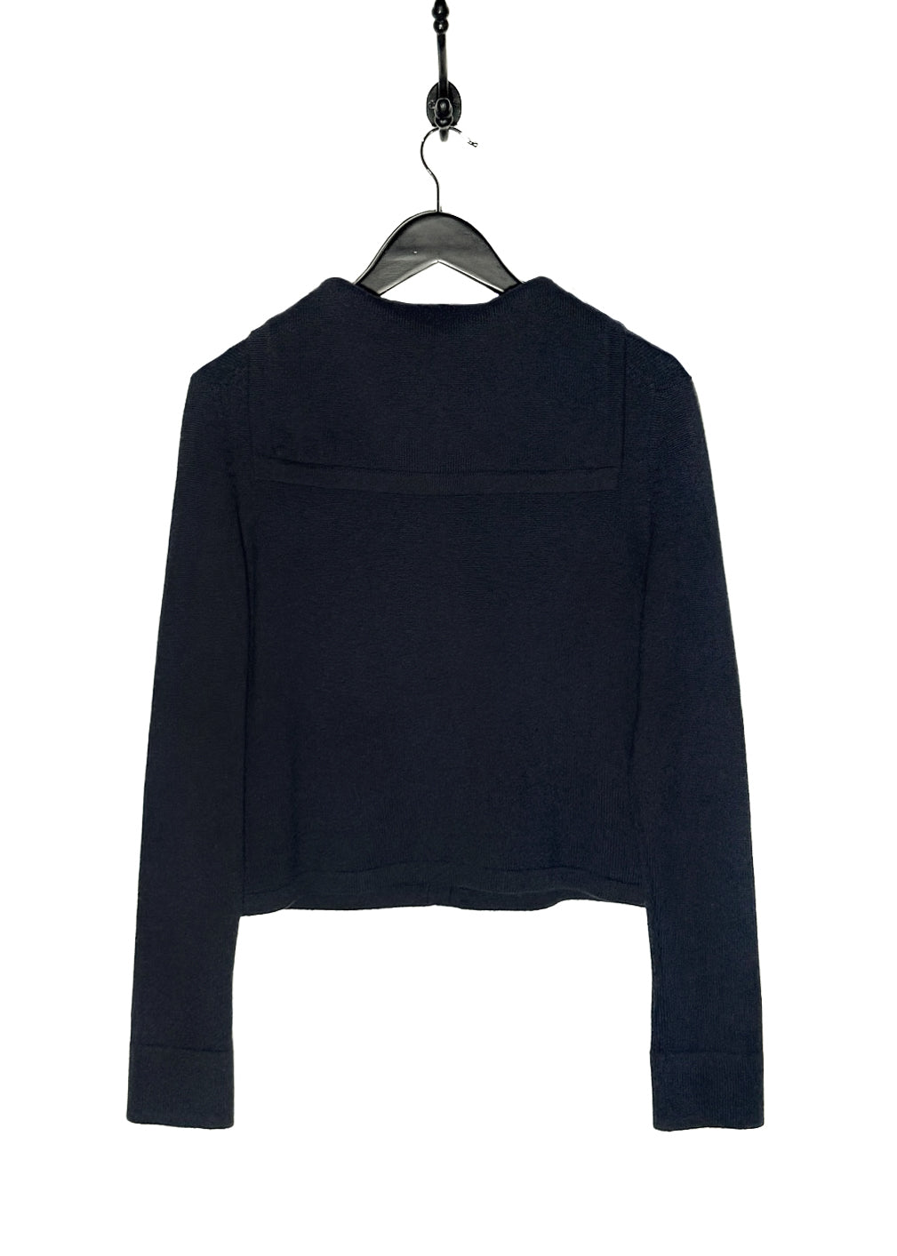 From the 2018 collection. Cropped silhouette with sailor-style collar. Button-down front with textured anchor-engraved metal buttons. Two (2) front chest pockets with buttoned flaps. Long sleeves with extended cuffs. Ribbed trims. Made in United Kingdom.