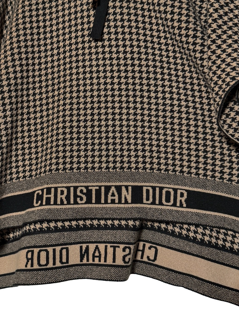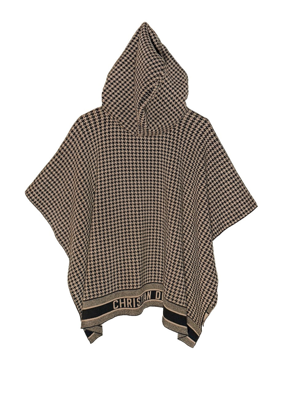 Beige and black all-over houndstooth pattern in soft cashmere blend. Wide poncho silhouette with attached hood. Pull-over design. Black knit ribbon tie closure at neckline. Ribbed finishing at neckline and edges. Border detail woven with "CHRISTIAN DIOR" logo bands at front and back in contrasting black and beige. Made in Italy.