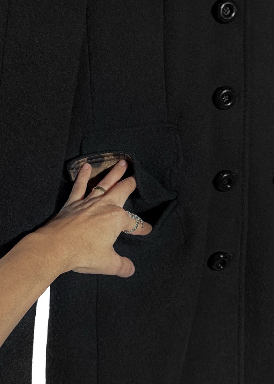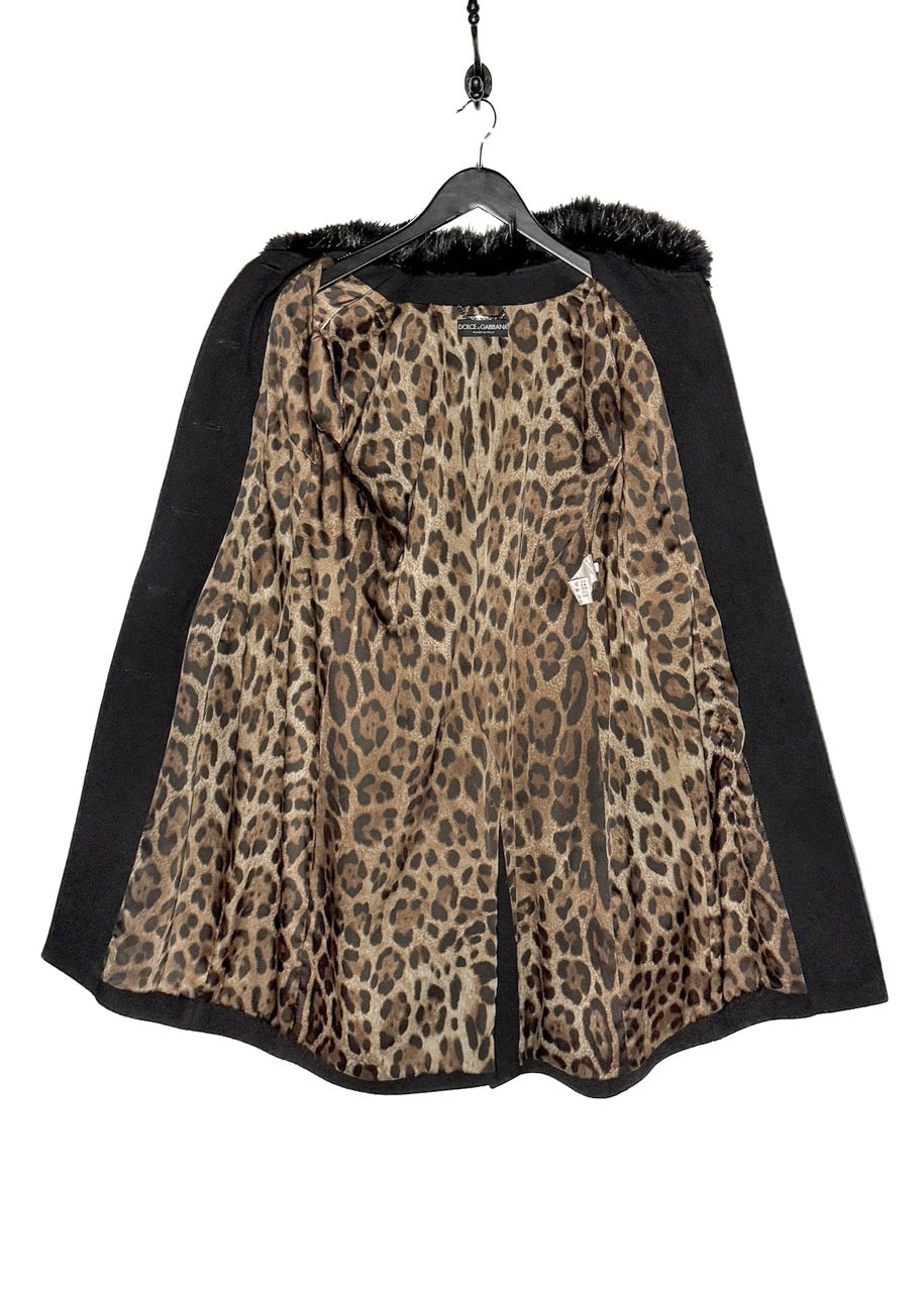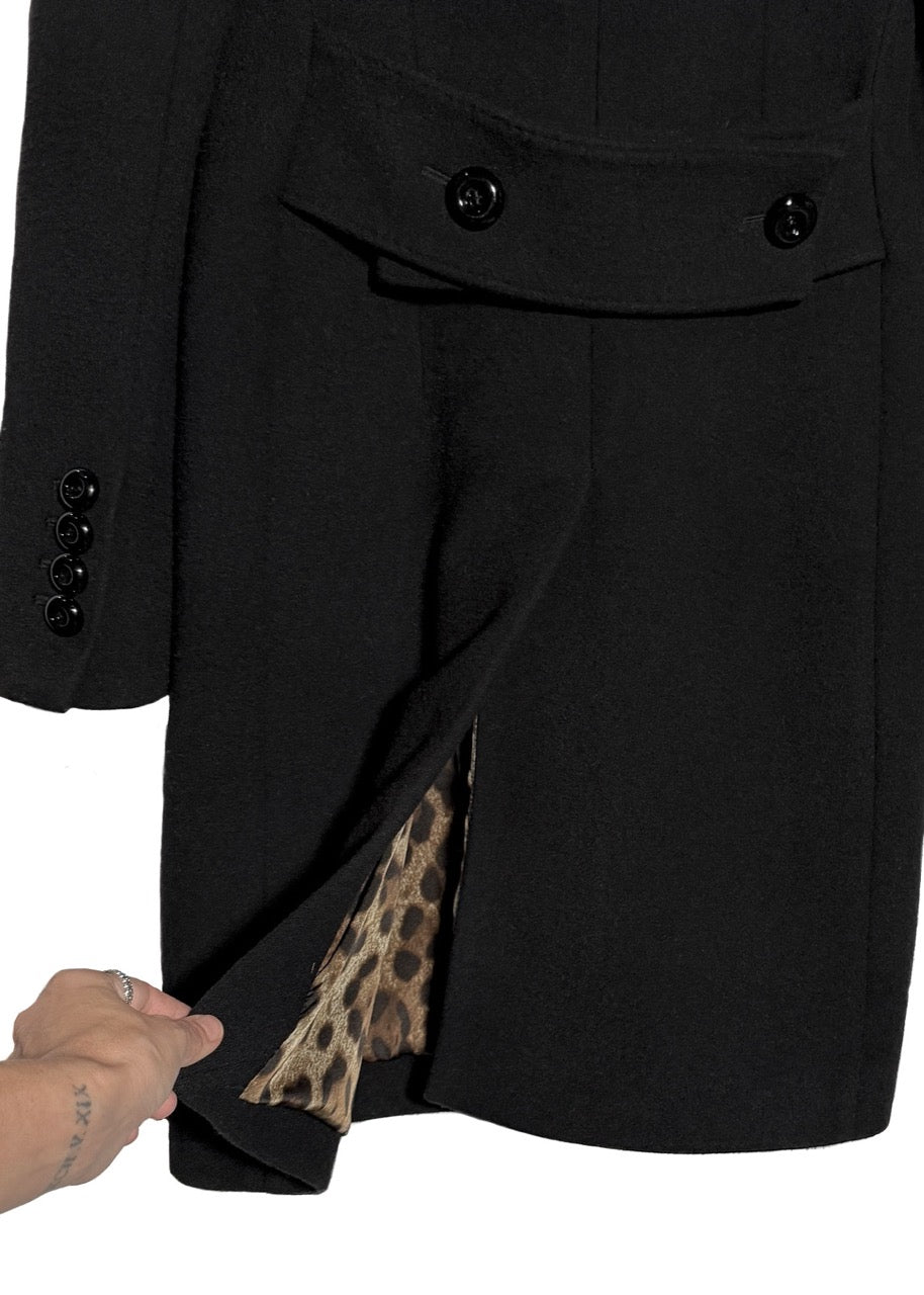 Tailored knee-length coat made in a structured virgin wool blend. Features a genuine wide notched beaver fur collar, front branded button closure, flap pockets, and four-button cuffs. Interior and inner pockets are fully lined in the brand’s signature leopard-print satin. Rear belt detail with button accents and single vent opening. Made in Italy.