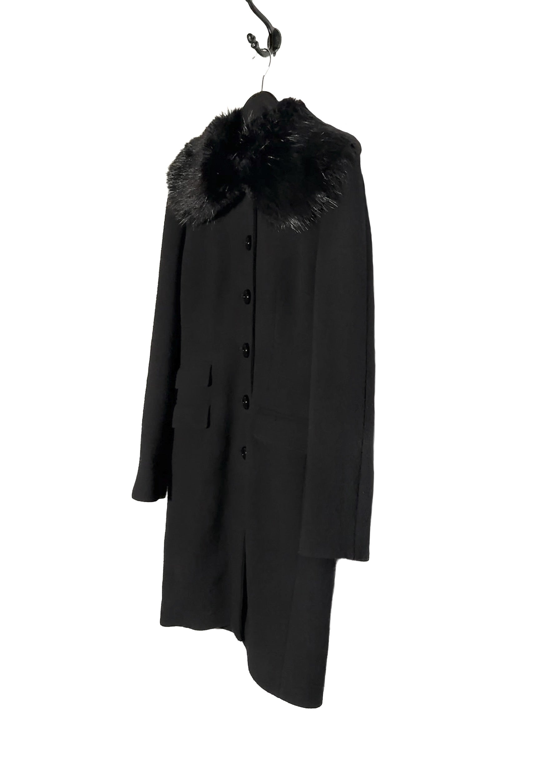 The fur collar is not originally designed to be removable but is stitched in a way that allows it to be carefully unstitched if desired and restitched later without altering the coat’s construction. It gives the option to wear the coat with or without the fur.