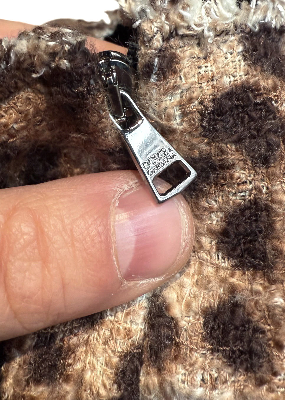 Textured cotton-blend tweed with allover leopard print. Sleeveless. Round neckline. Two (2) front patch pockets. Shift silhouette. Raw-edges. Back zipper closure with Dolce & Gabbana branded pull. Black silk satin lining. Made in Italy.