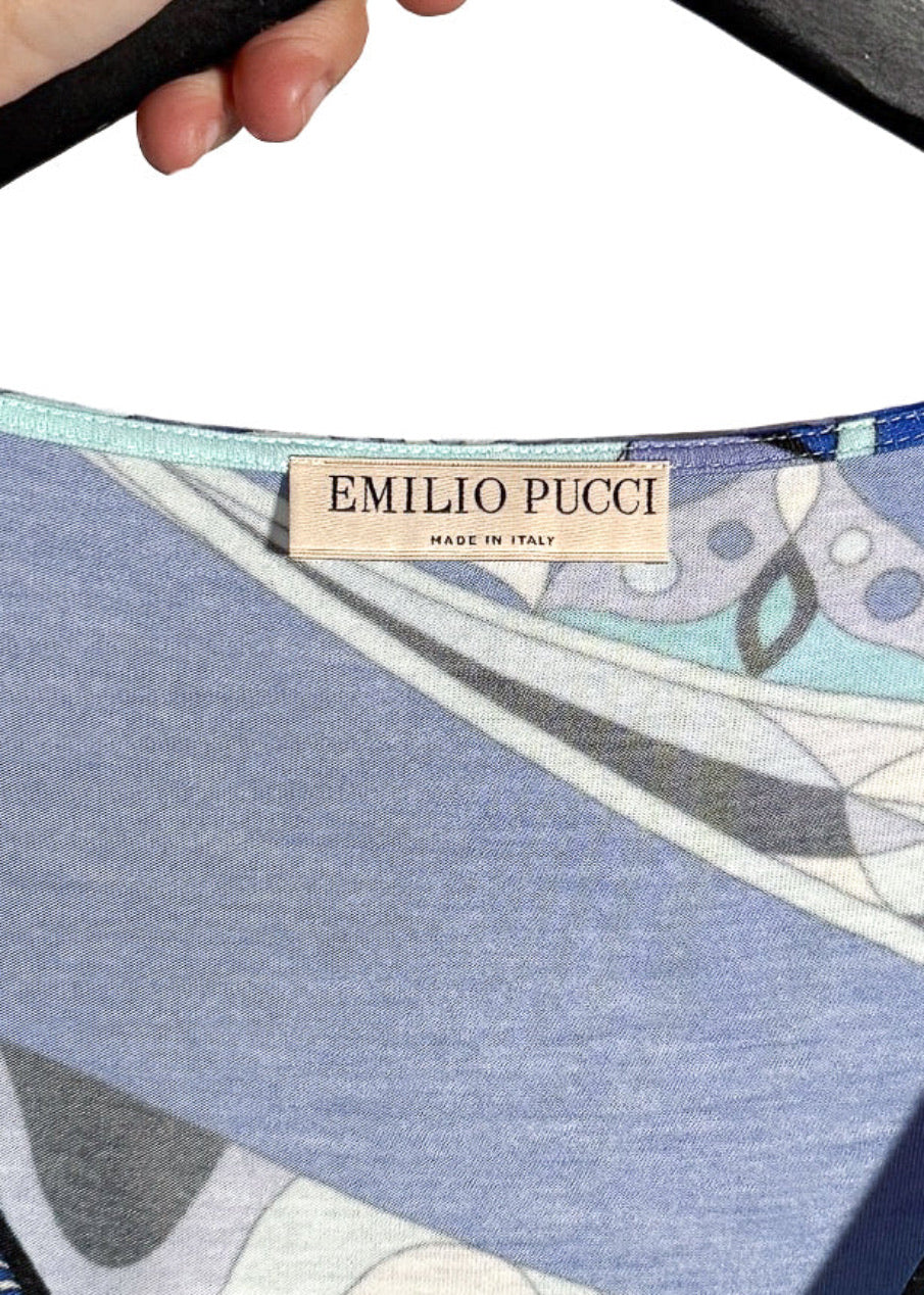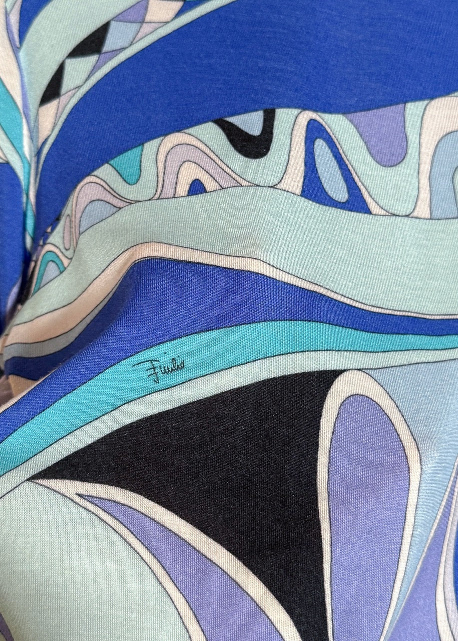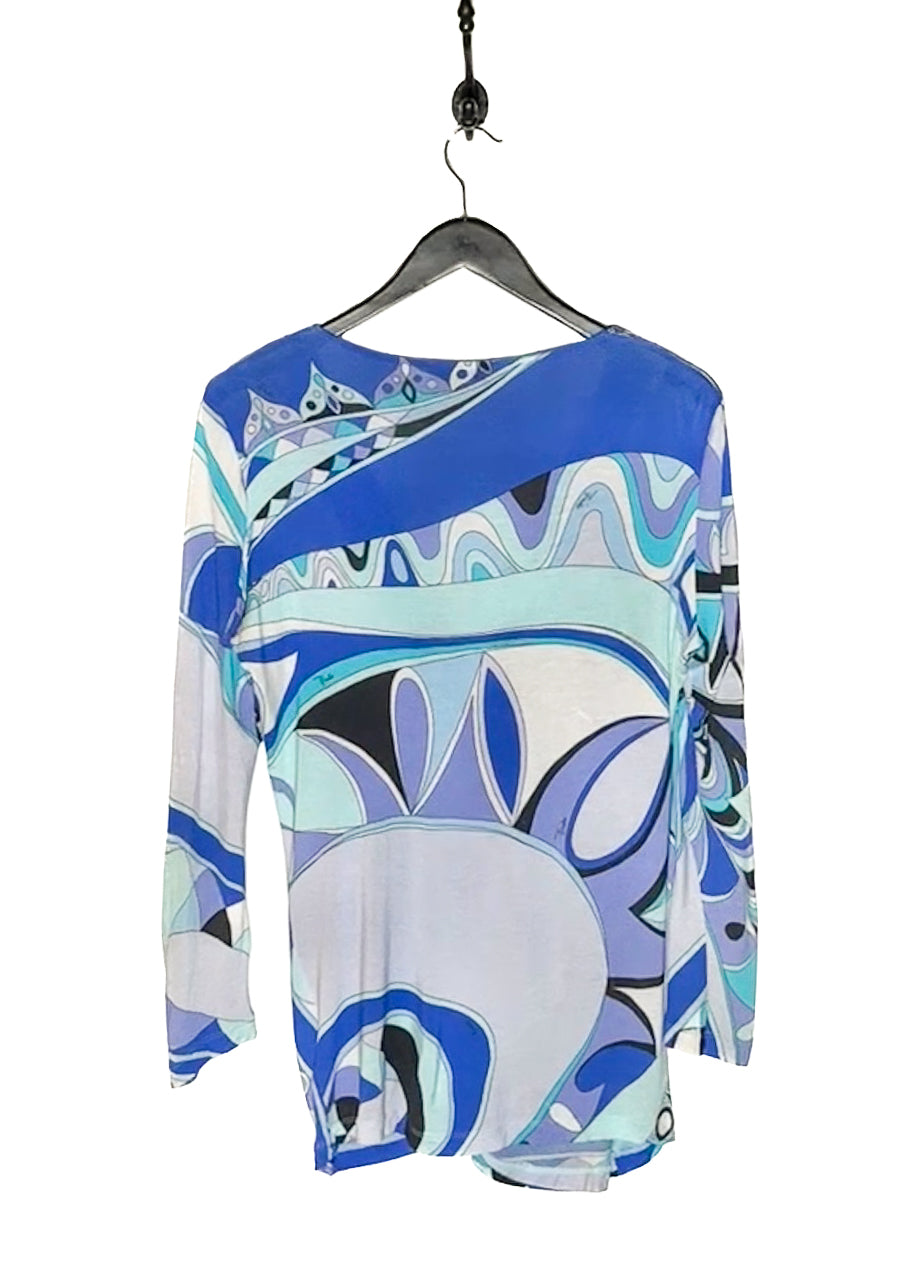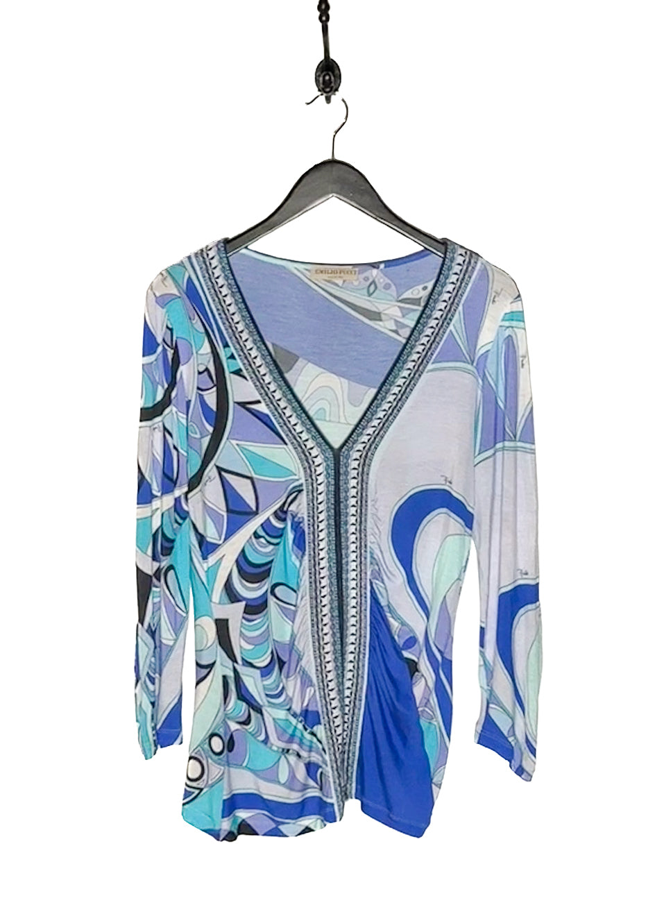 Lightweight fluid stretch fabric design with signature Pucci abstract print in blue, turquoise, lavender, and white tones. V-neckline with printed trim detail. Ruched gathering at front. Three-quarter sleeves. Emilio Pucci signature integrated within print. Slim fit. Made in Italy.
