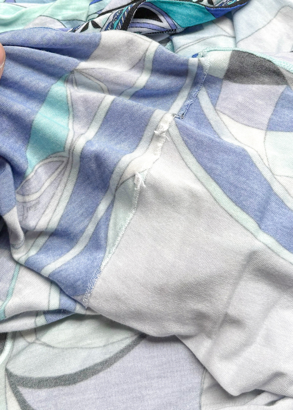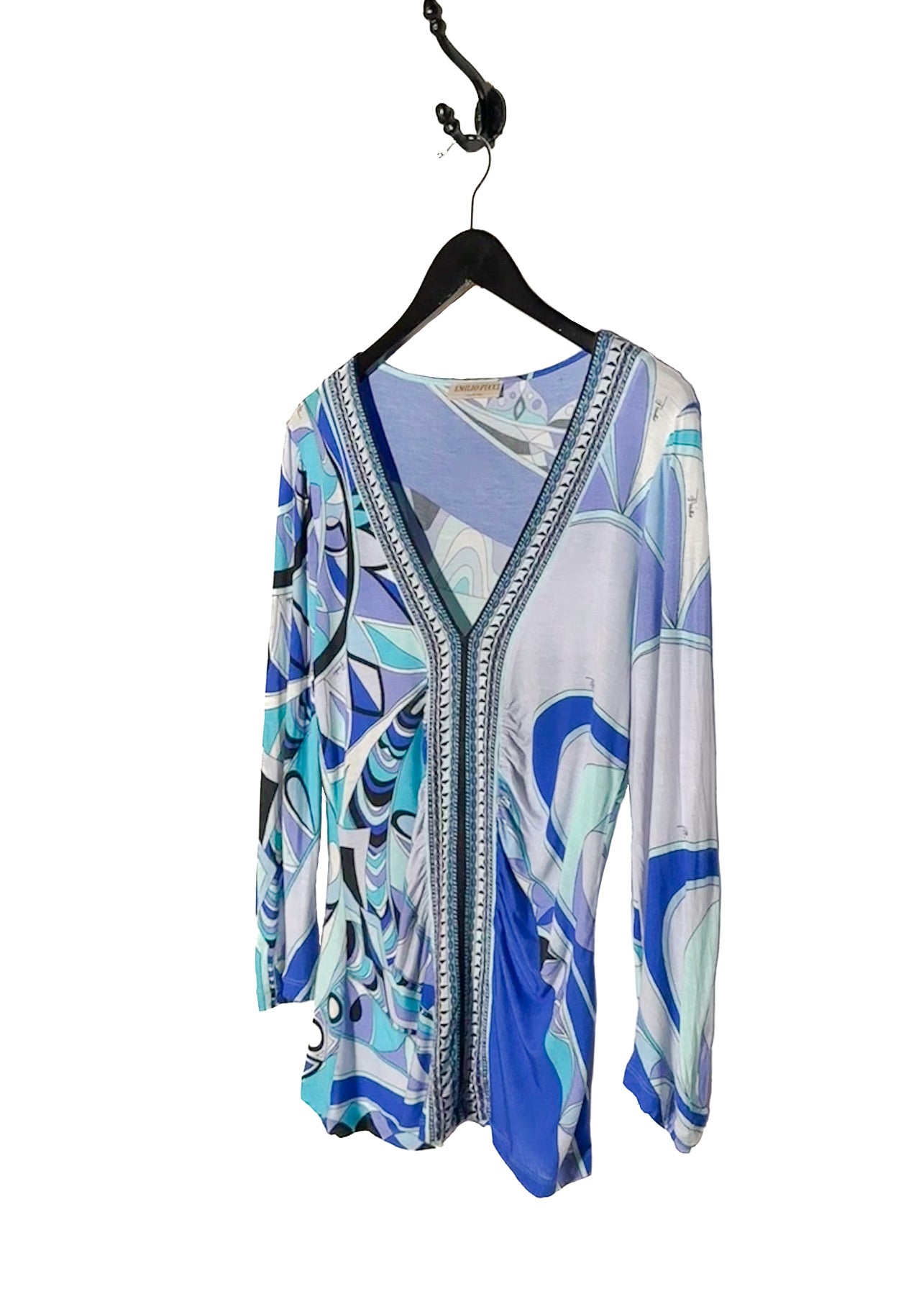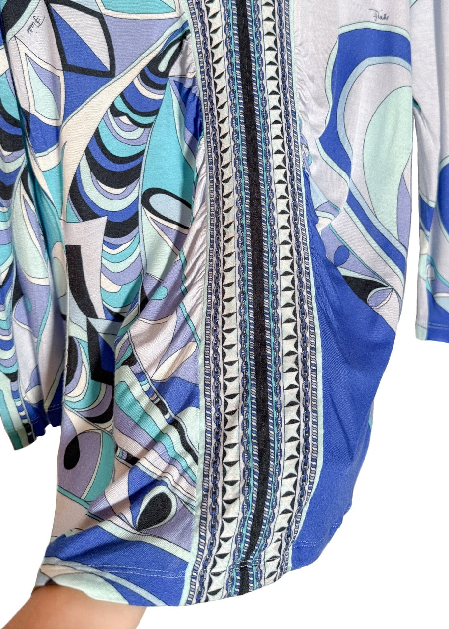 Lightweight fluid stretch fabric design with signature Pucci abstract print in blue, turquoise, lavender, and white tones. V-neckline with printed trim detail. Ruched gathering at front. Three-quarter sleeves. Emilio Pucci signature integrated within print. Slim fit. Made in Italy.