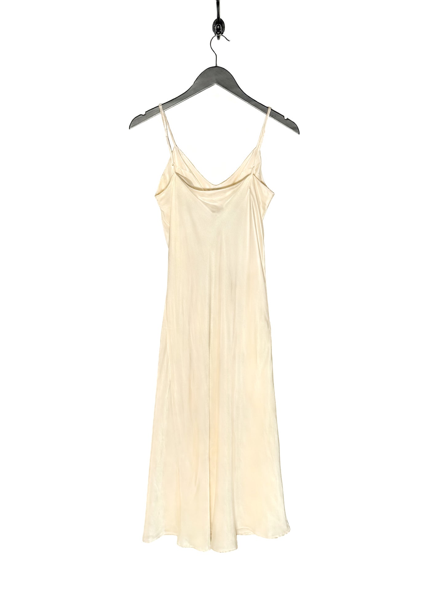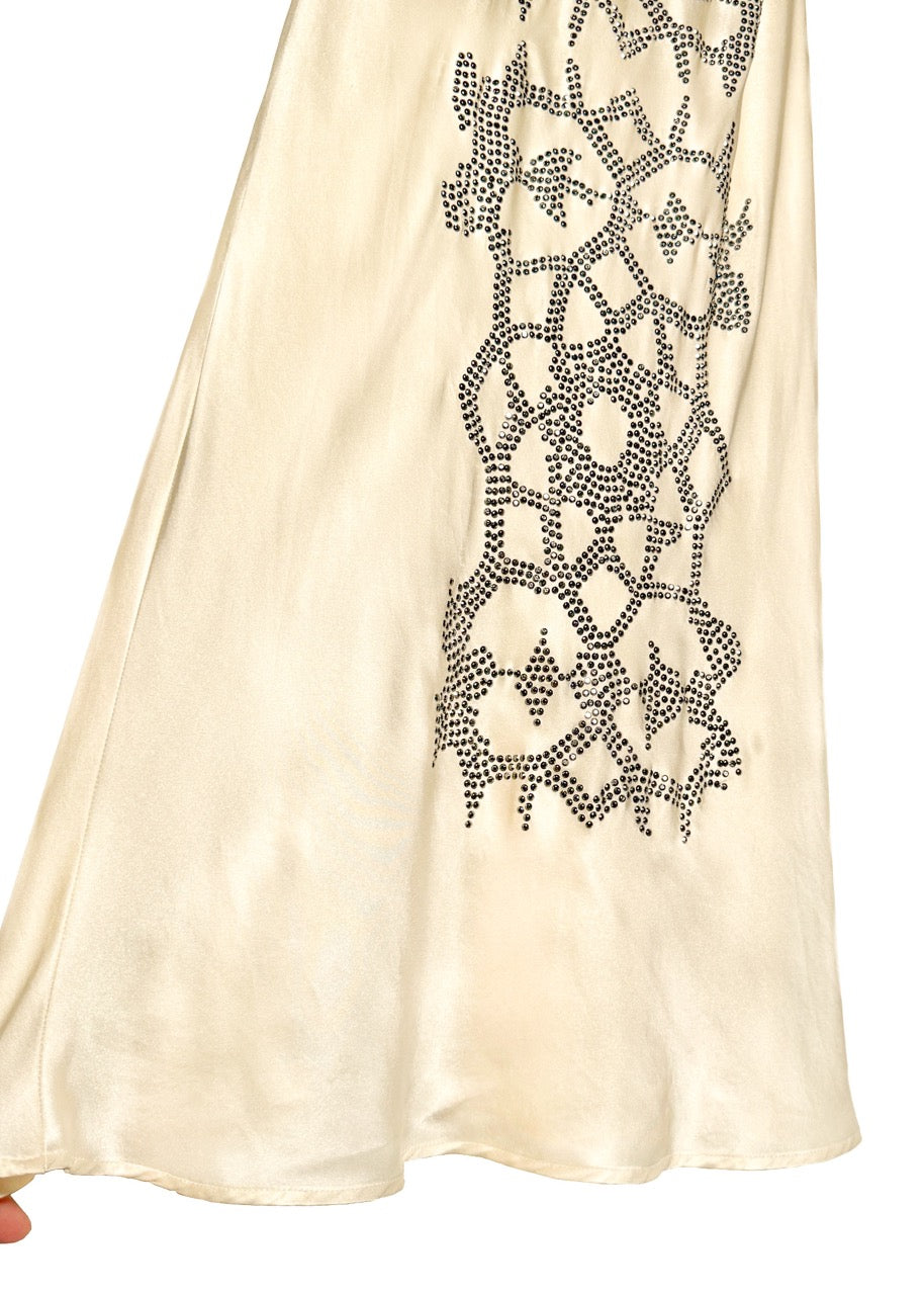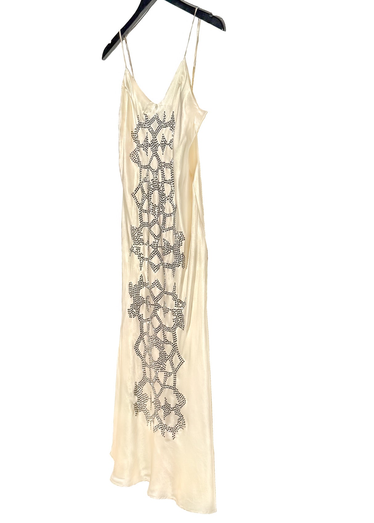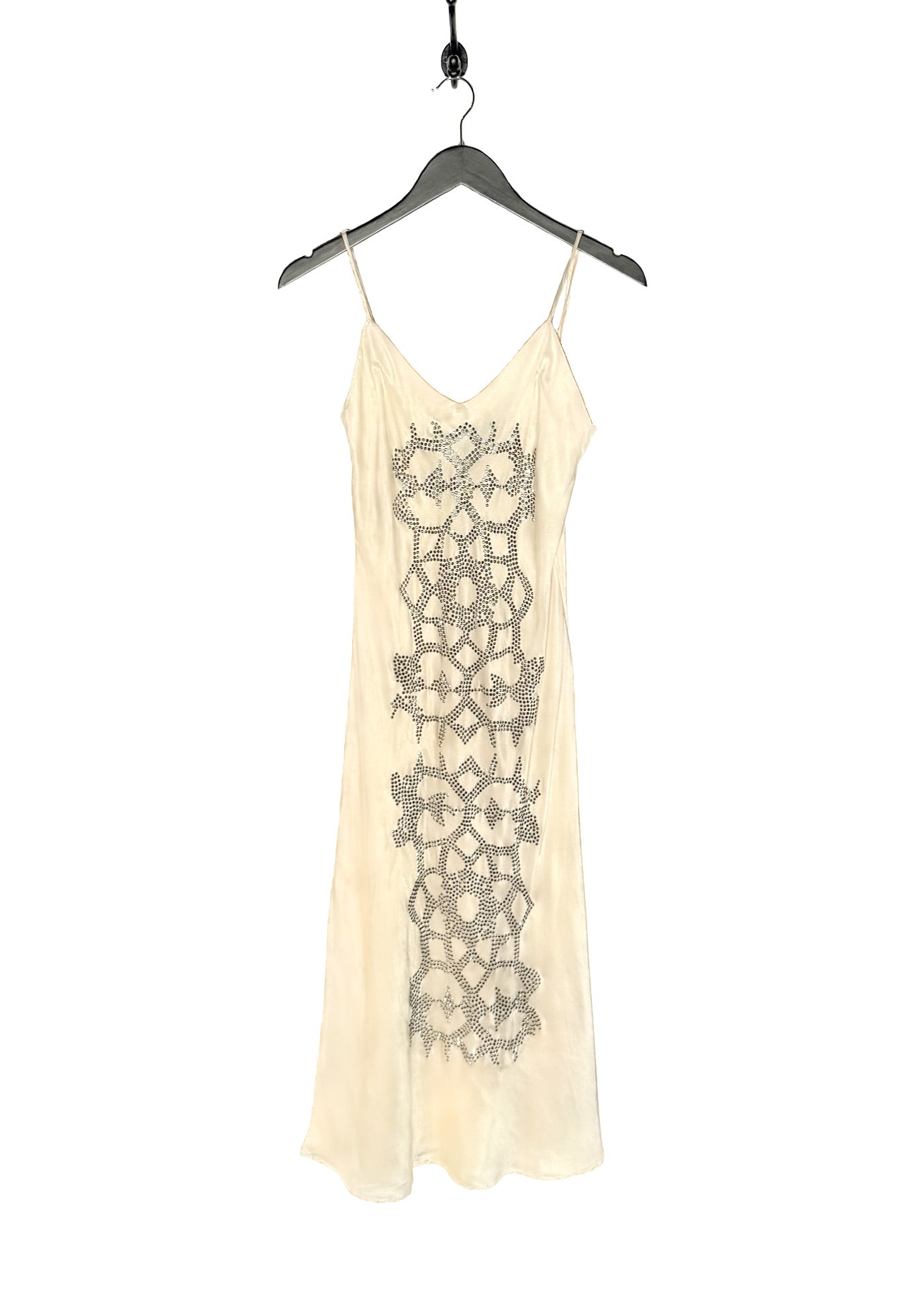 Fluid midi-length stretch satin slip-on design. Soft sheen. V-neckline. Slim adjustable shoulder straps. Straight cut. Subtle flared hem. Front micro-stud geometric motif. Unlined. Made in USA.