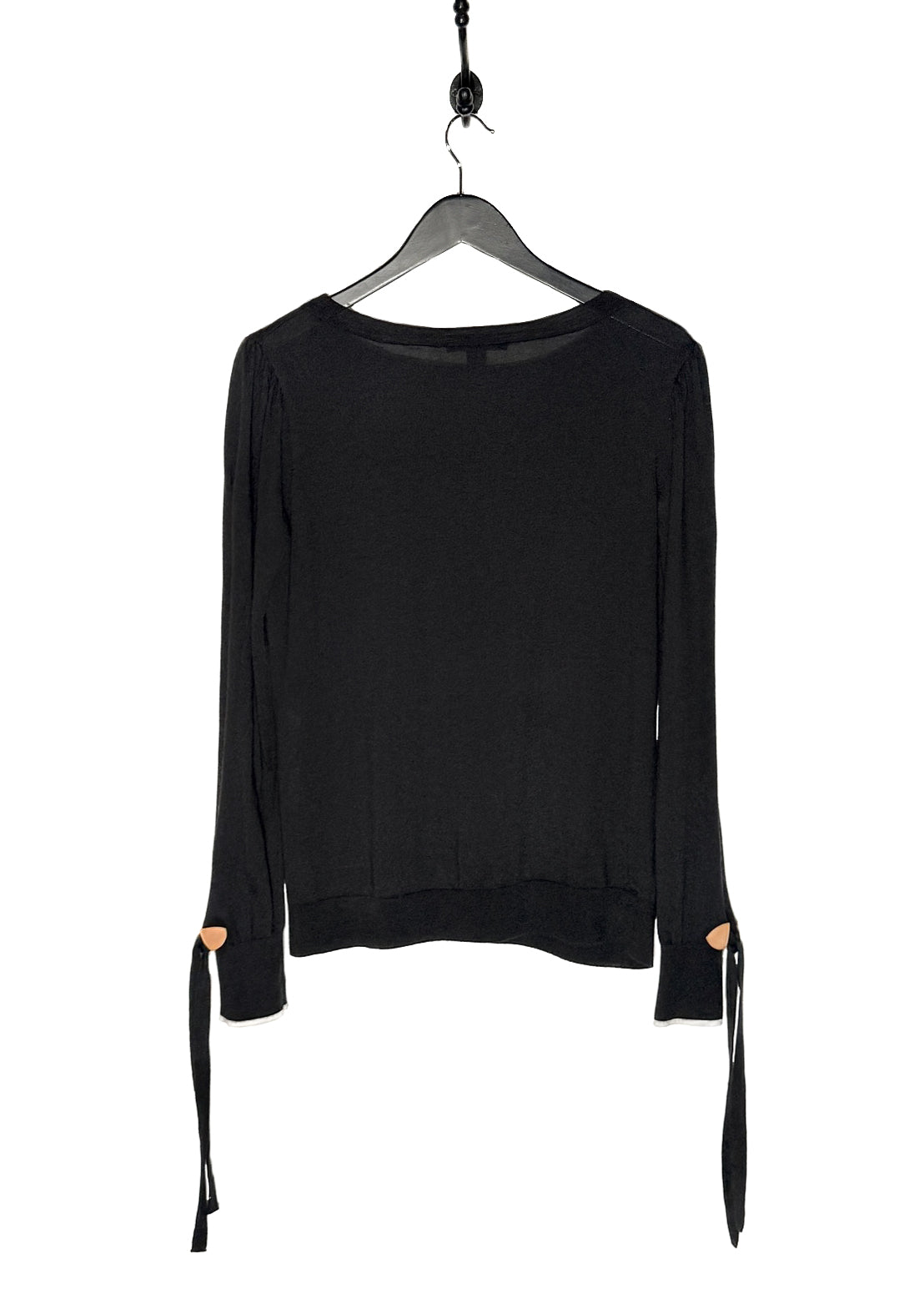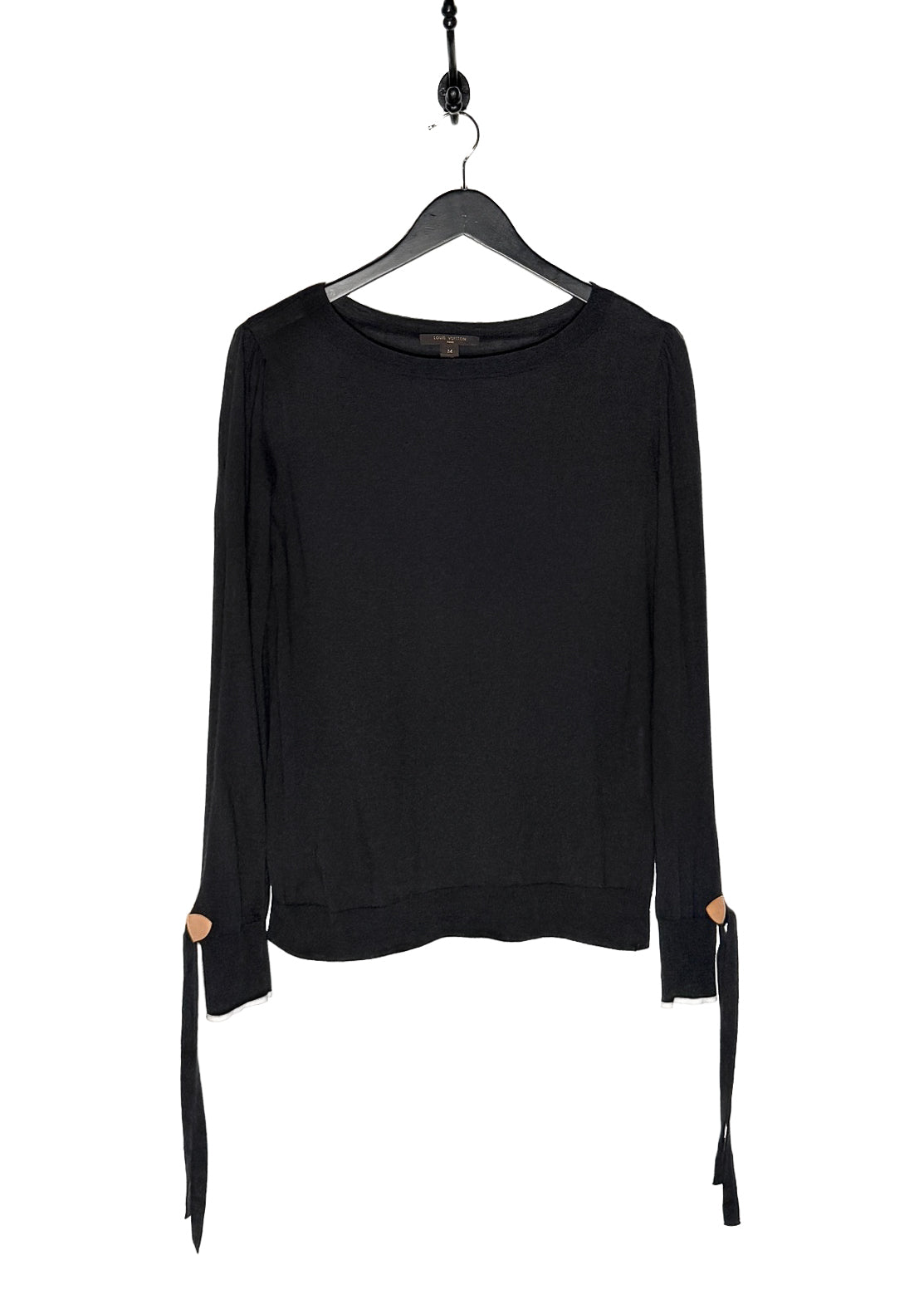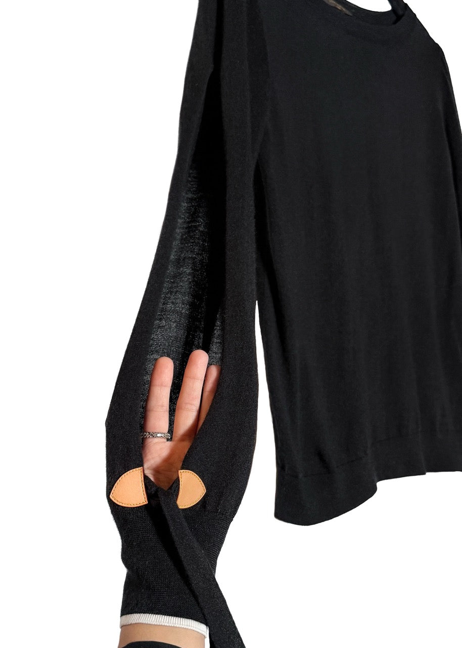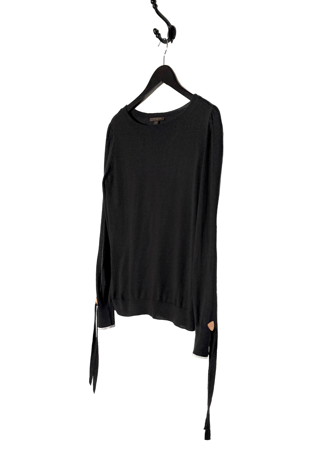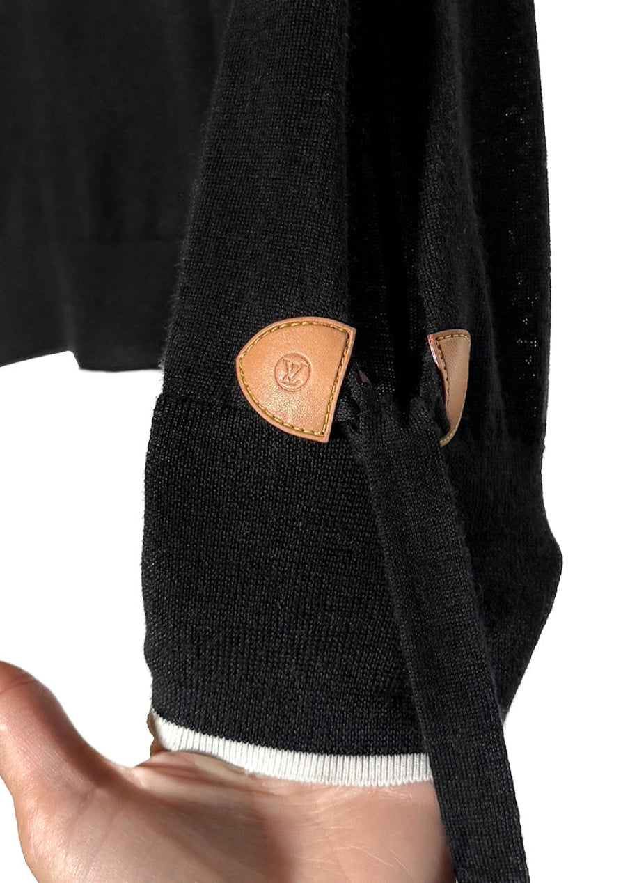 From the Fall Winter 2015 collection. Lightweight knit cashmere blend. Features a round neckline and long sleeves with open slit detailing at arms. Sleeves are accented with branded tan cowhide leather trim and self-tie closures at the cuffs. White contrasting trim at cuffs. Straight hem. Made in Italy.