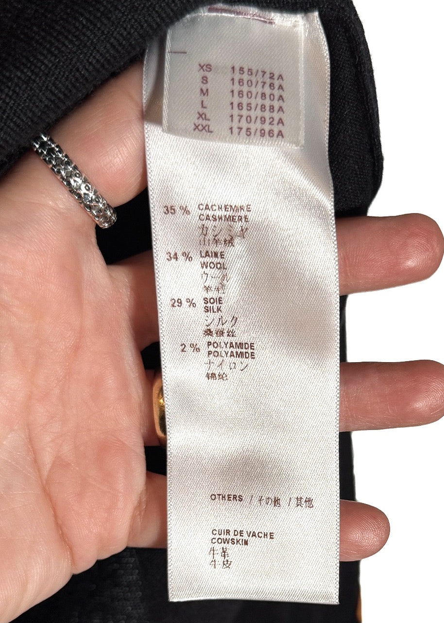 Overall length: 22"MATERIAL(S): 35% cashmere, 34% wool, 29% silk, 2% polyamide, leather trim in cowhide.