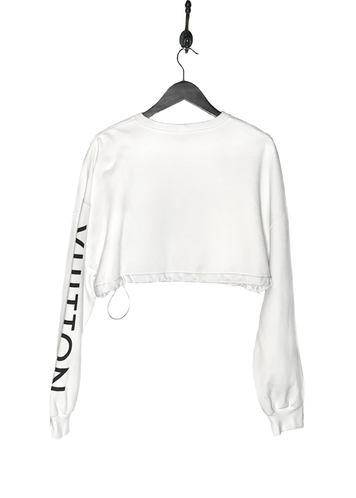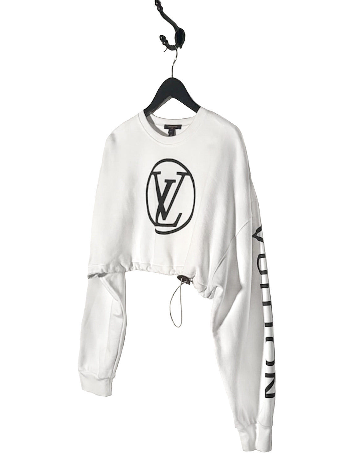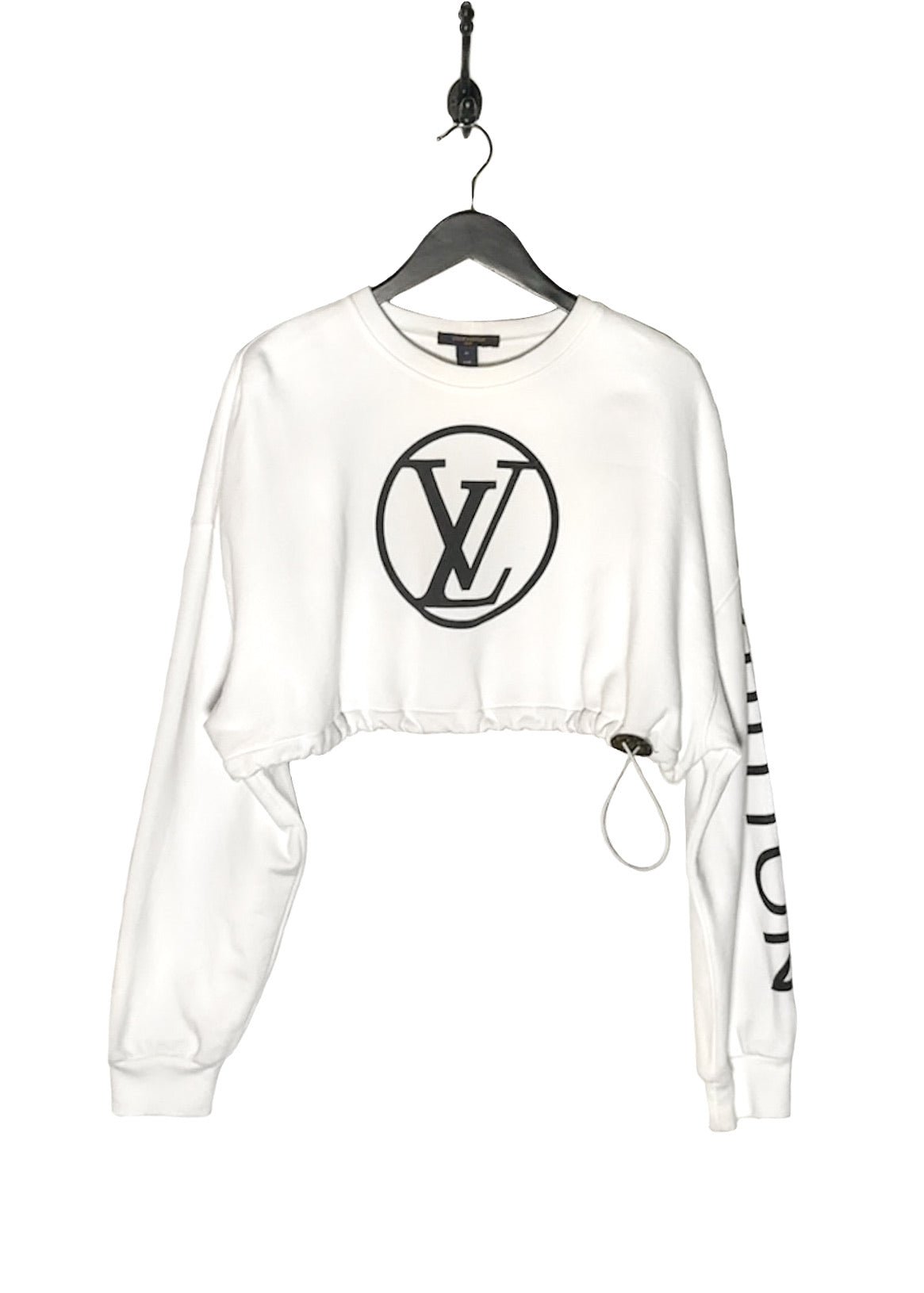 Louis Vuitton White Macro Signature Cropped Sweatshirt. Cropped silhouette. White cotton fleece. LV macro logo at front and enlarged lettering down the left sleeve. Adjustable drawstring at hem with Monogram canvas puller. Ribbed cuffs and collar. Long sleeves. Crew neck. Made in Italy.