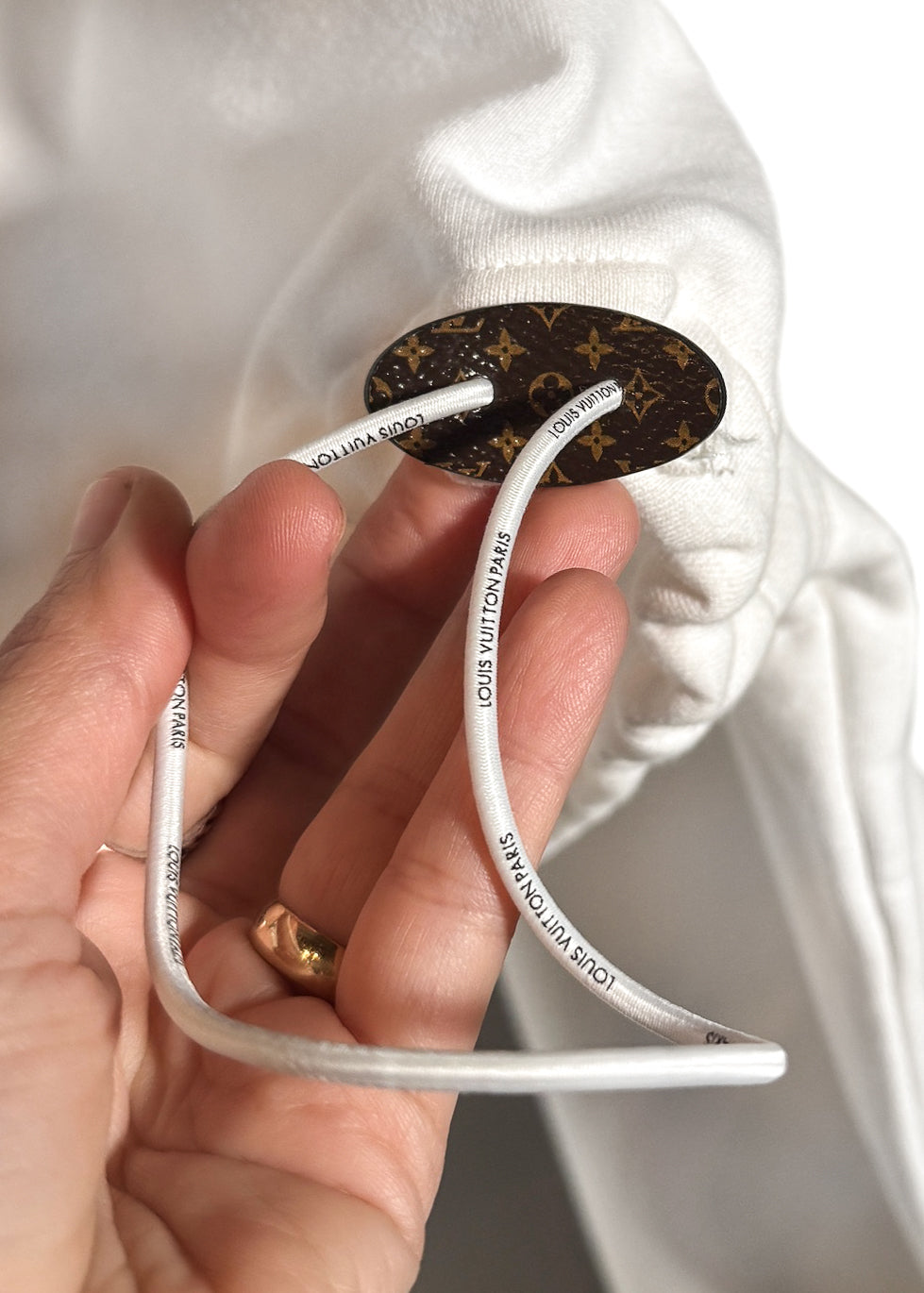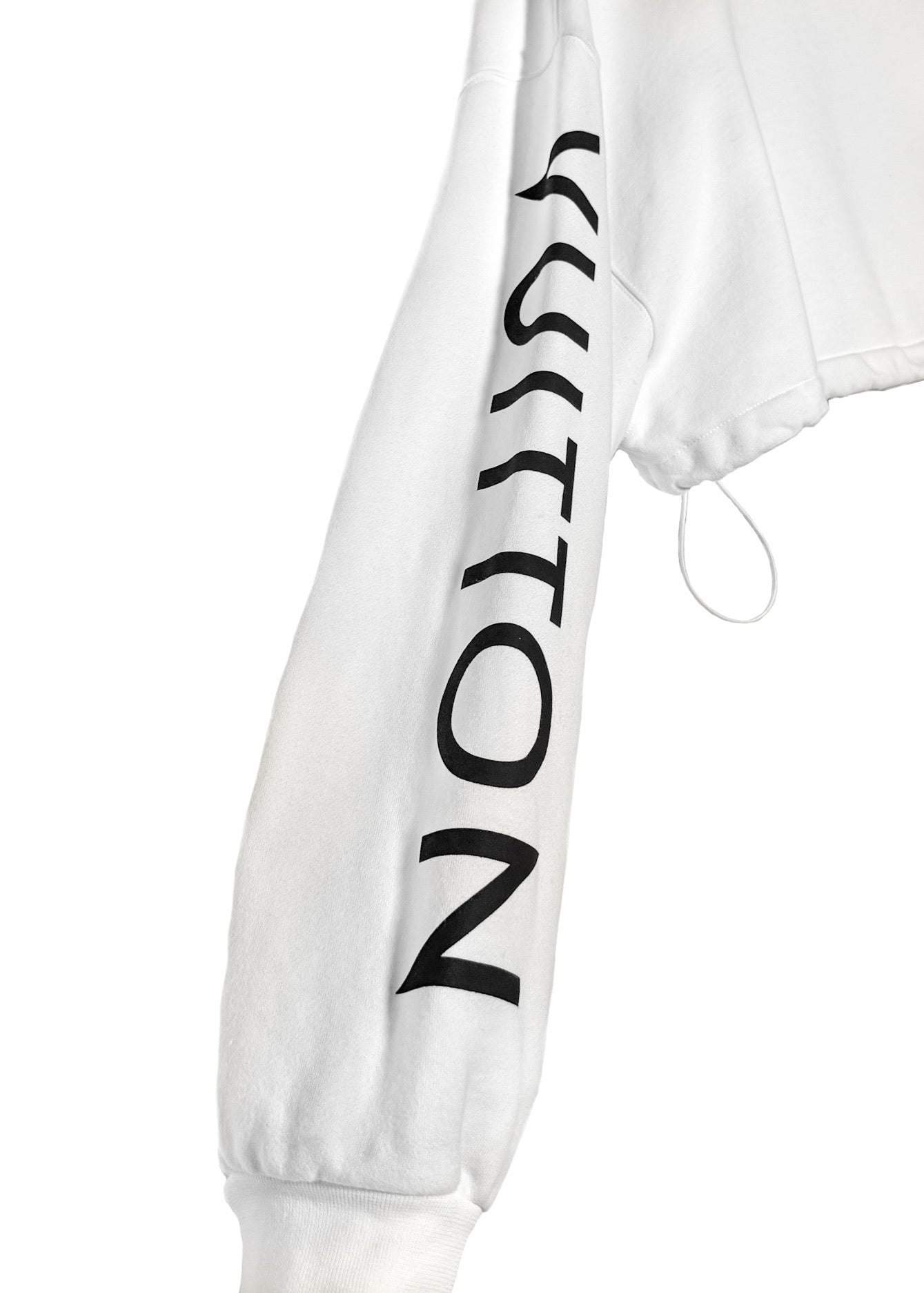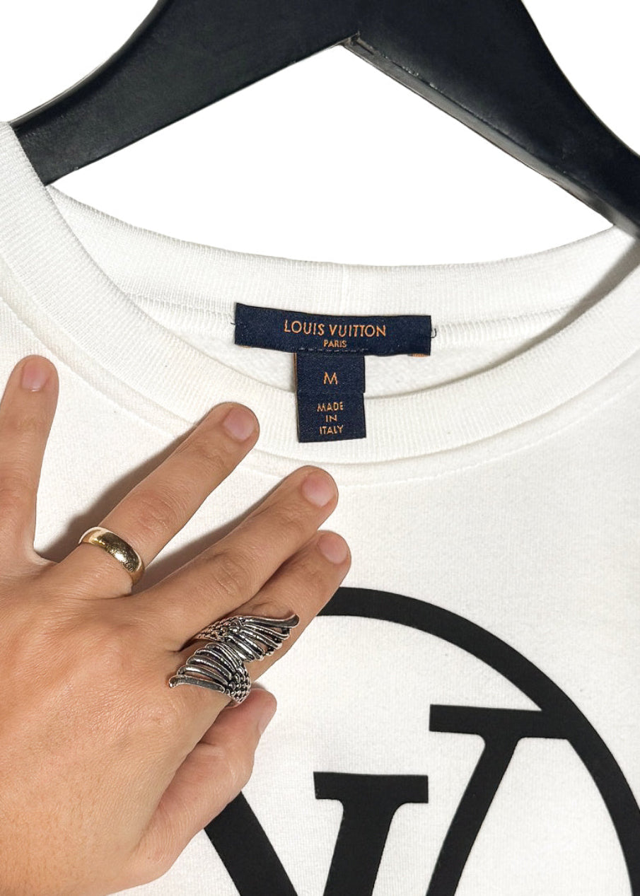 Louis Vuitton White Macro Signature Cropped Sweatshirt. Cropped silhouette. White cotton fleece. LV macro logo at front and enlarged lettering down the left sleeve. Adjustable drawstring at hem with Monogram canvas puller. Ribbed cuffs and collar. Long sleeves. Crew neck. Made in Italy.