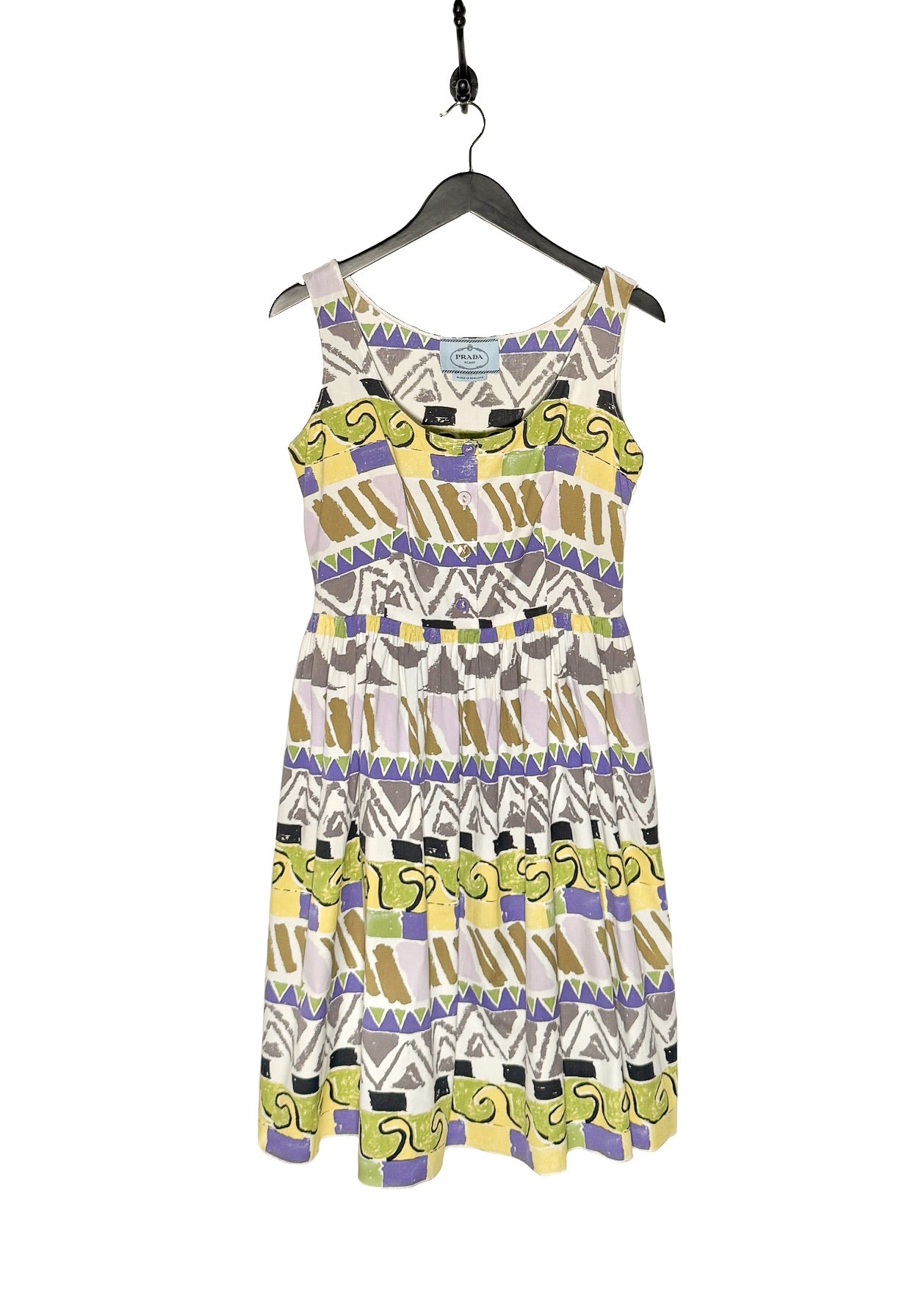 Knee-length. Lightweight cotton. Sleeveless. Scoop neck. Multicolour graphic watercolour-style print. Covered button closure at chest. Gathered waist with flared pleated skirt. Side zip closure. Made in Romania.