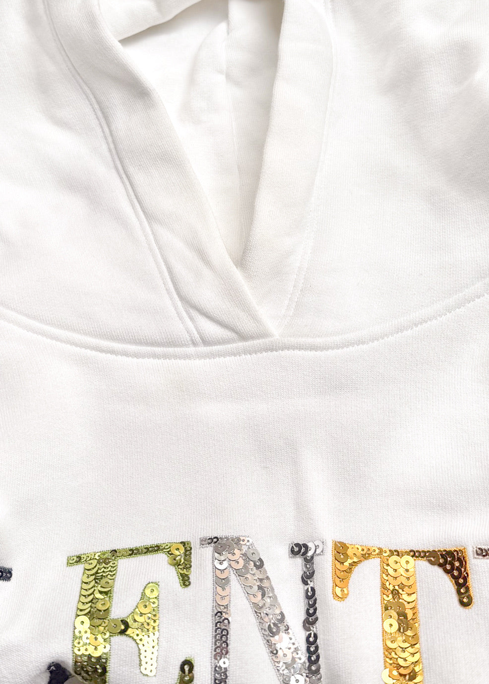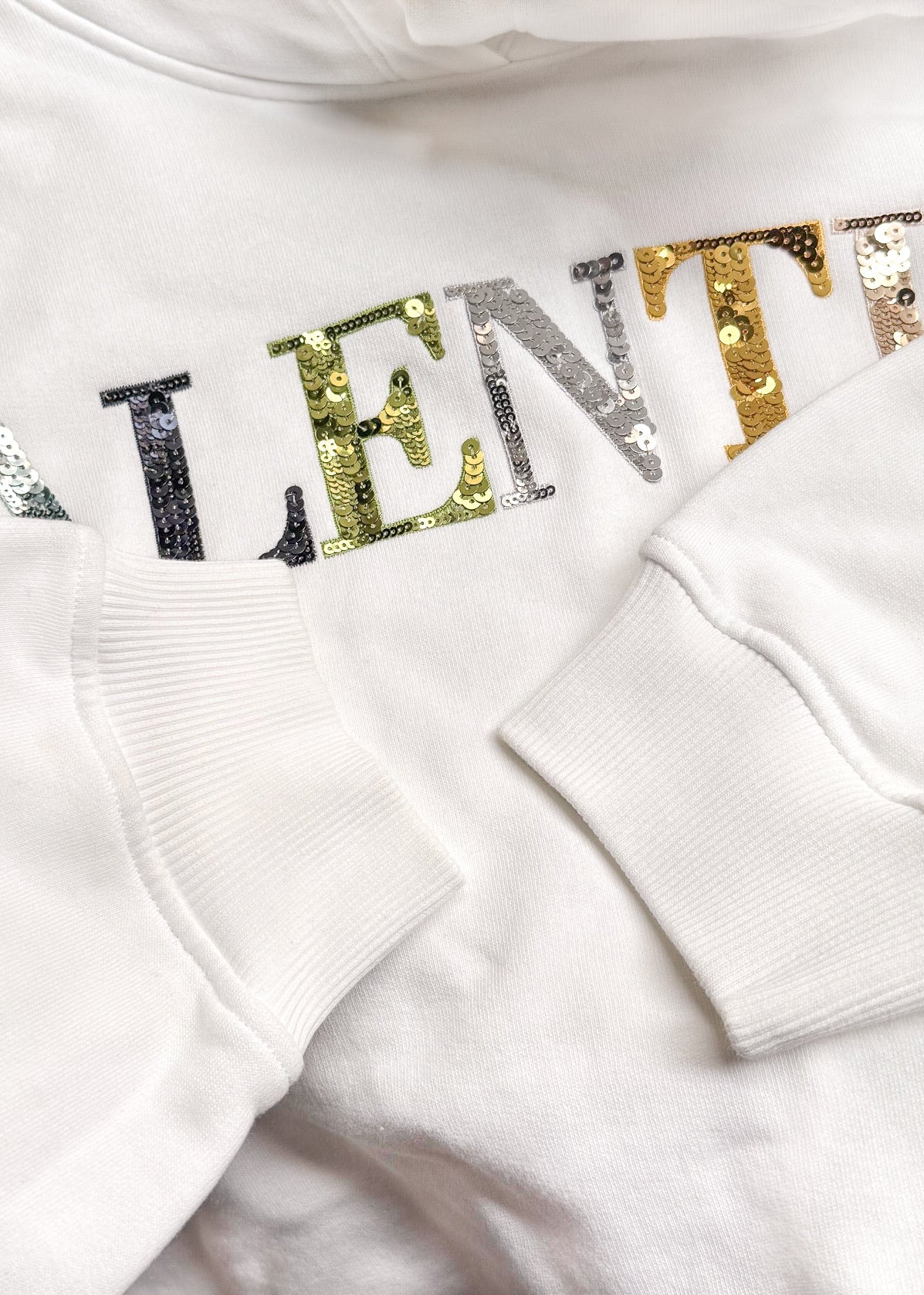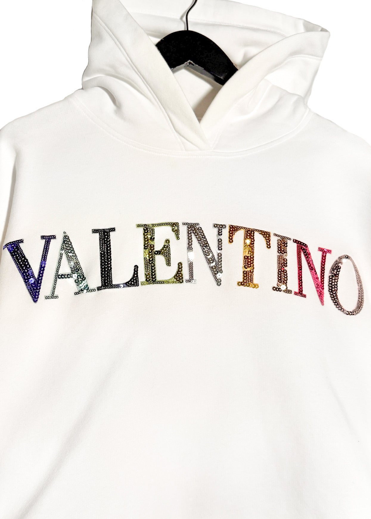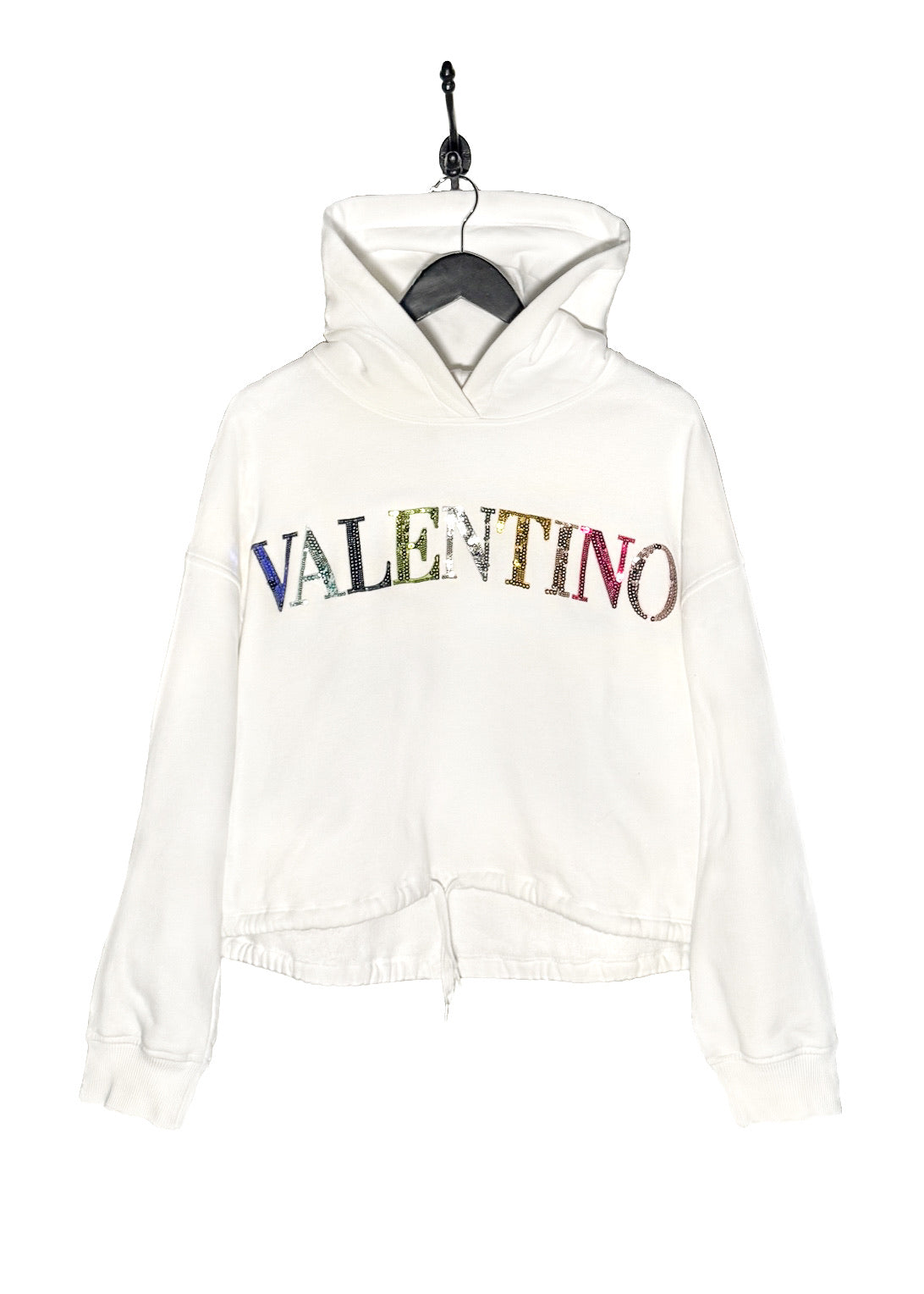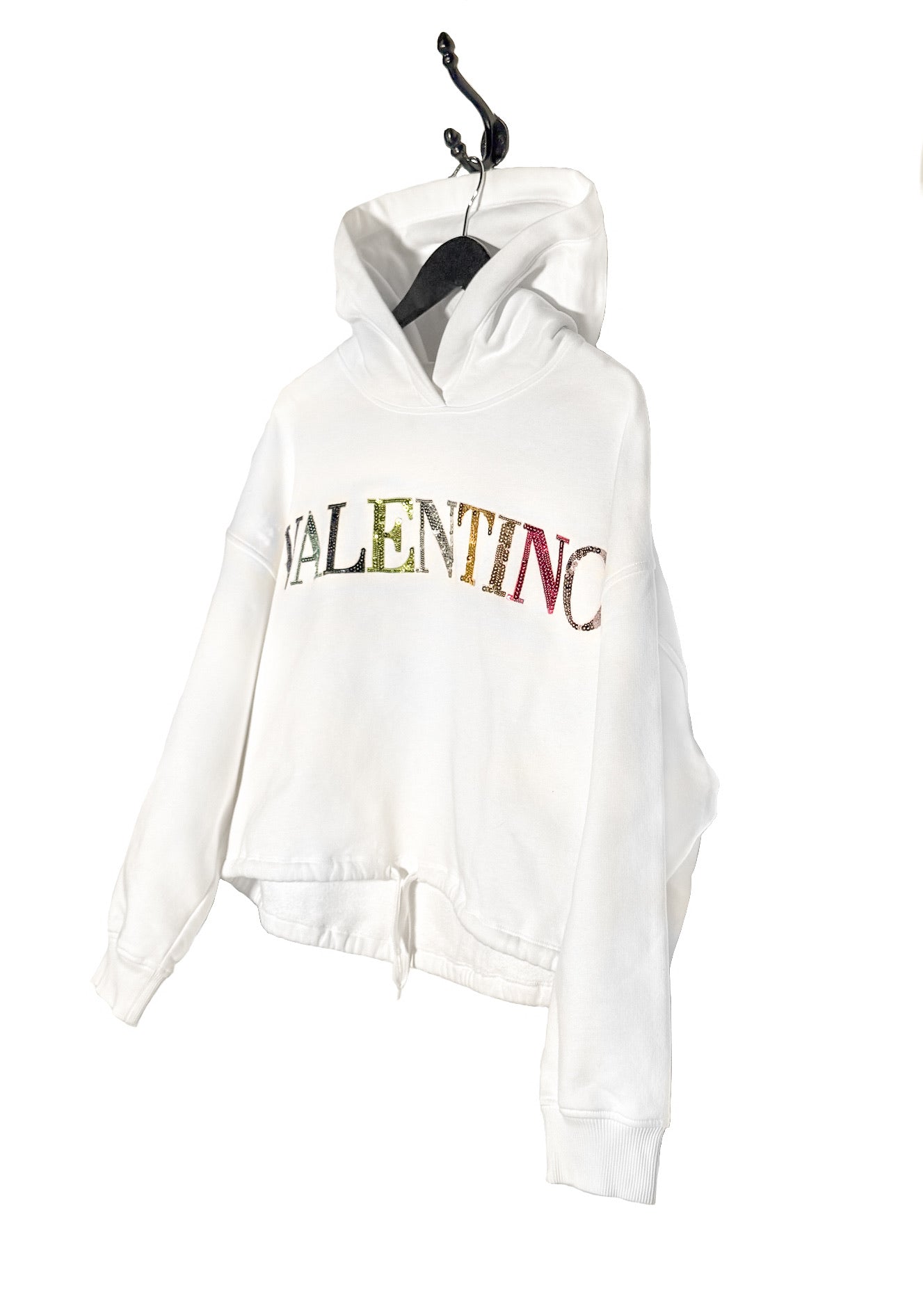 White cotton jersey hoodie. Relaxed boxy straight cut. Adjustable drawstring hood. Rainbow sequin-embellished Valentino logo at front. Long sleeves. Ribbed cuffs and drawstring hem. Made in Italy.
