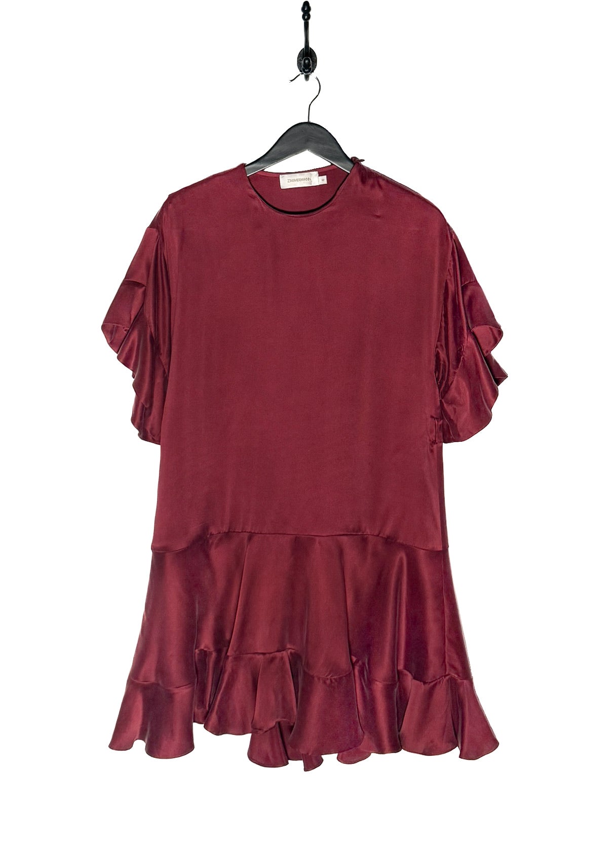 Mini-length dress in lightweight burgundy washed silk with a soft matte sheen. Round neckline. Short flutter sleeves with ruffle detailing. Tiered skirt with ruffled hem. Self-tie belt at the back. Zip closure at shoulders. Designed in Australia. Made in China.