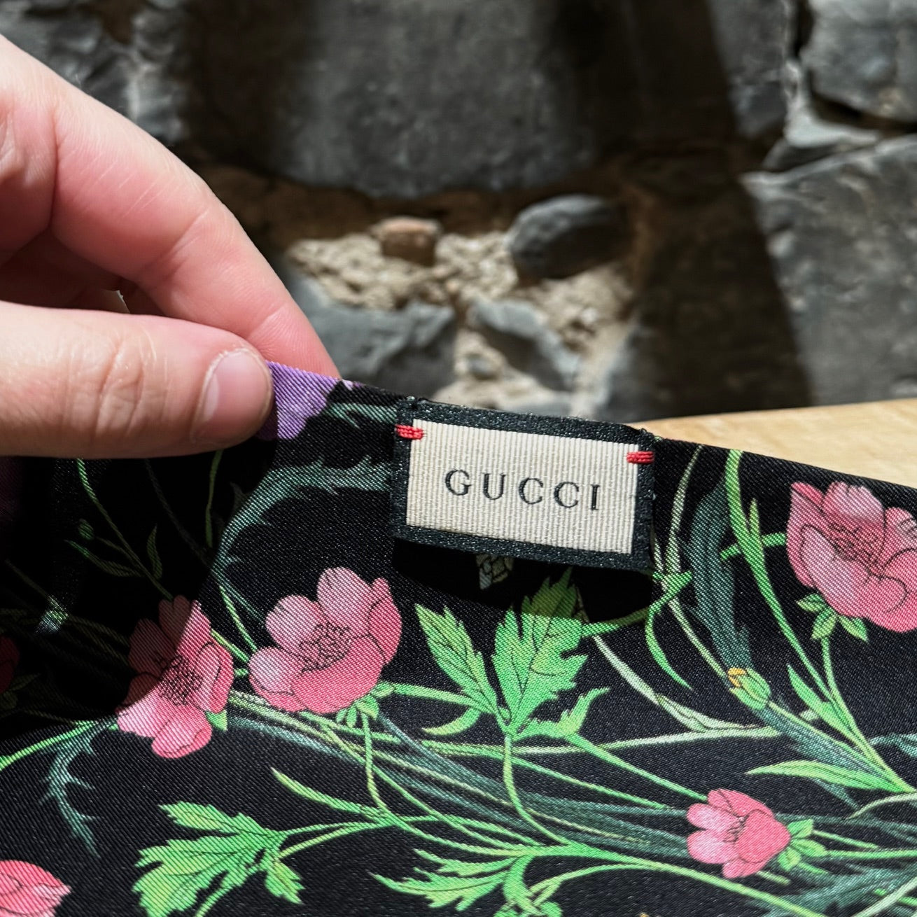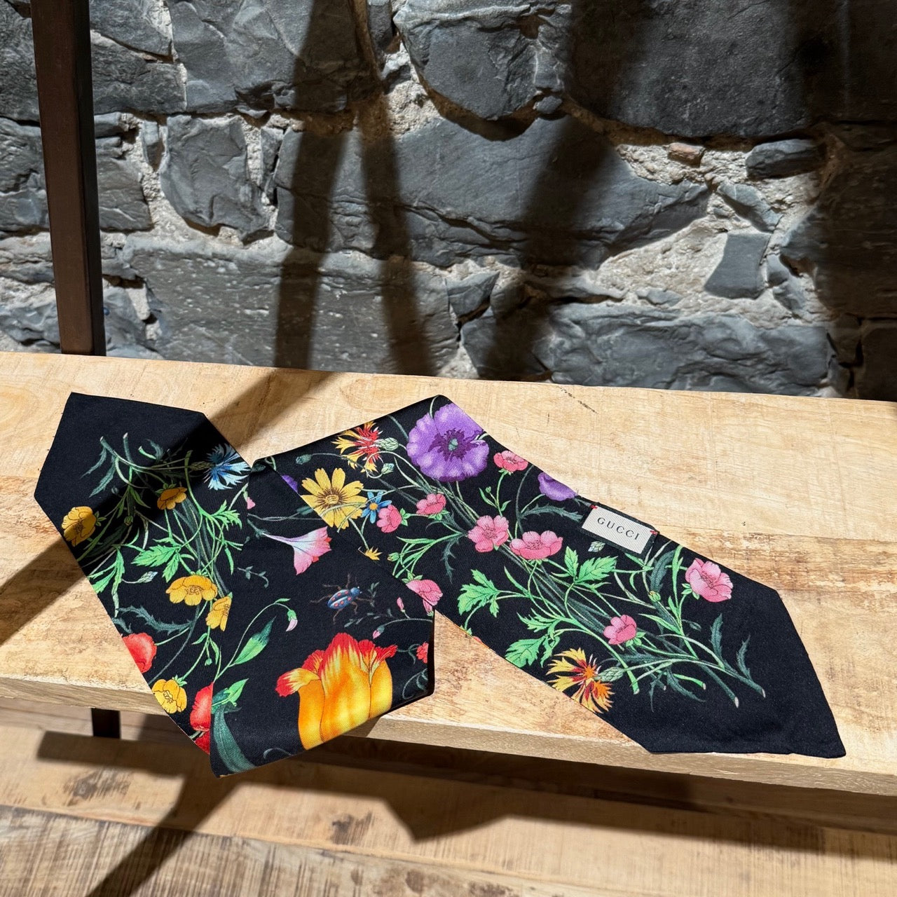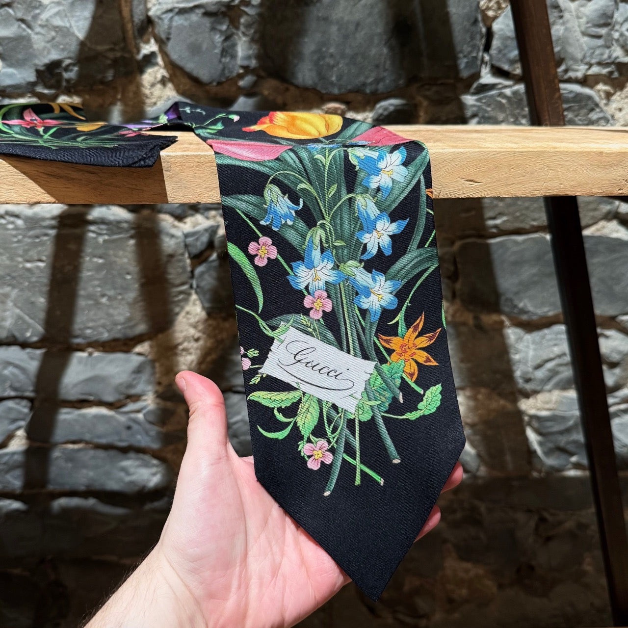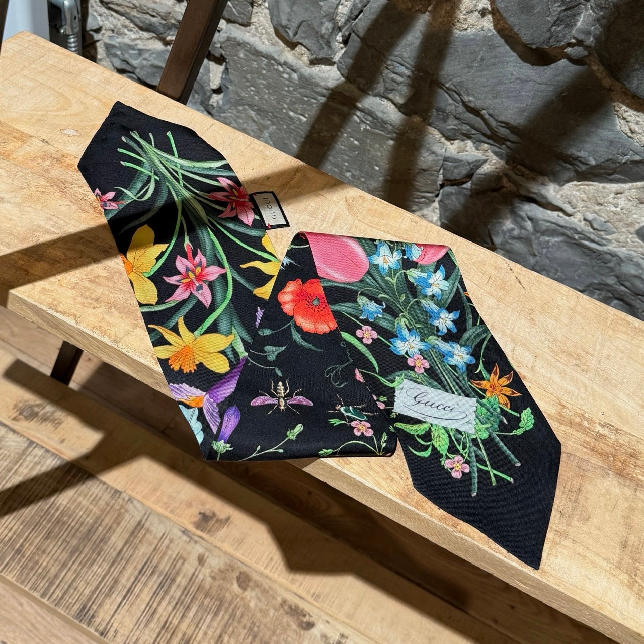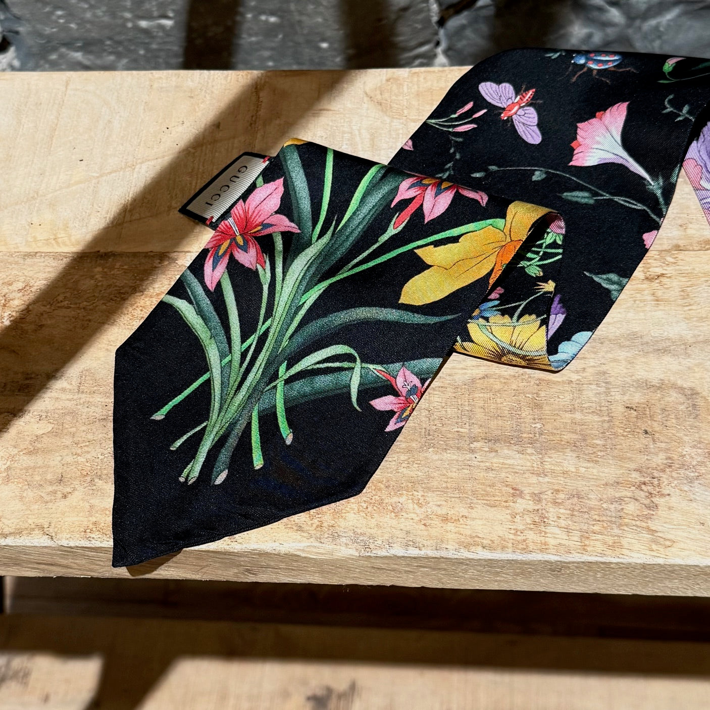 Faite en fine soie ornée de l’imprimé botanique multicolore emblématique Gucci Flora sur fond noir. Logo script Gucci. Silhouette longue et étroite avec extrémités pointues. Étiquette de marque Gucci sur un côté. Faite en Italie. Livrée telle quelle. Les étiquettes de composition et d’entretien sont manquantes.