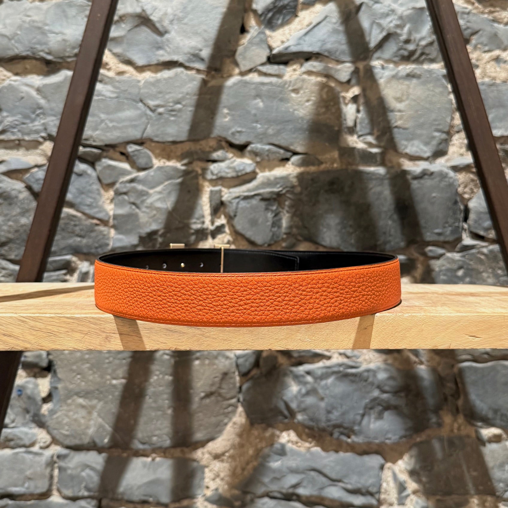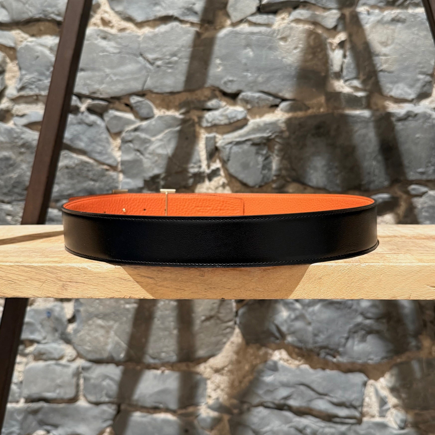 Sangle réversible bicolore en cuir grainé orange et cuir noir lisse brillant. Boucle Constance H en métal doré brossé avec gravure « Hermès ». Kit de ceinture complet pouvant être assorti avec d'autres produits Hermès. Ajustement réglable avec 5 (cinq) trous. Marquage D - 2019. Faite en France. Livrée avec sac poussière Hermès.