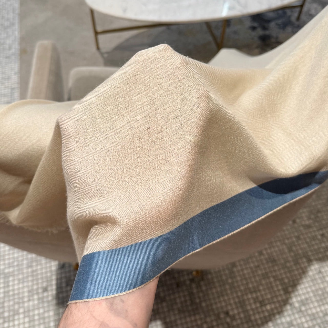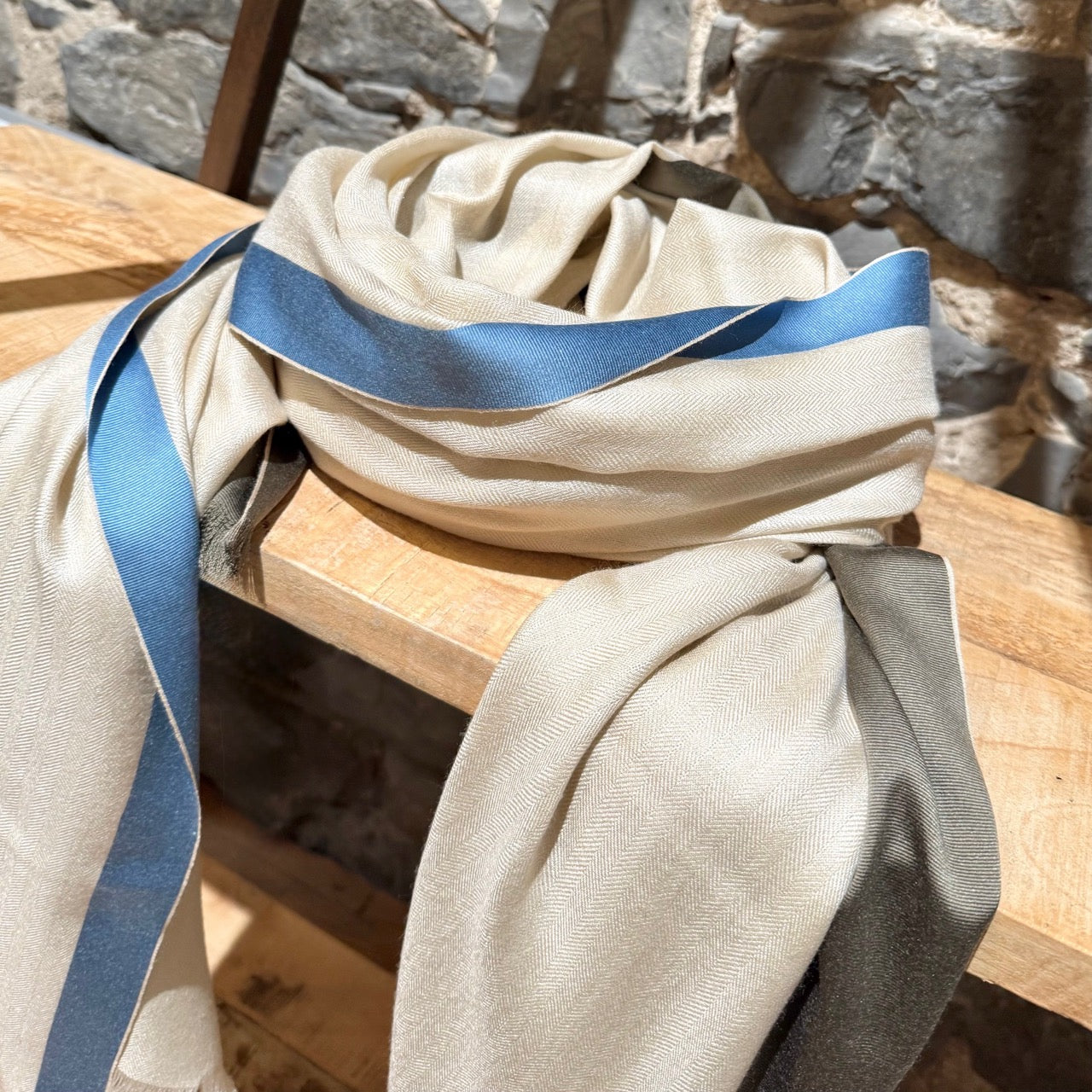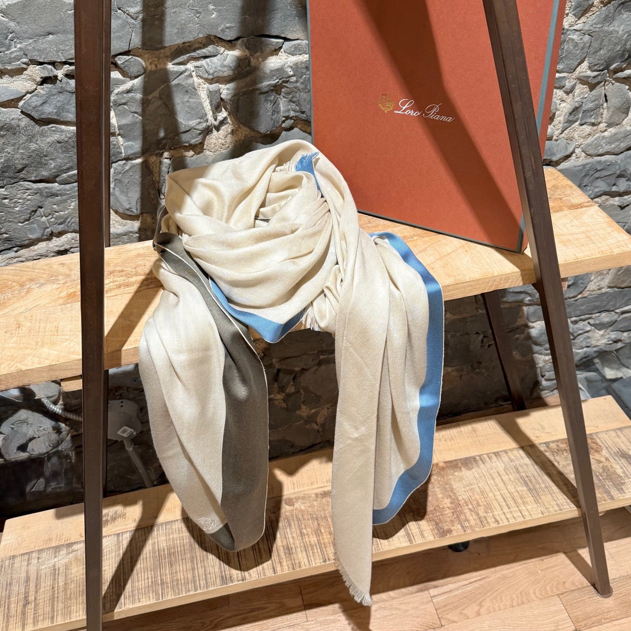 Mélange de cachemire et de soie. Tissage chevron doux et léger en ivoire avec bordures contrastantes bleu et vert kaki. Bords à franges et logo Loro Piana brodé à une extrémité. Livrée avec boîte Loro Piana.