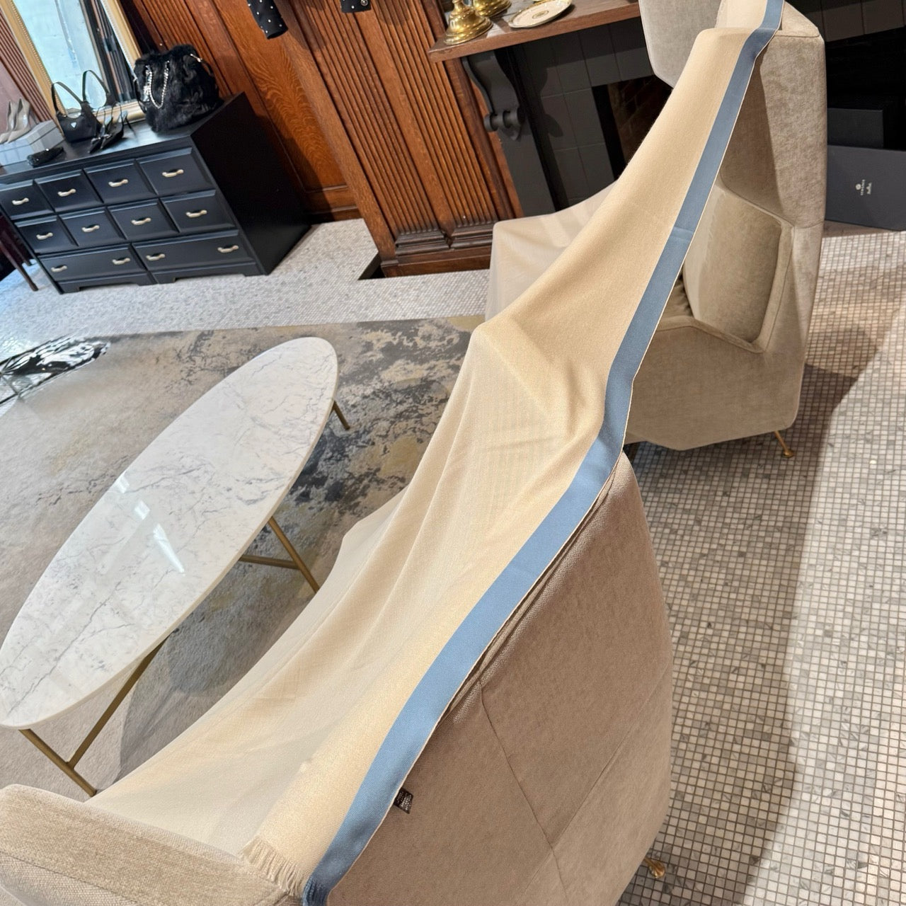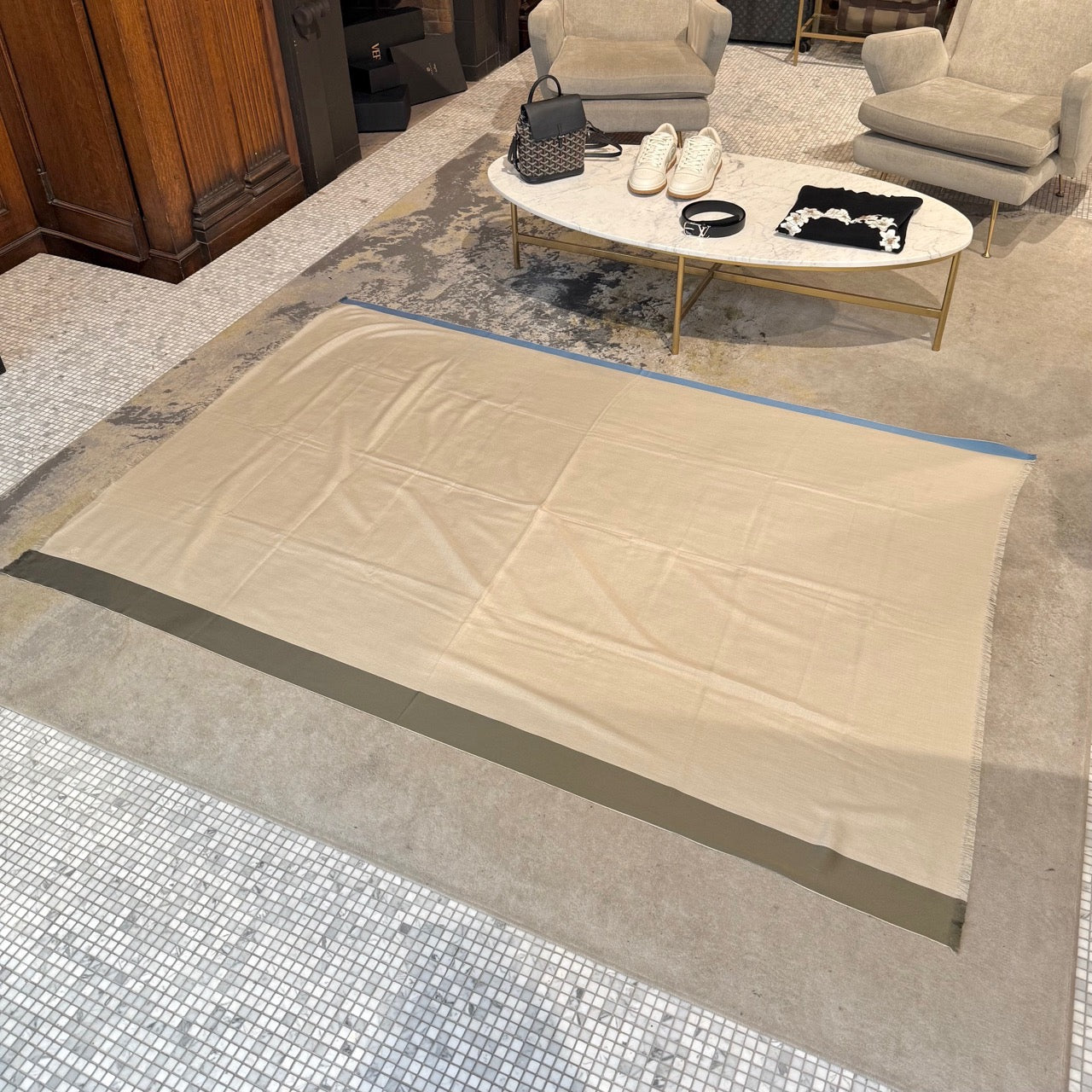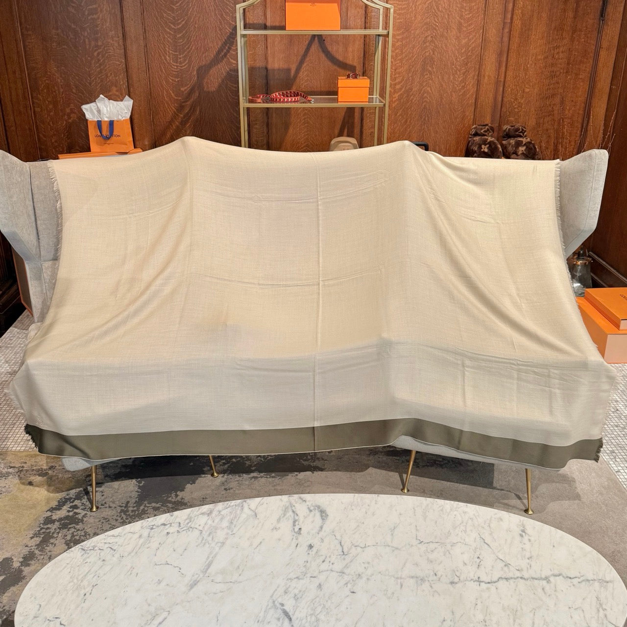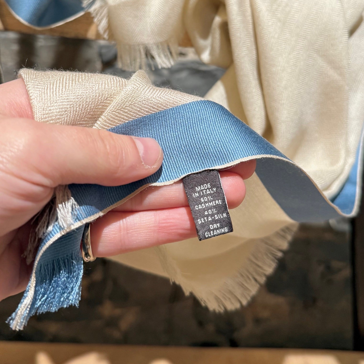 Mélange de cachemire et de soie. Tissage chevron doux et léger en ivoire avec bordures contrastantes bleu et vert kaki. Bords à franges et logo Loro Piana brodé à une extrémité. Livrée avec boîte Loro Piana.