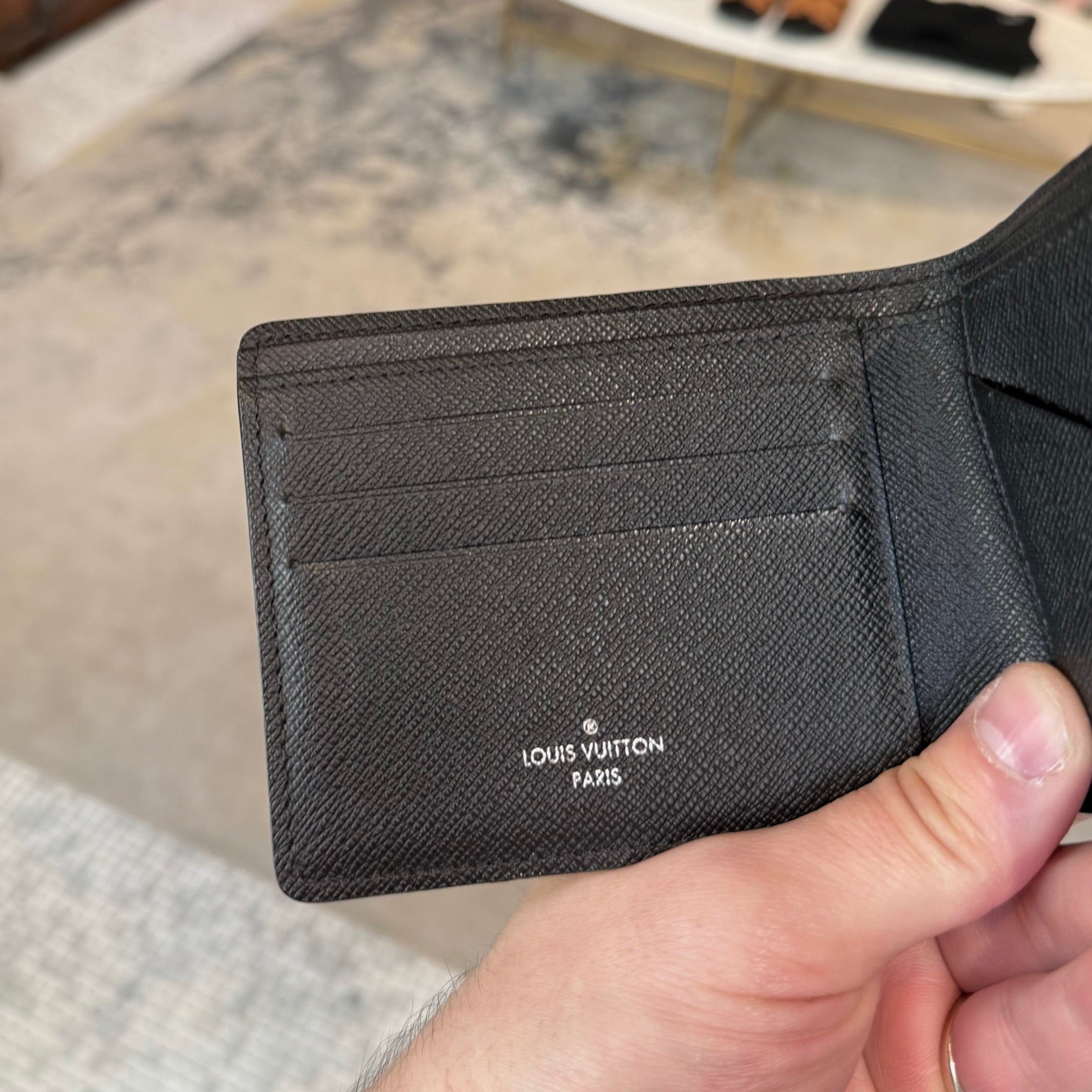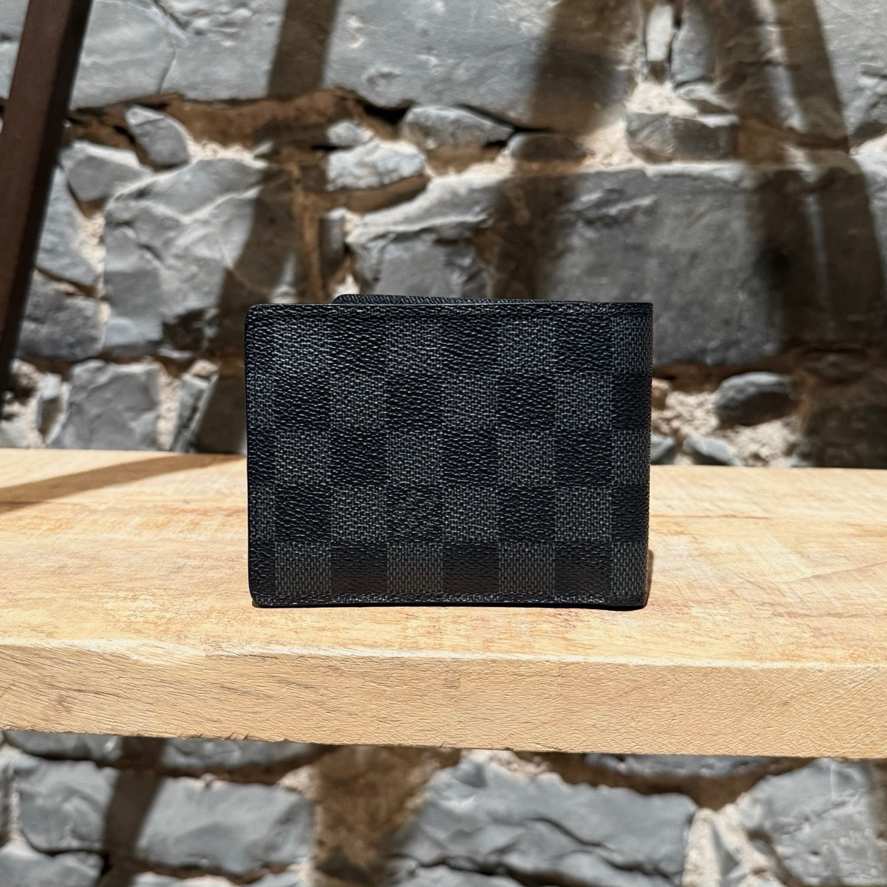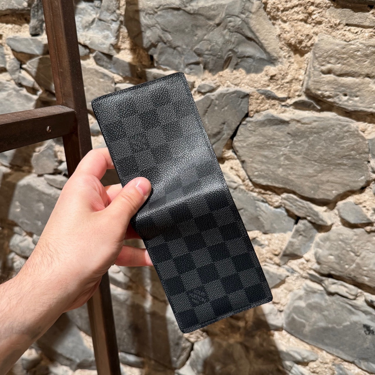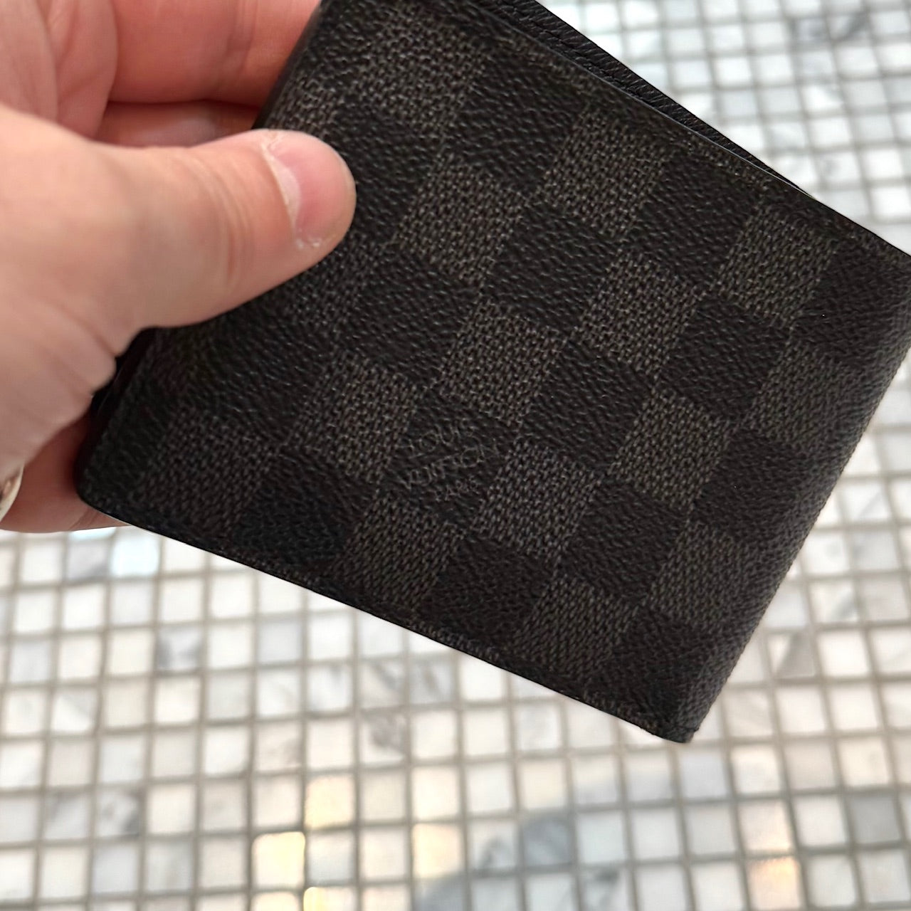 De la collection 2013. Toile enduite Damier Graphite avec intérieur en cuir de vachette noir texturé. Comporte des fentes pour cartes, des compartiments plats et des poches pour billets pleine longueur. Les initiales "POB" ont été marquées à chaud à l’intérieur par le propriétaire précédent. Fait en Espagne. Livré avec boîte et sac poussière Louis Vuitton.