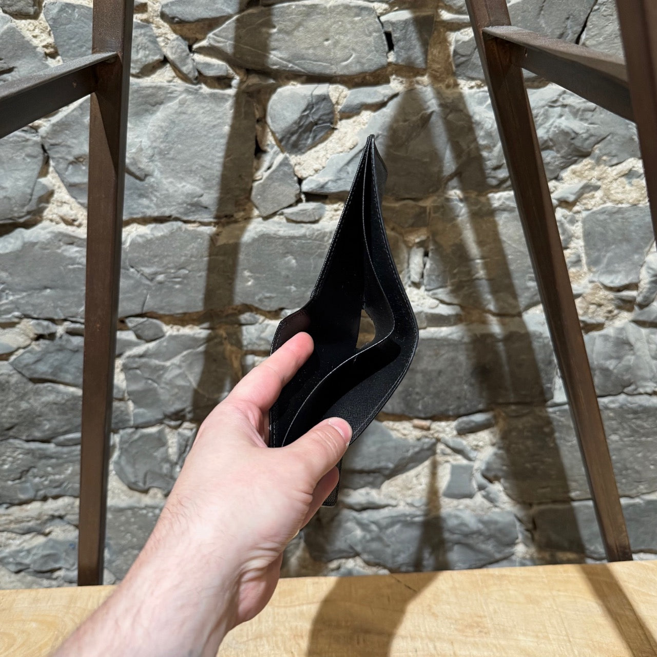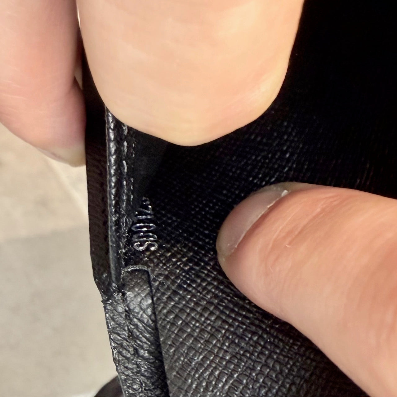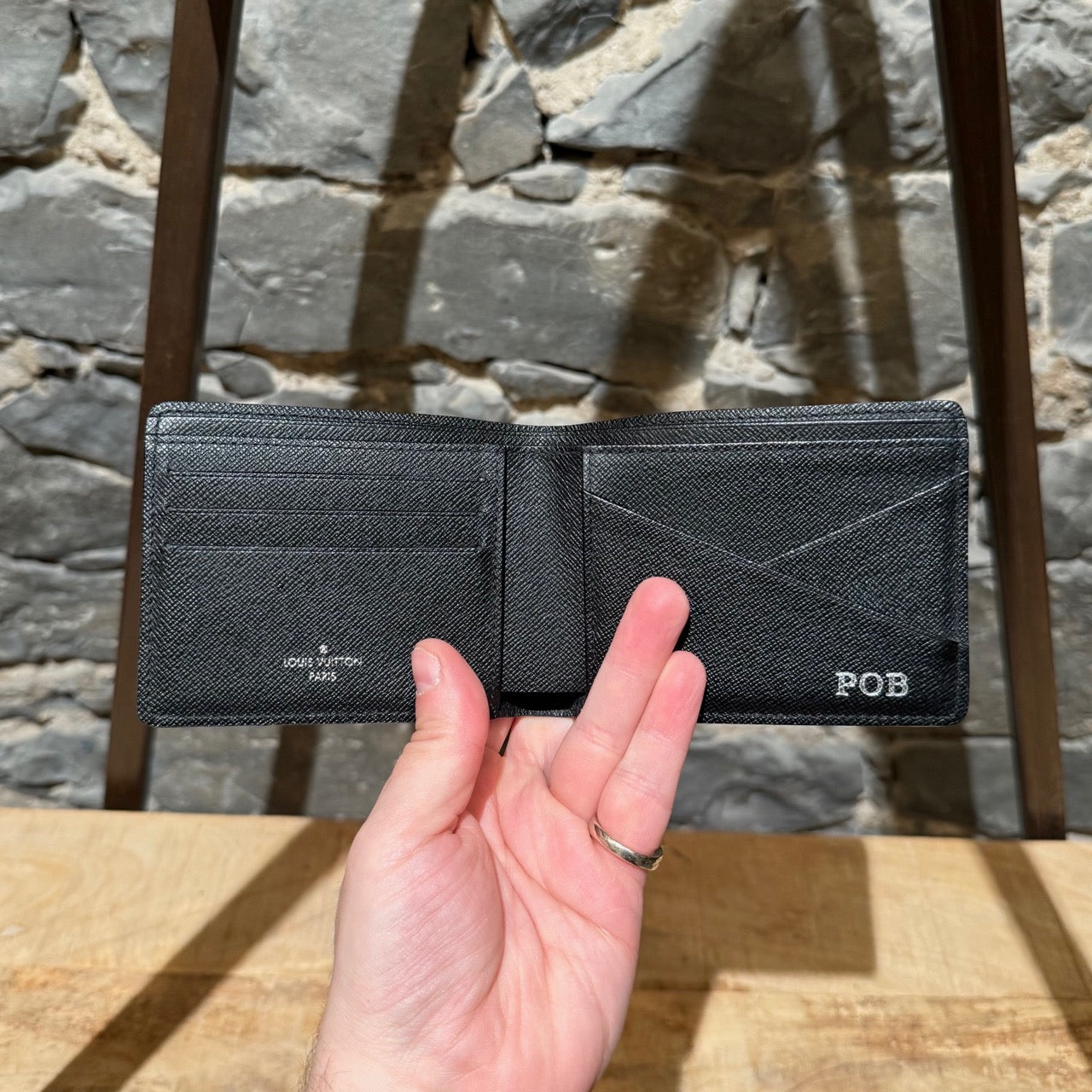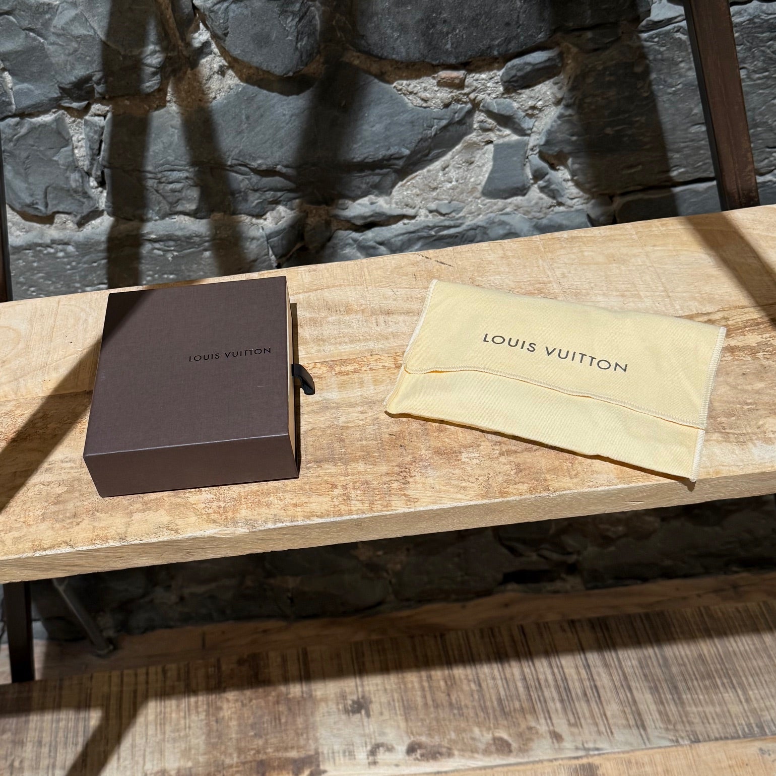 De la collection 2013. Toile enduite Damier Graphite avec intérieur en cuir de vachette noir texturé. Comporte des fentes pour cartes, des compartiments plats et des poches pour billets pleine longueur. Les initiales "POB" ont été marquées à chaud à l’intérieur par le propriétaire précédent. Fait en Espagne. Livré avec boîte et sac poussière Louis Vuitton.
