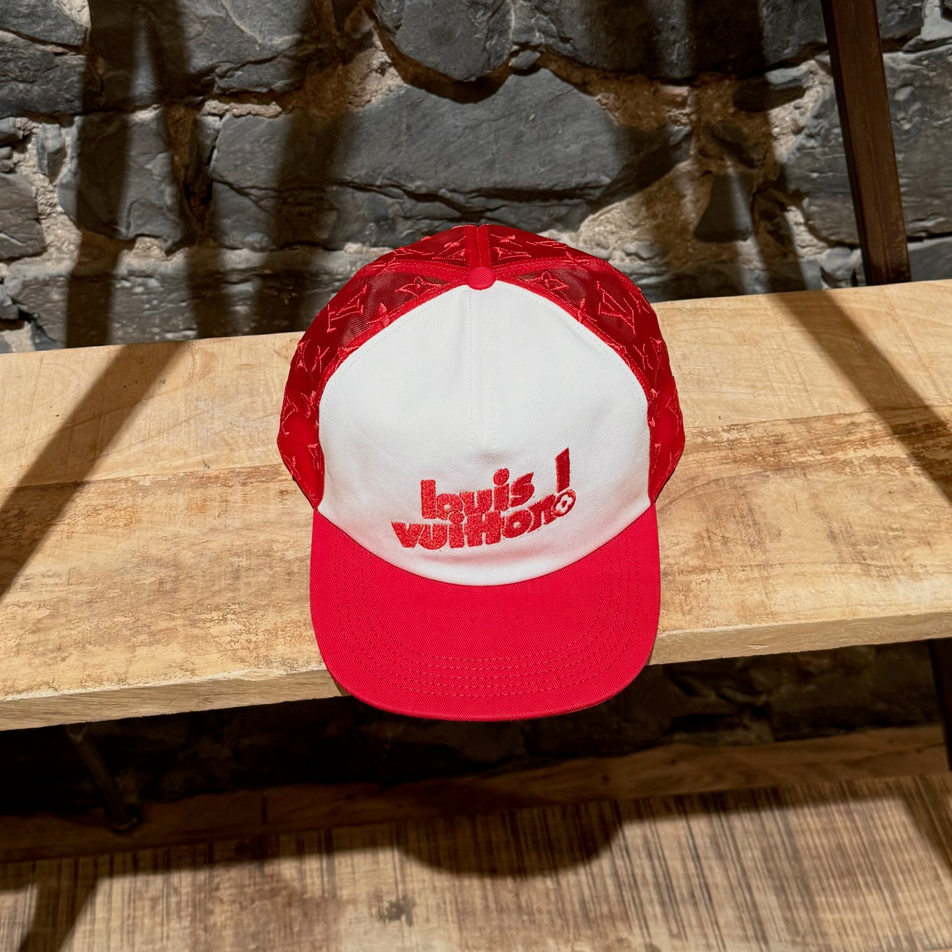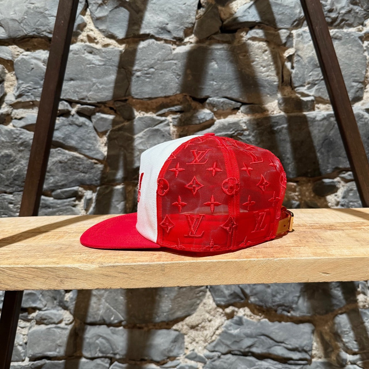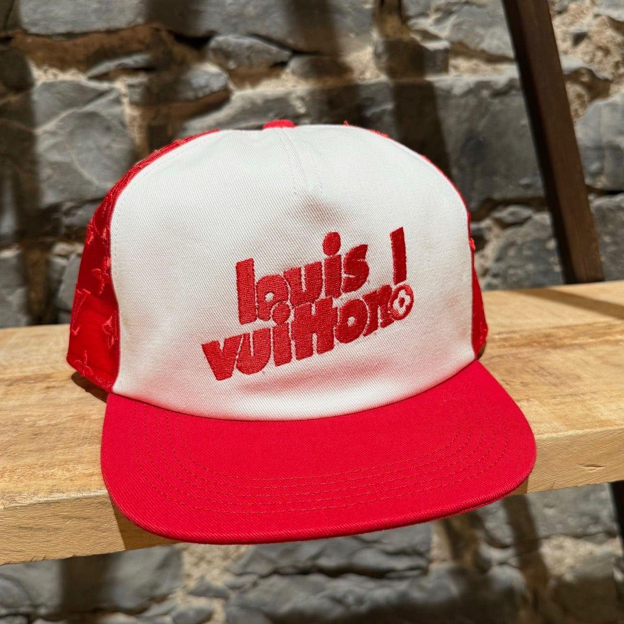 Casquette Louis Vuitton en maille rouge brodée LV Soho. Coloris exclusif pour la boutique new-yorkaise de Soho. Silhouette à six panneaux avec devant blanc contrasté et visière rouge. Côtés et dos en maille rouge brodés du motif Monogram signature. Bandoulière réglable en cuir de vache naturel avec boucle dorée. Broderie Louis Vuitton rouge audacieuse sur le devant. Bandeau intérieur en gros-grain rouge avec logo ton sur ton. Fabriquée en Italie. Vendue telle quelle.