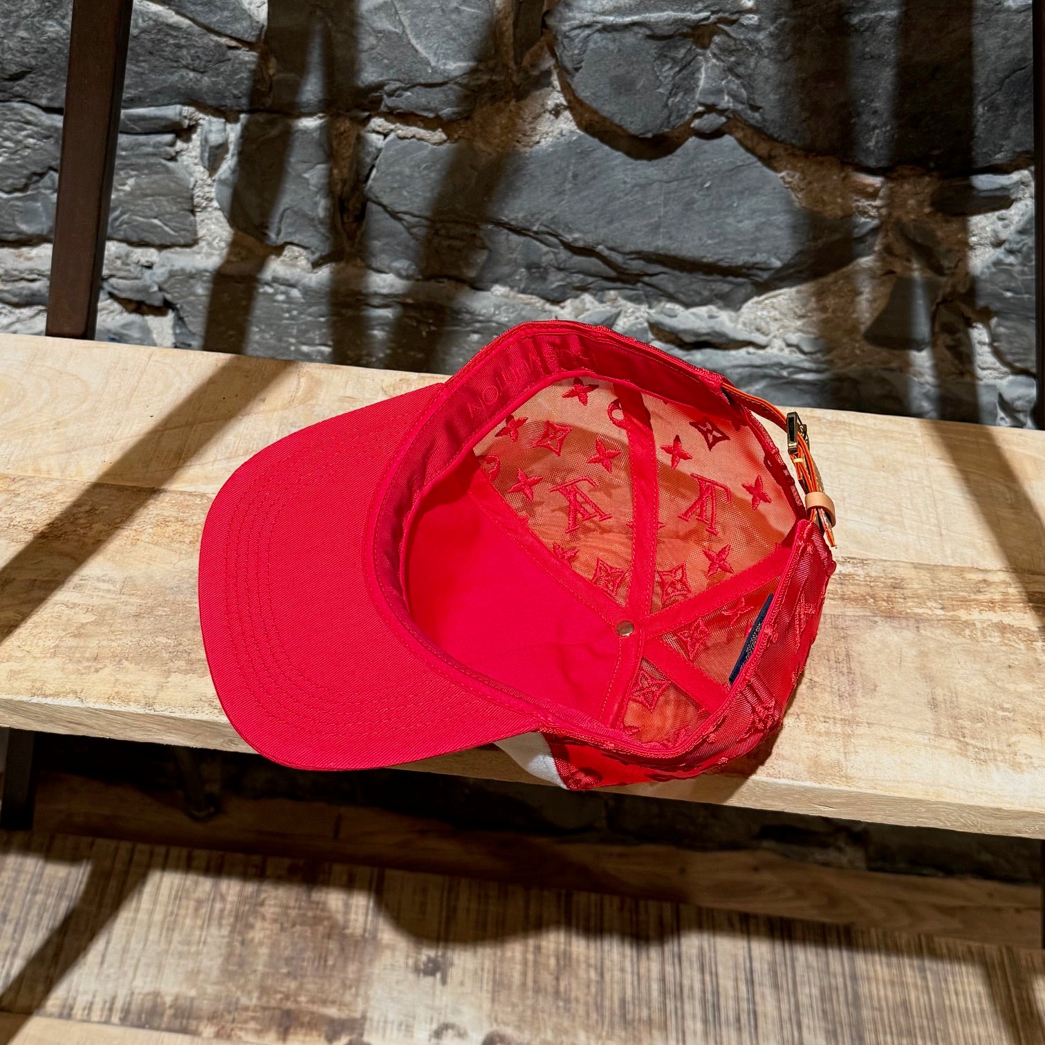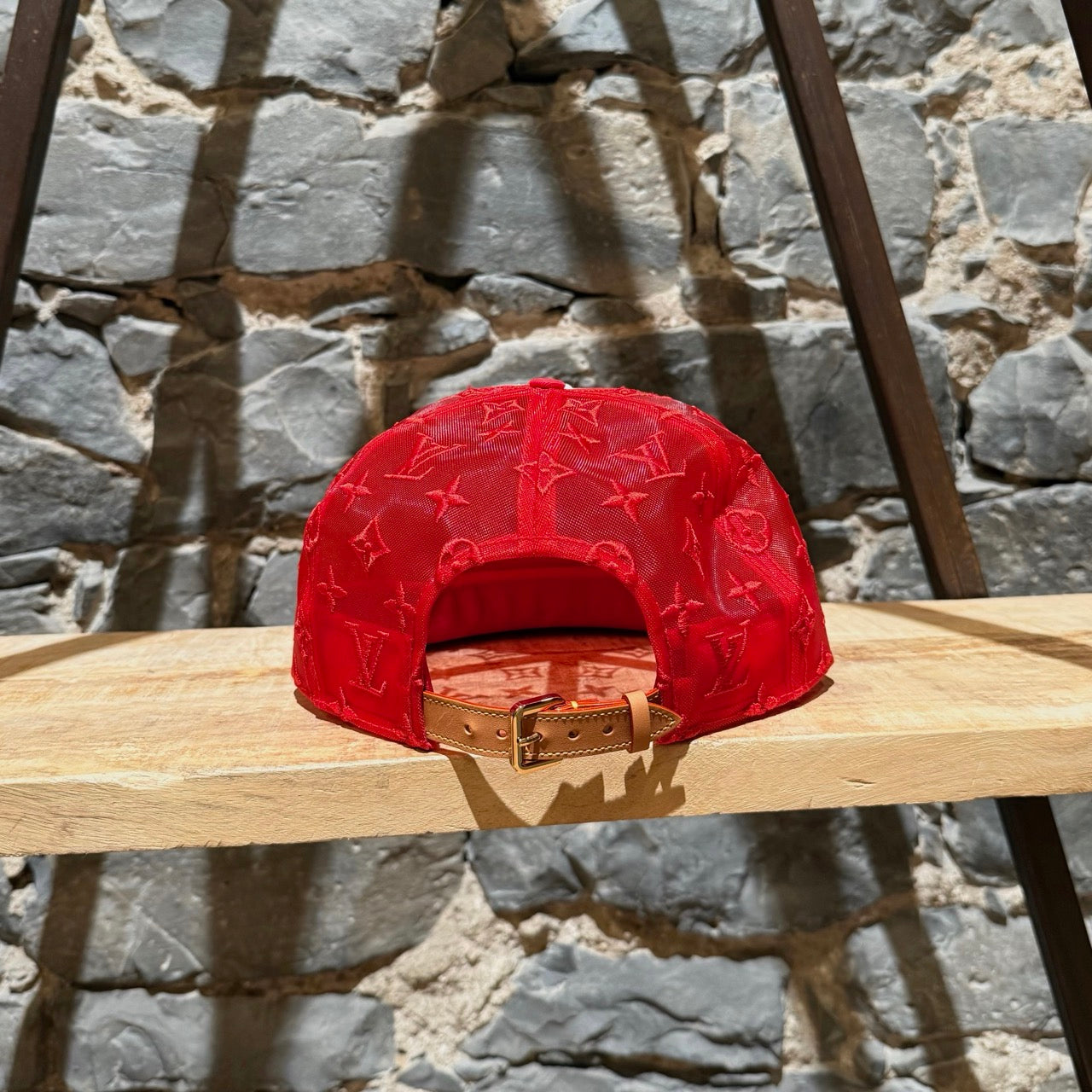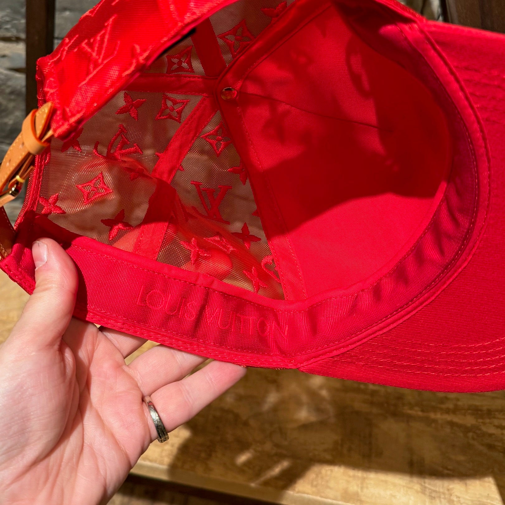 Casquette Louis Vuitton en maille rouge brodée LV Soho. Coloris exclusif pour la boutique new-yorkaise de Soho. Silhouette à six panneaux avec devant blanc contrasté et visière rouge. Côtés et dos en maille rouge brodés du motif Monogram signature. Bandoulière réglable en cuir de vache naturel avec boucle dorée. Broderie Louis Vuitton rouge audacieuse sur le devant. Bandeau intérieur en gros-grain rouge avec logo ton sur ton. Fabriquée en Italie. Vendue telle quelle.