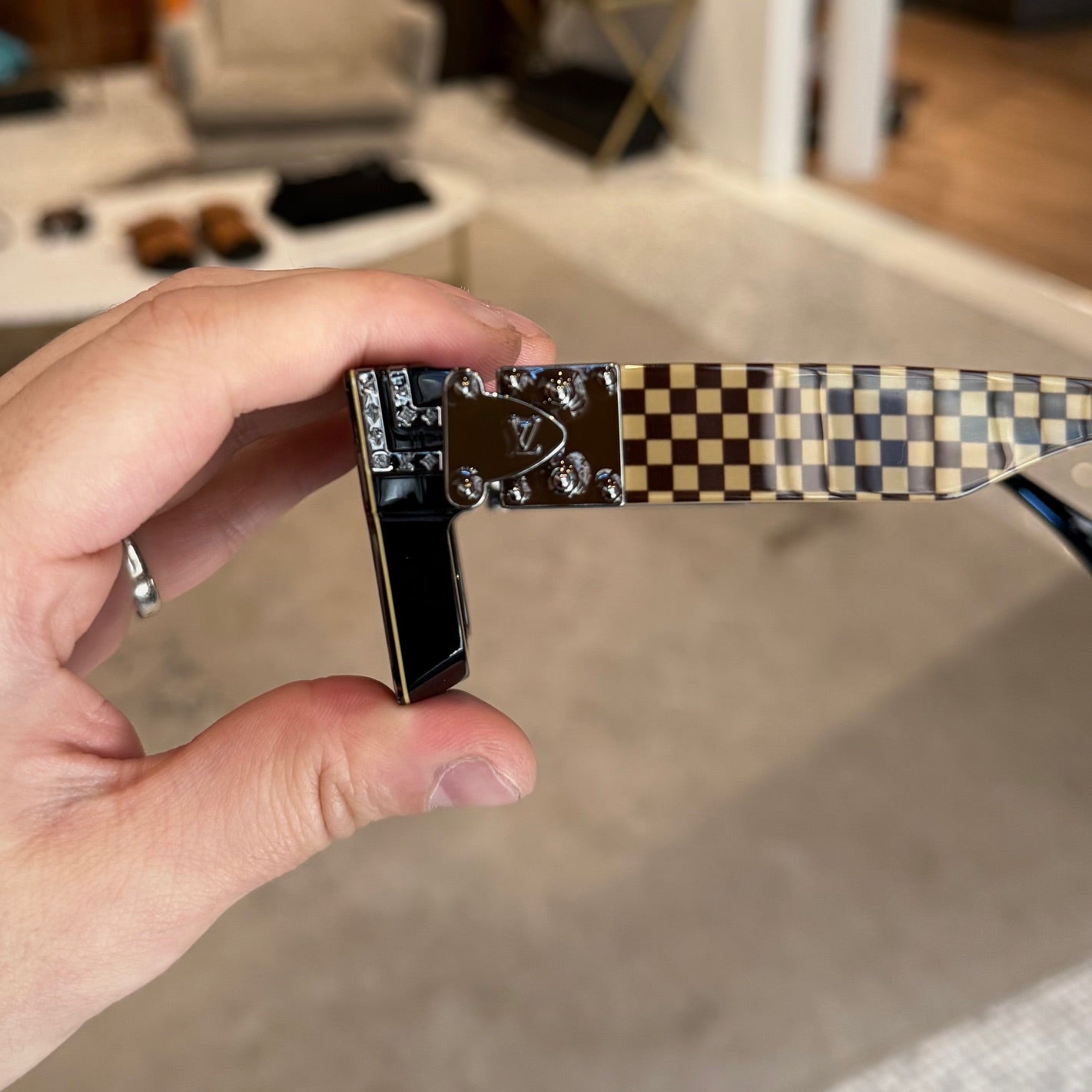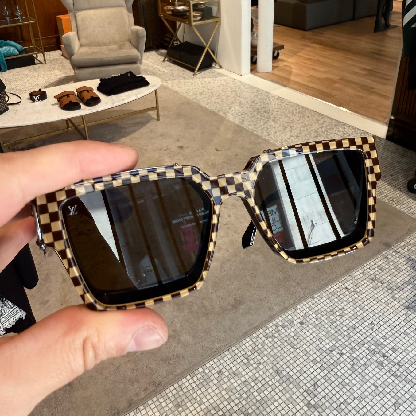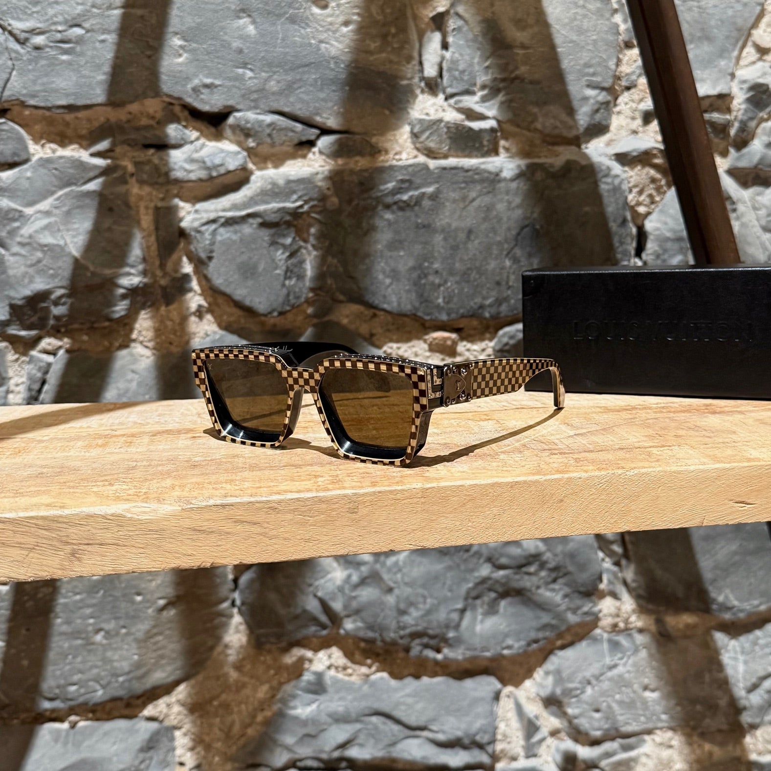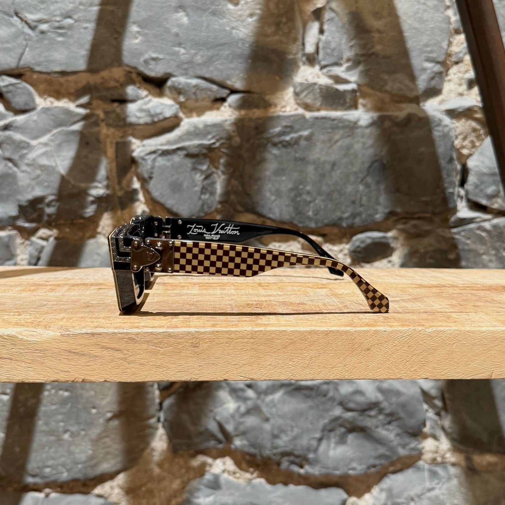 Modèle carré en acétate Damier Pop marron et beige, avec une bande métallique argentée ornée d'une fleur monogramme sur le haut de la monture. Charnières métalliques S-lock inspirées des malles, gravées du monogramme LV. Cercles intérieurs noir mat. Verres noirs gravés du logo LV. Fabriquées en Italie. Livrées avec un étui et une housse de protection Louis Vuitton.