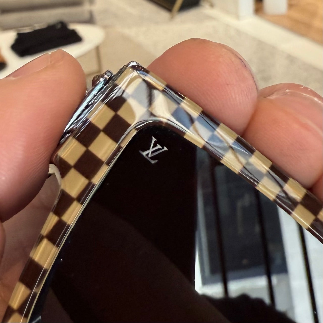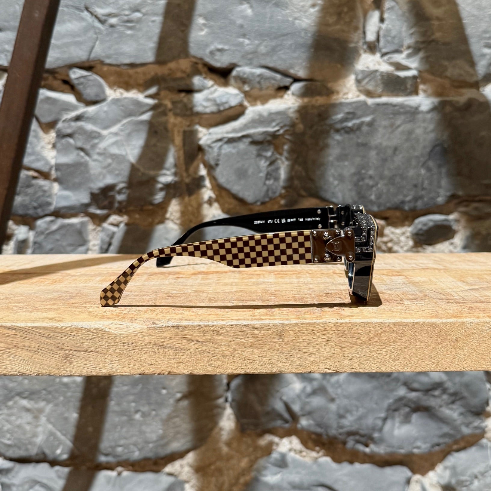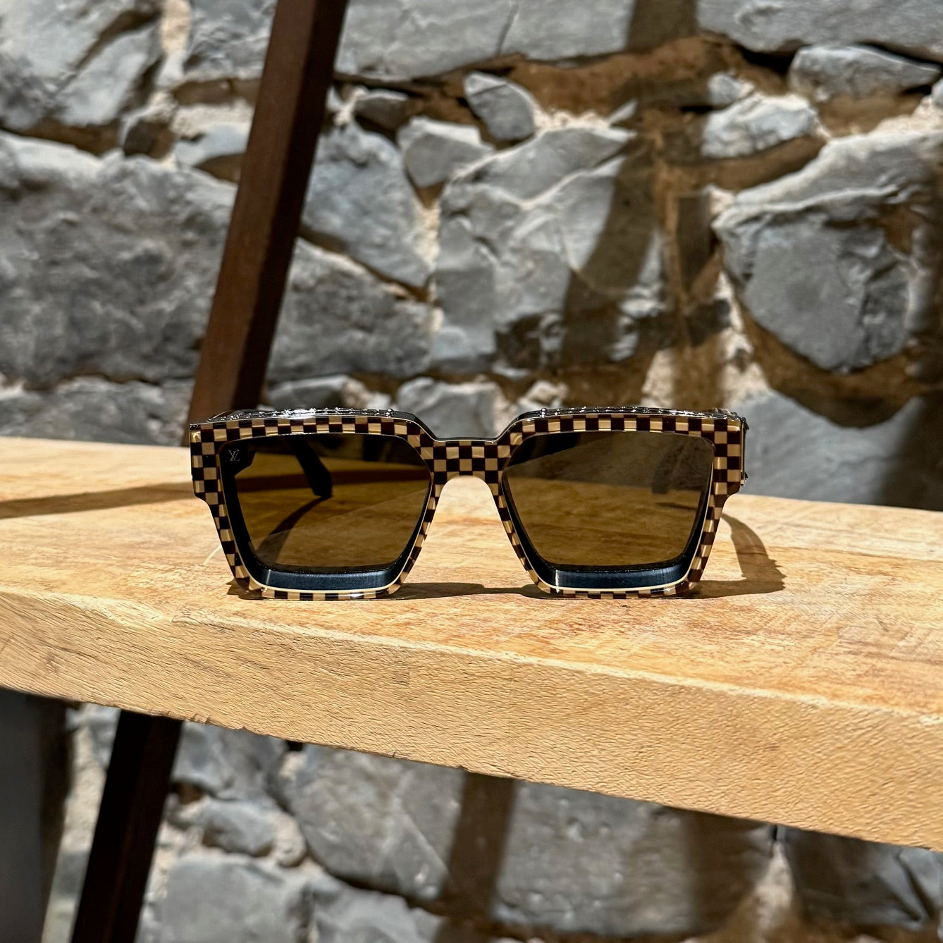 Modèle carré en acétate Damier Pop marron et beige, avec une bande métallique argentée ornée d'une fleur monogramme sur le haut de la monture. Charnières métalliques S-lock inspirées des malles, gravées du monogramme LV. Cercles intérieurs noir mat. Verres noirs gravés du logo LV. Fabriquées en Italie. Livrées avec un étui et une housse de protection Louis Vuitton.