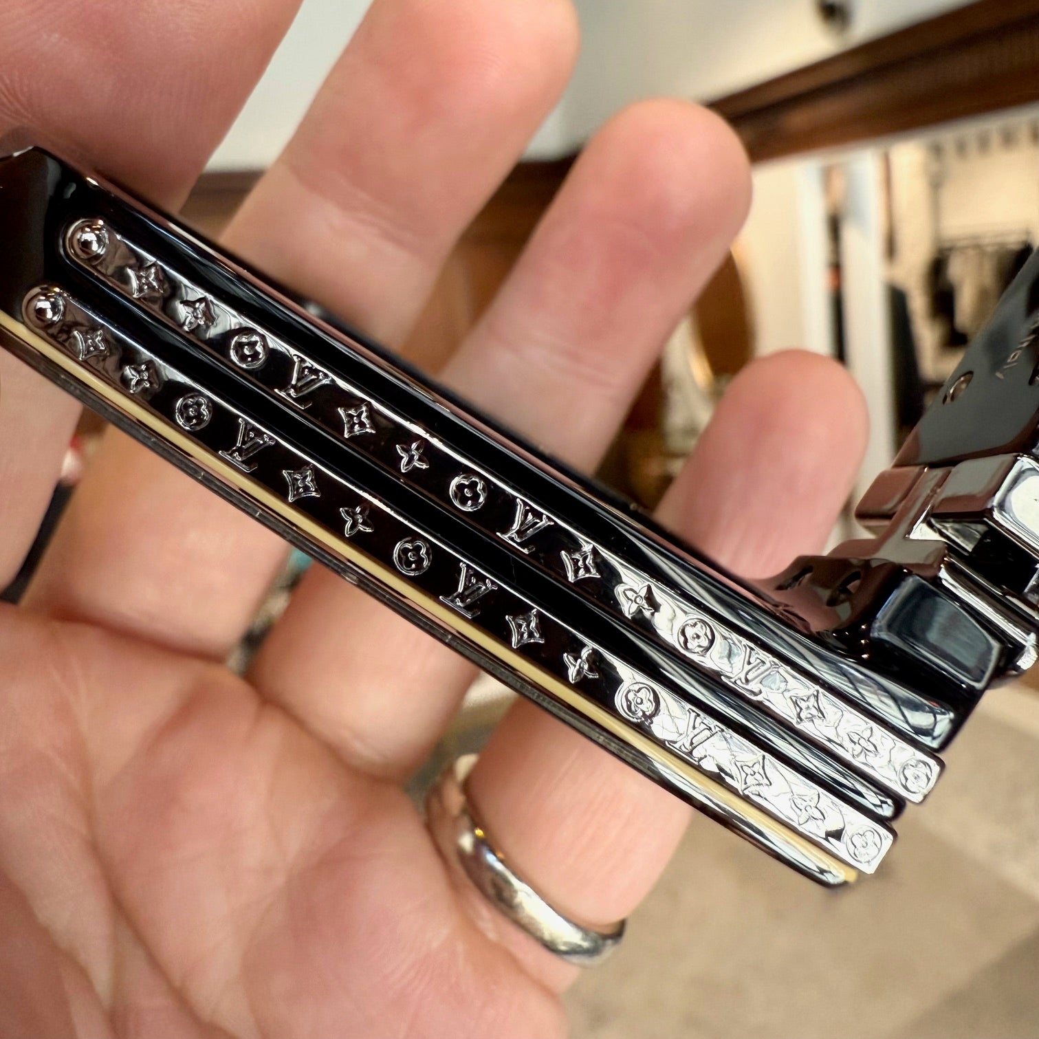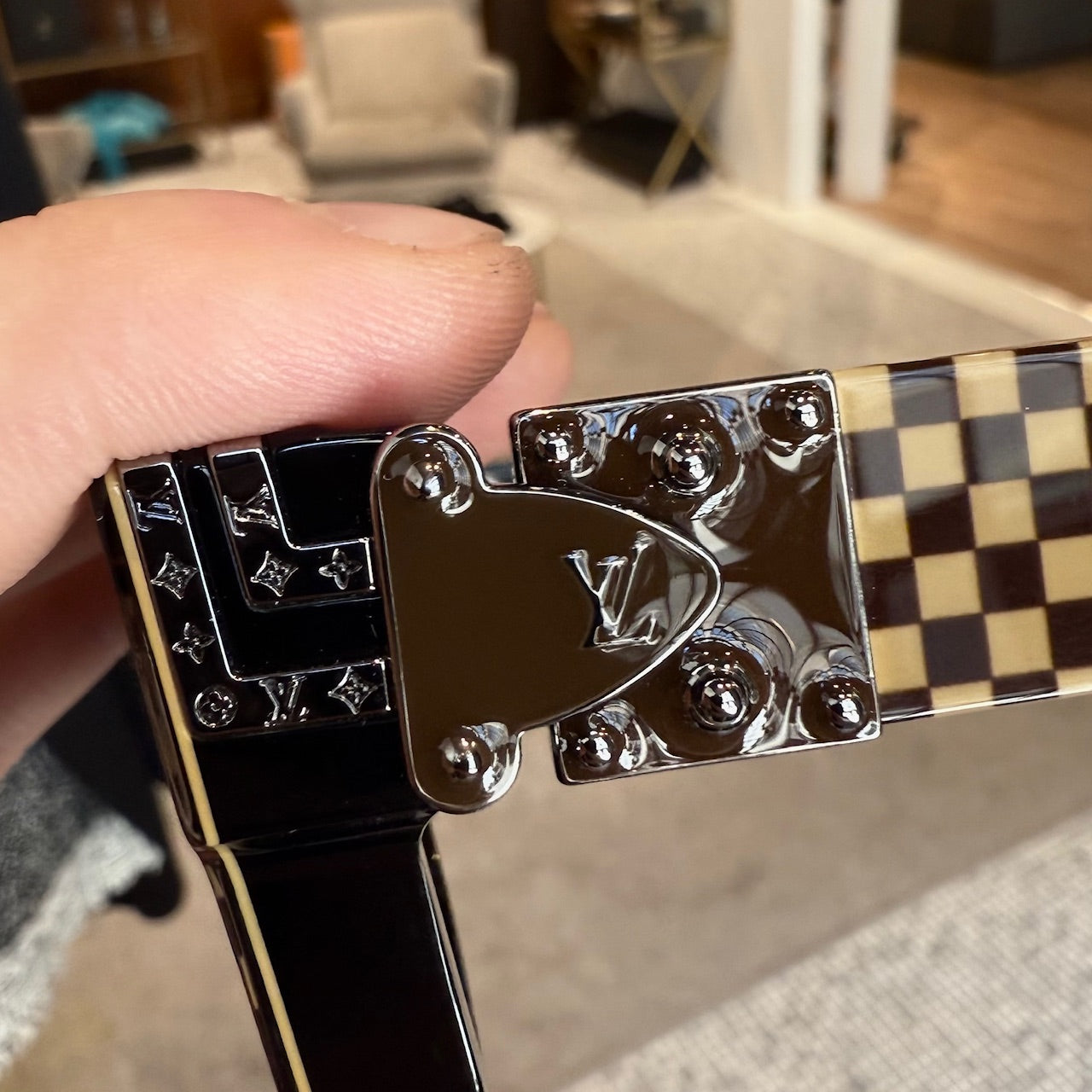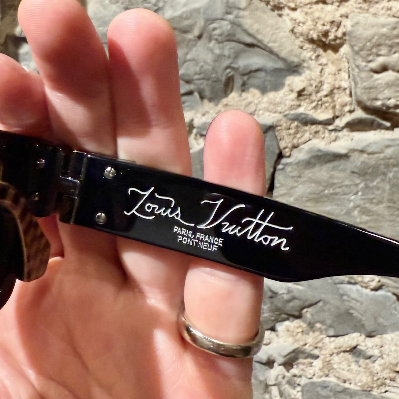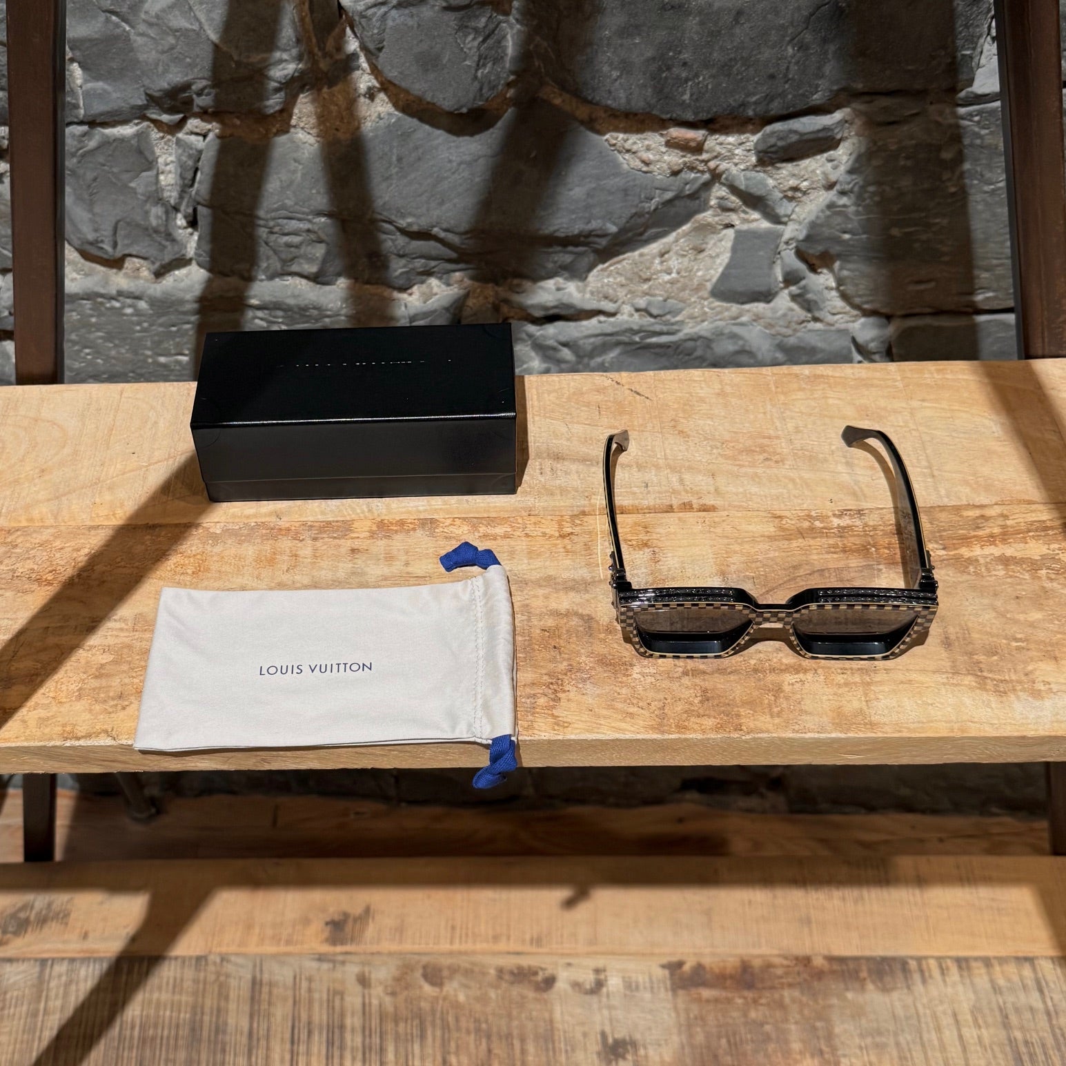 Modèle carré en acétate Damier Pop marron et beige, avec une bande métallique argentée ornée d'une fleur monogramme sur le haut de la monture. Charnières métalliques S-lock inspirées des malles, gravées du monogramme LV. Cercles intérieurs noir mat. Verres noirs gravés du logo LV. Fabriquées en Italie. Livrées avec un étui et une housse de protection Louis Vuitton.