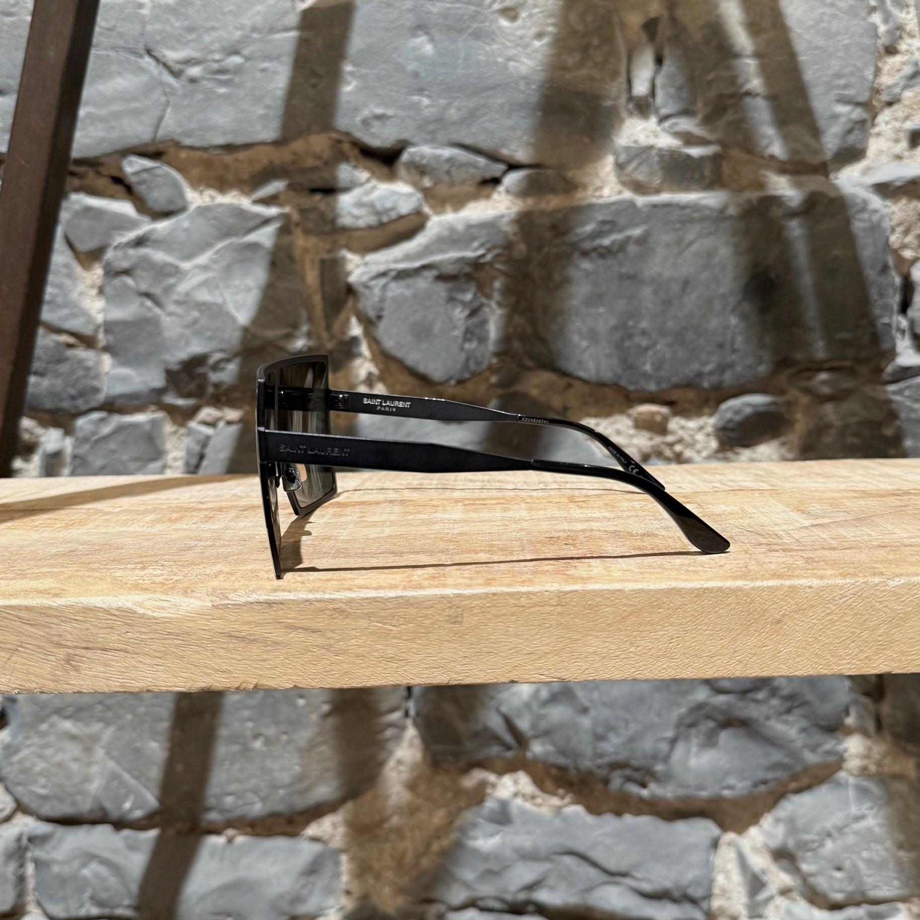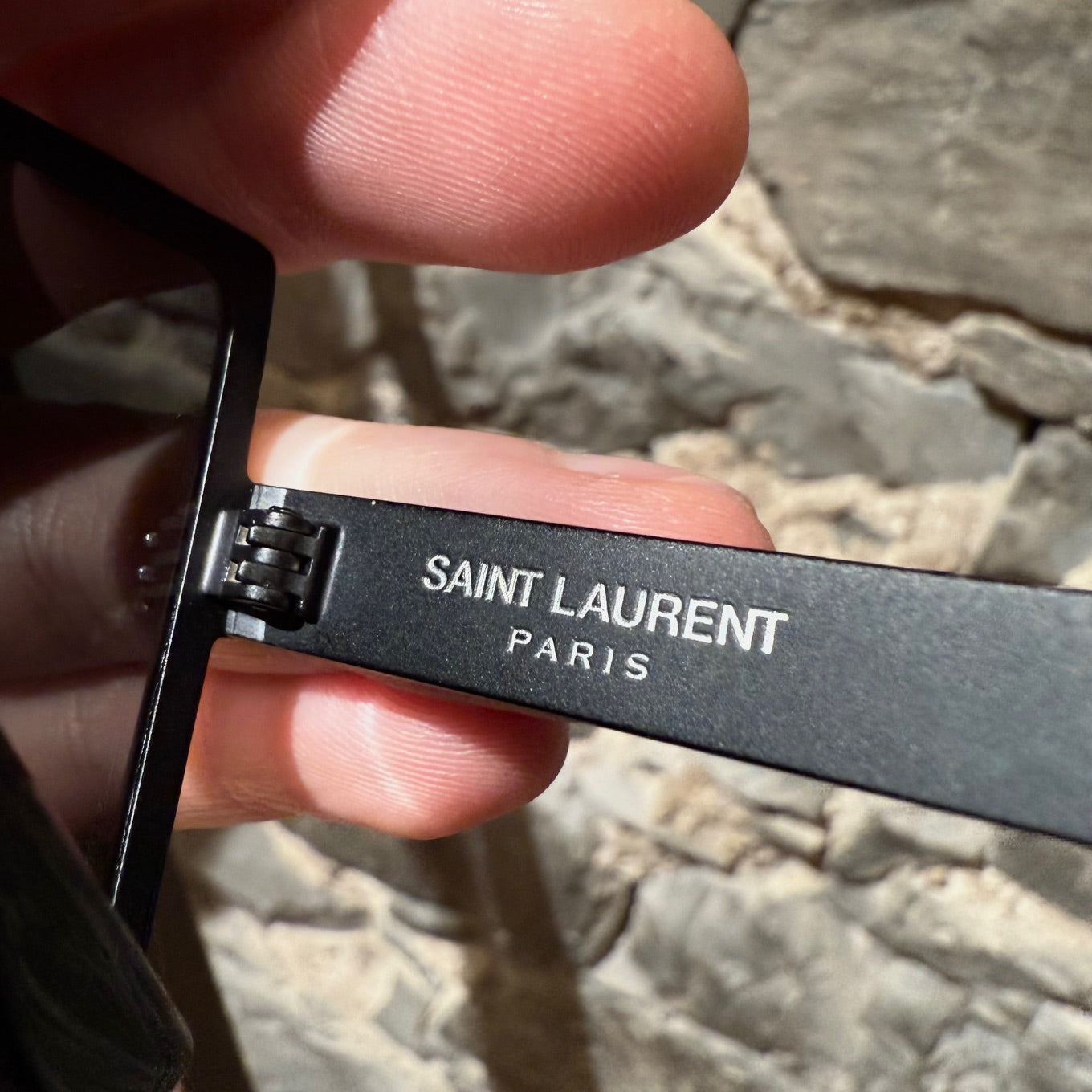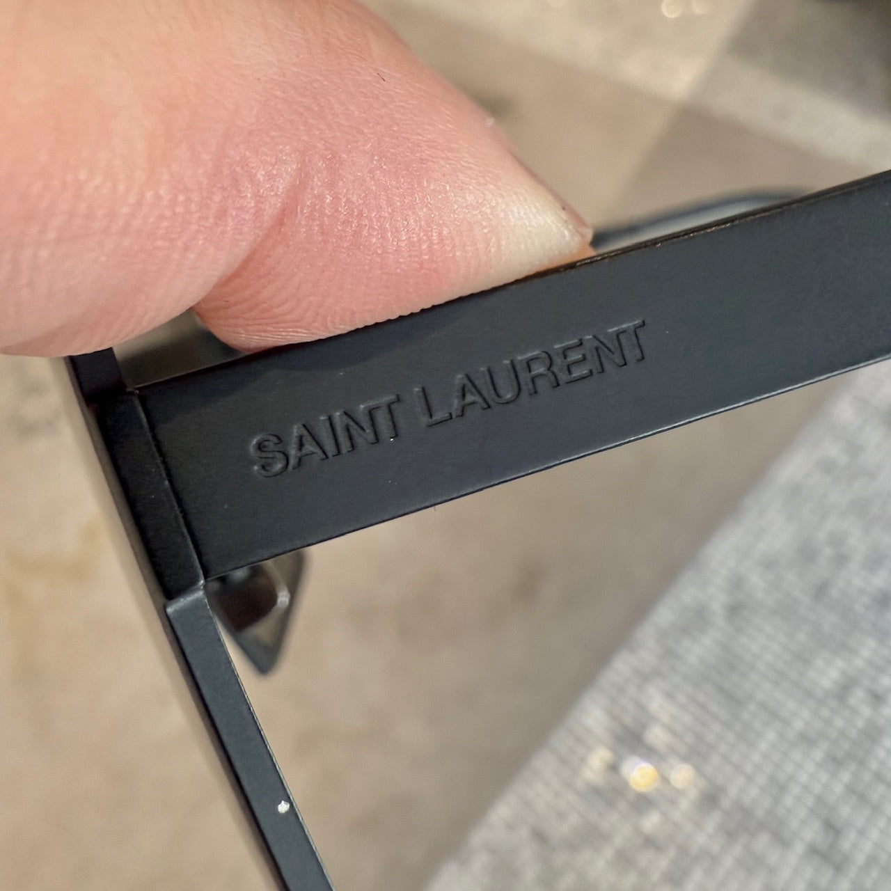 Monture carrée oversize en métal noir mat avec détails argentés. Logo YSL gravé sur le pont intérieur et logo Saint Laurent sur les branches. Verres gris à effet miroir à verres séparés offrant une protection UV à 100 %. Plaquettes de nez réglables en métal. Fabriquées en Italie. Livrées avec un étui Saint-Laurent et un chiffon de nettoyage.