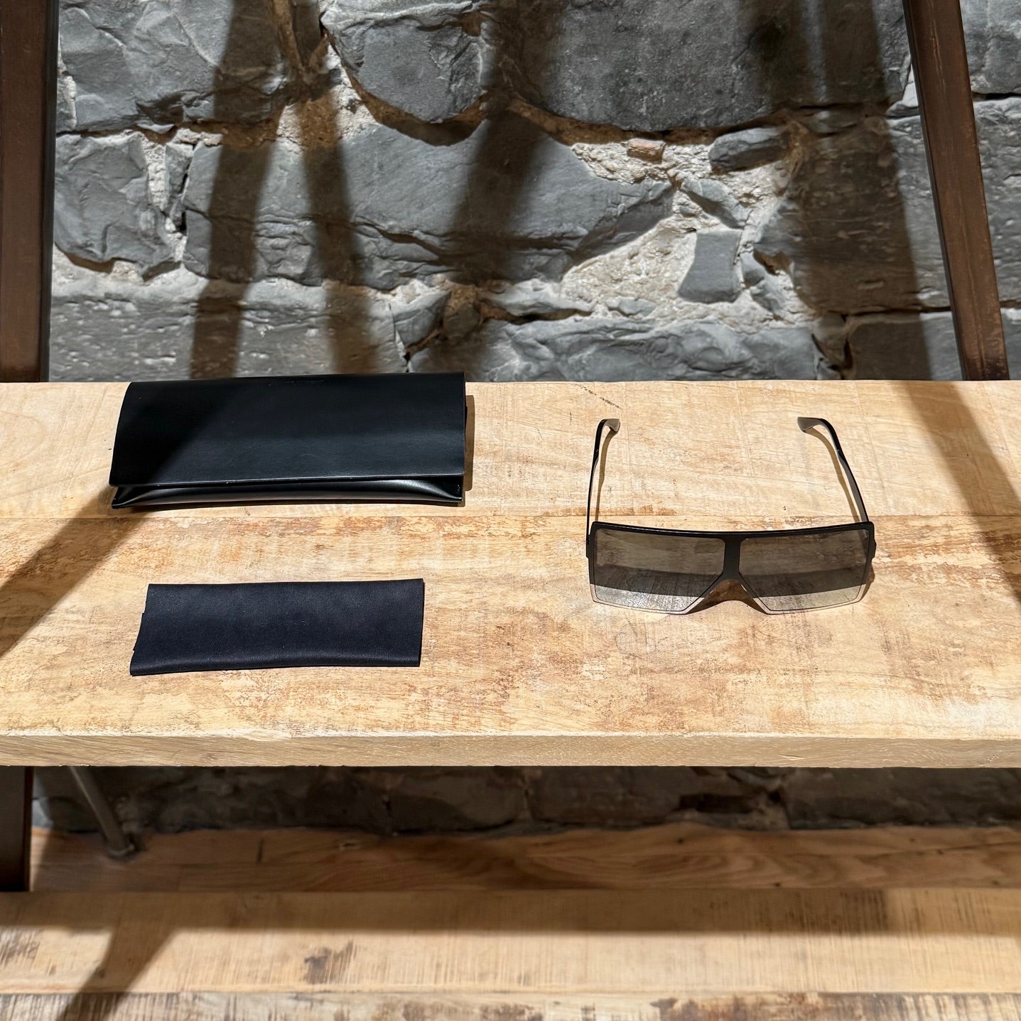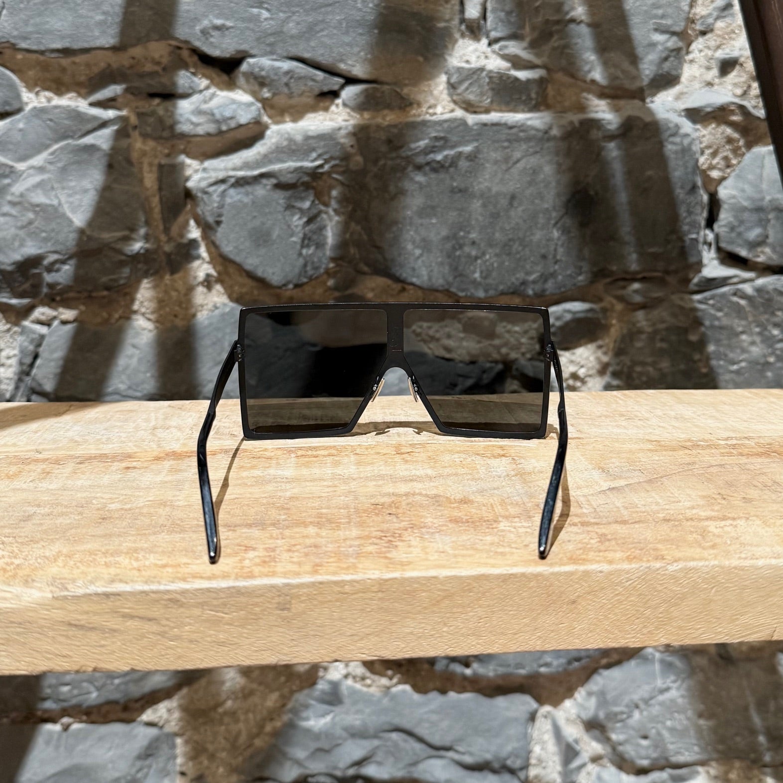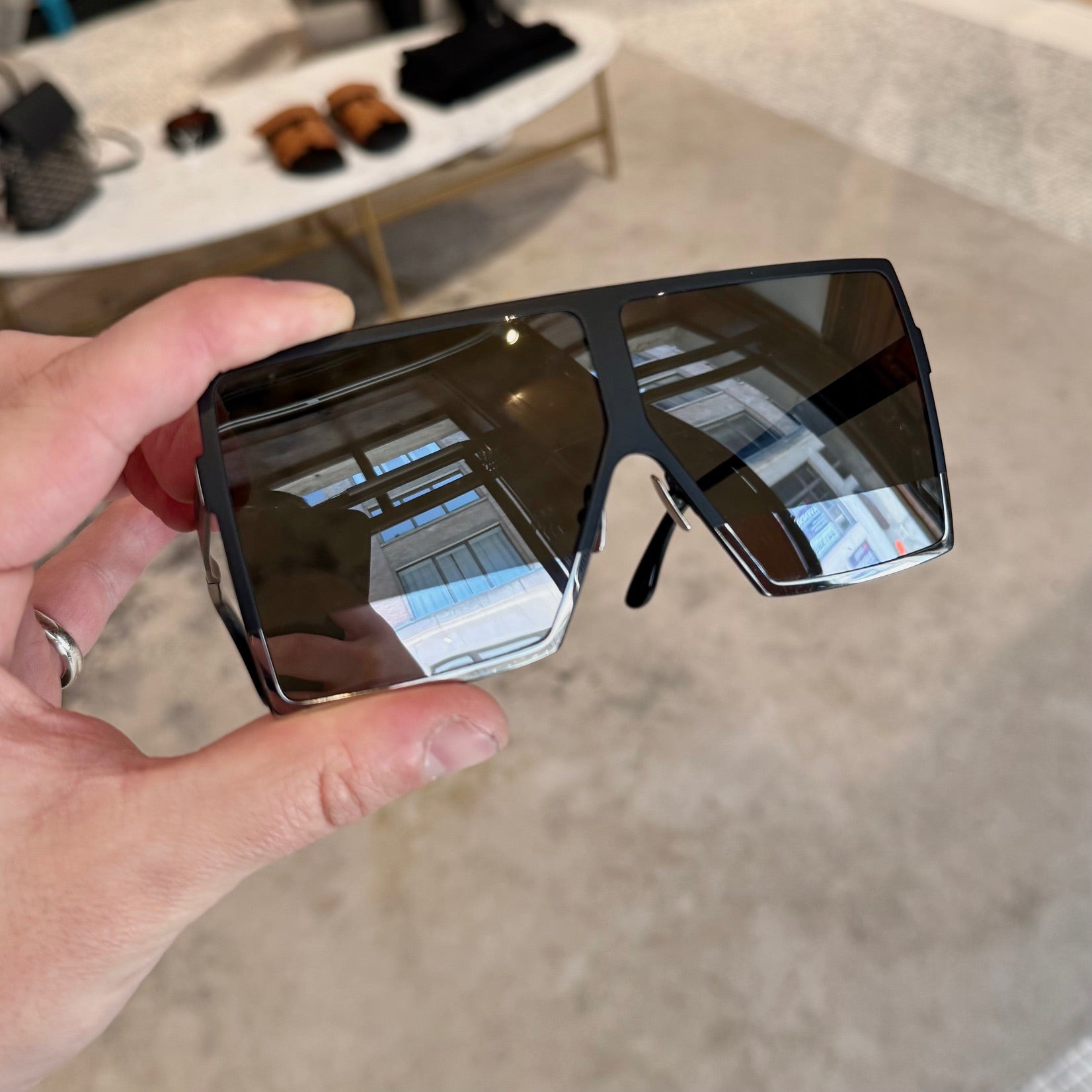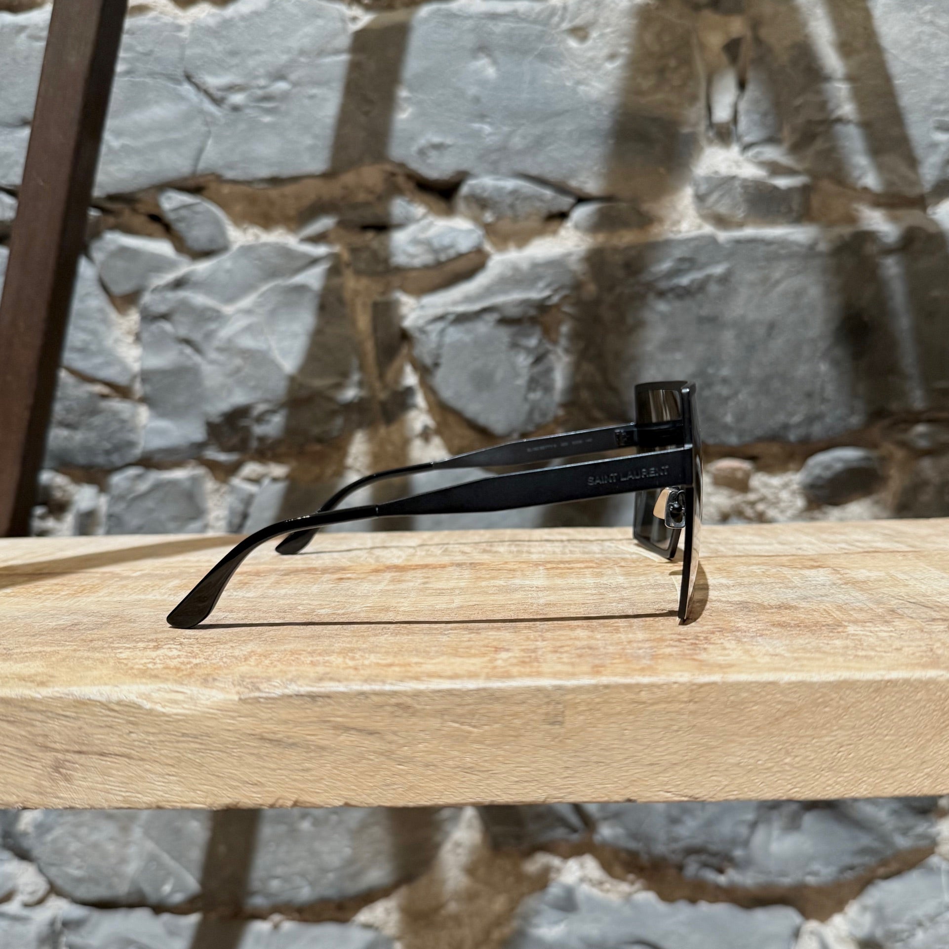 Monture carrée oversize en métal noir mat avec détails argentés. Logo YSL gravé sur le pont intérieur et logo Saint Laurent sur les branches. Verres gris à effet miroir à verres séparés offrant une protection UV à 100 %. Plaquettes de nez réglables en métal. Fabriquées en Italie. Livrées avec un étui Saint-Laurent et un chiffon de nettoyage.