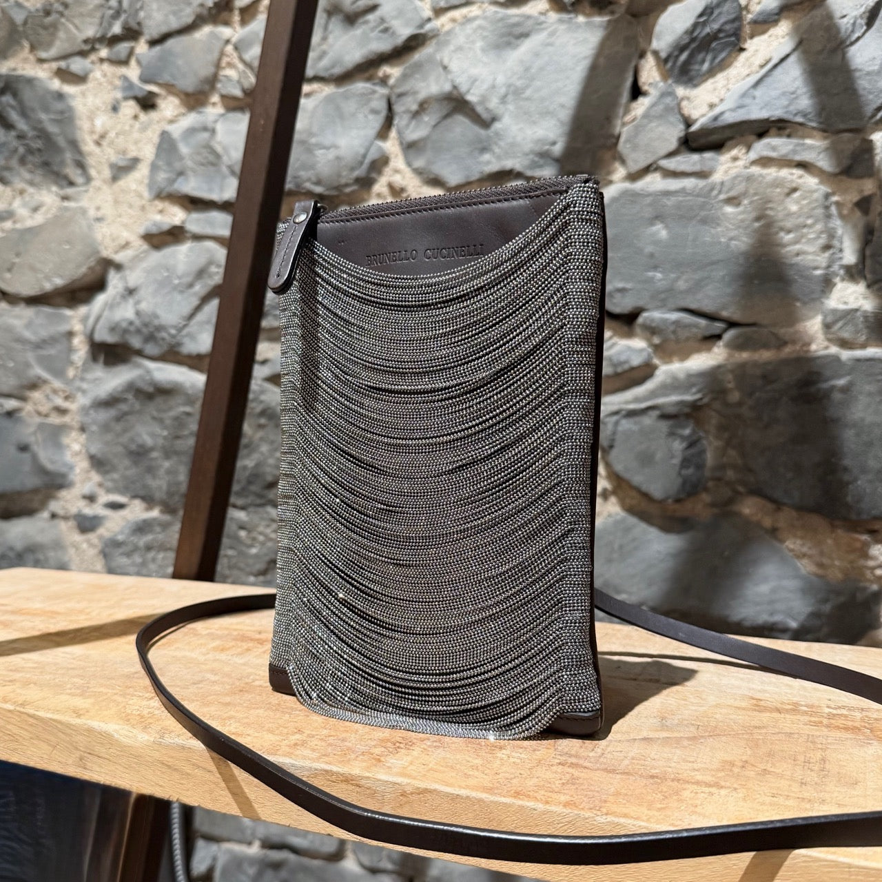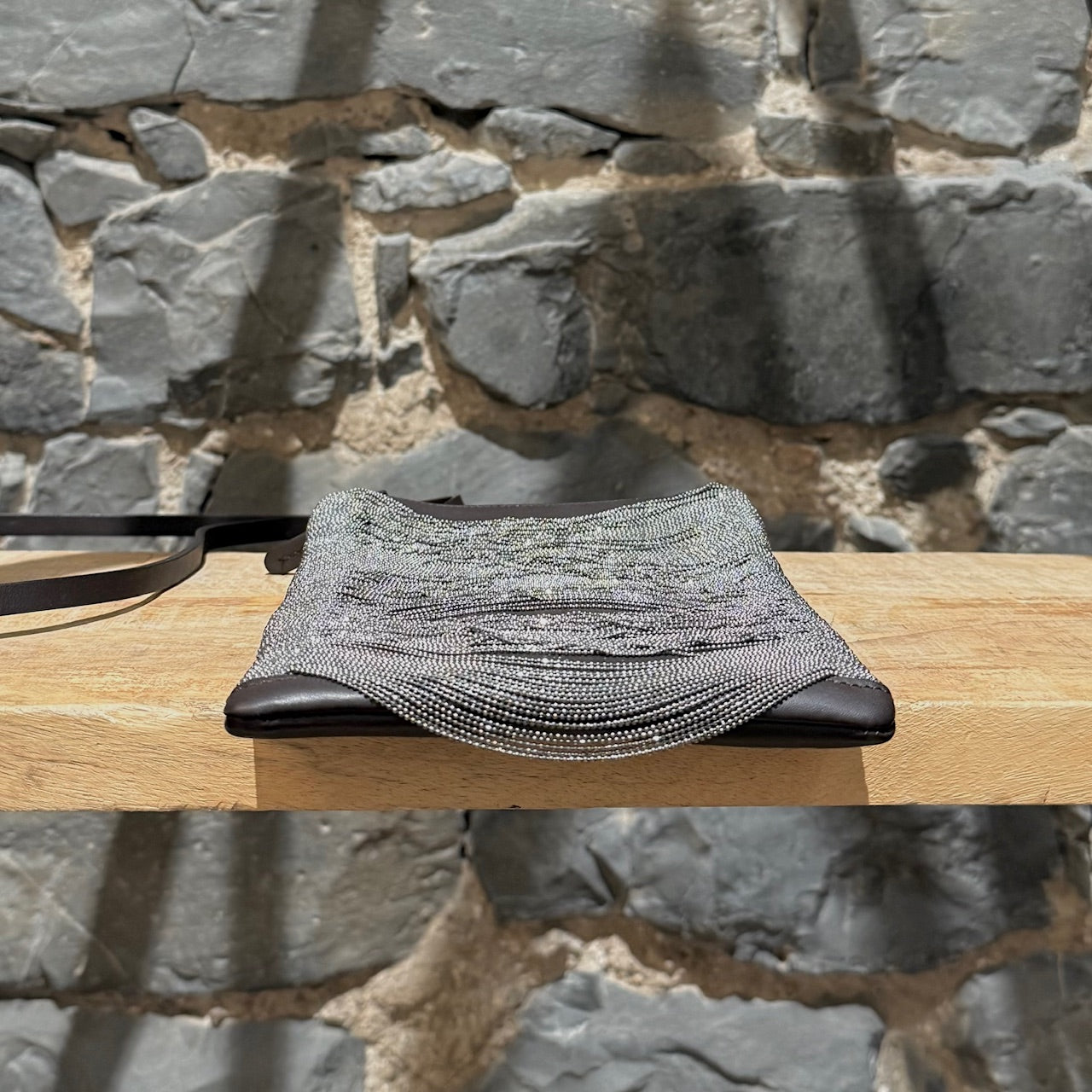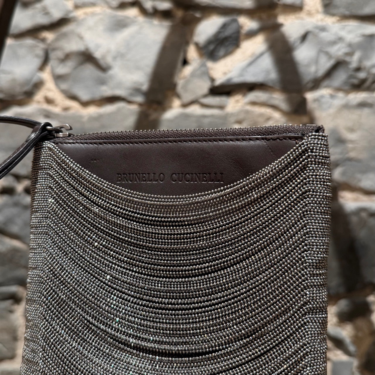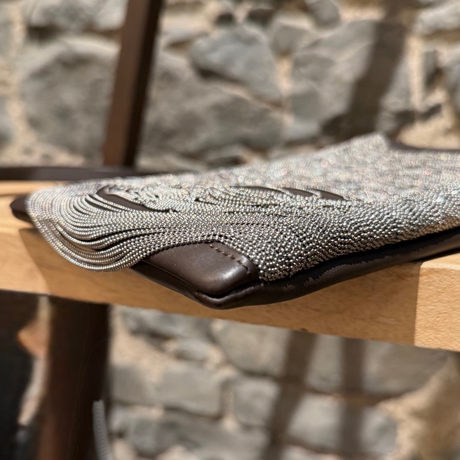 Conception rectangulaire plate et compacte. Corps en cuir brun foncé. Logo de la maison embossé sur le dessus. Panneau avant couvert de franges monili perlées disposées en courbes superposées. Dos en cuir ton sur ton. Fermeture supérieure zippée avec tirette en cuir. Bretelle bandoulière fine en cuir. Intérieur en satin foncé avec une poche plaquée. Étiquette intérieure Brunello Cucinelli emblématique. Fait en Italie. Livré tel quel.