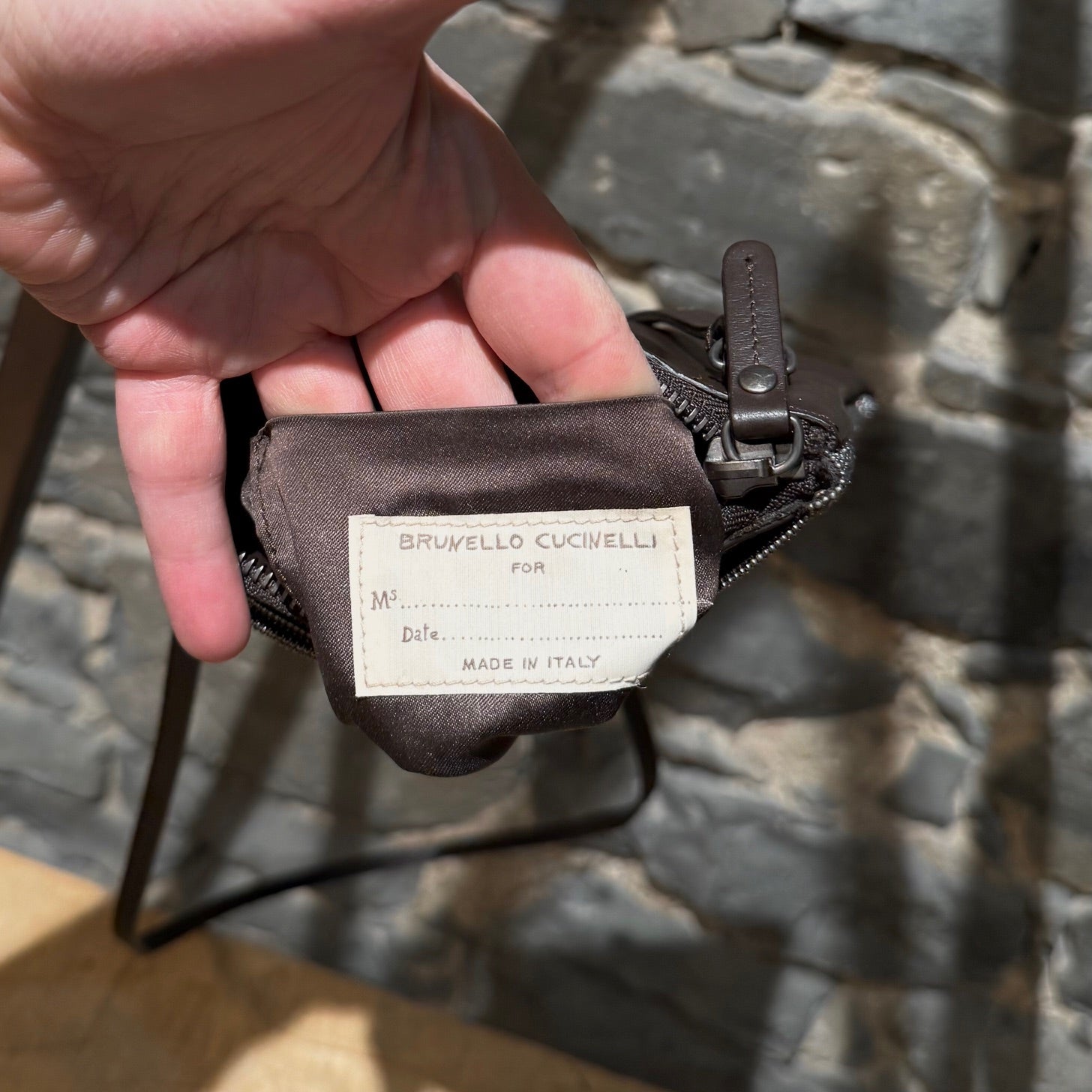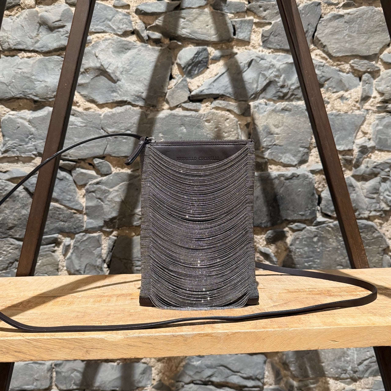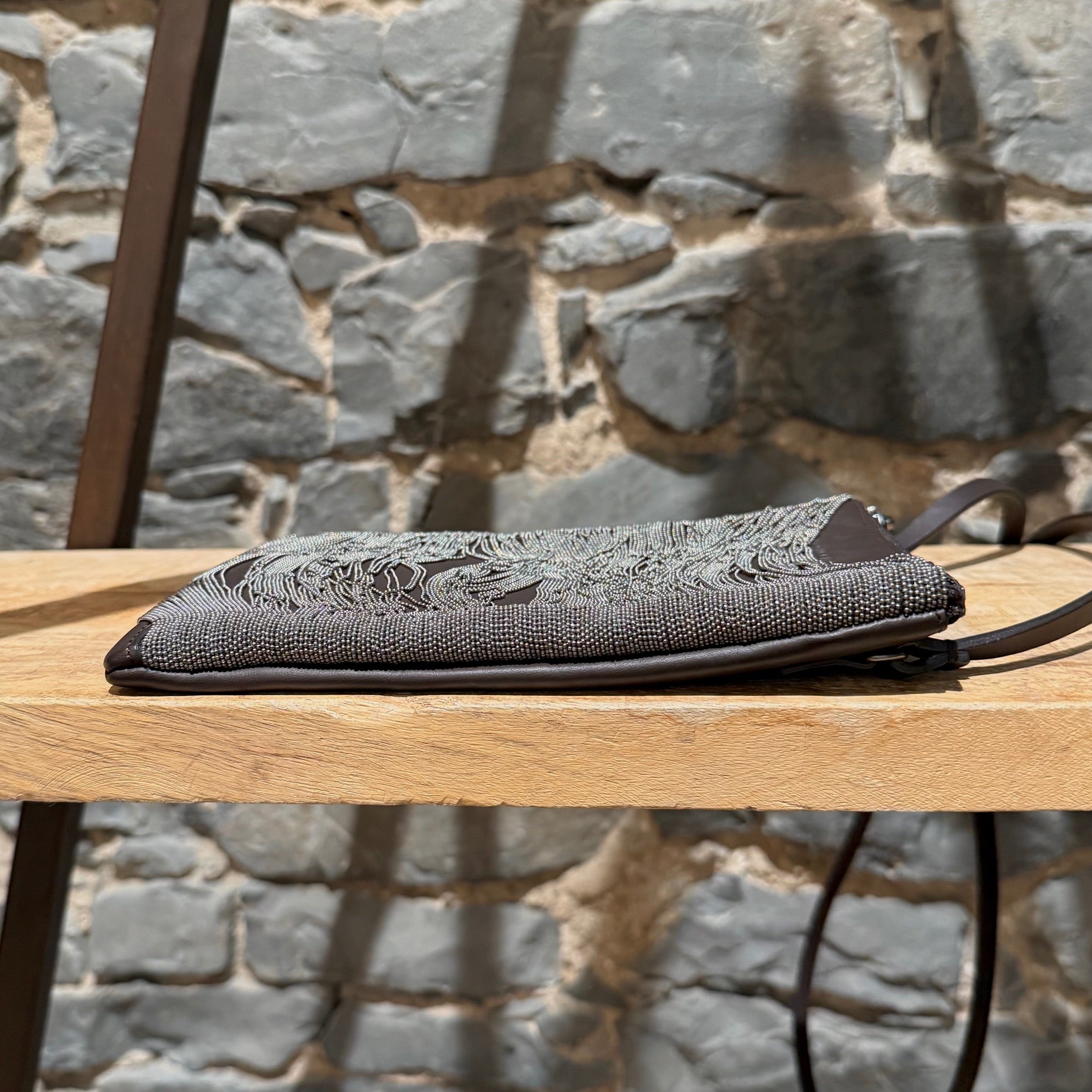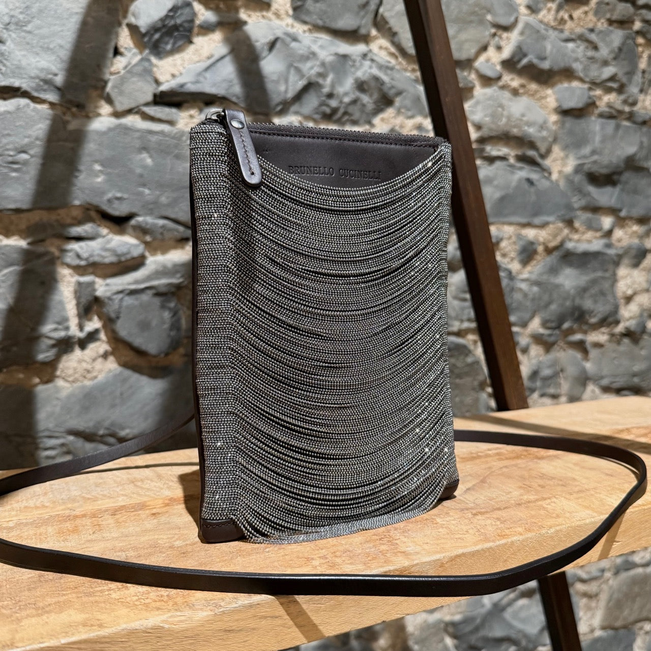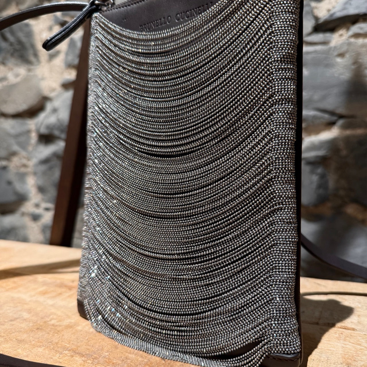 Conception rectangulaire plate et compacte. Corps en cuir brun foncé. Logo de la maison embossé sur le dessus. Panneau avant couvert de franges monili perlées disposées en courbes superposées. Dos en cuir ton sur ton. Fermeture supérieure zippée avec tirette en cuir. Bretelle bandoulière fine en cuir. Intérieur en satin foncé avec une poche plaquée. Étiquette intérieure Brunello Cucinelli emblématique. Fait en Italie. Livré tel quel.