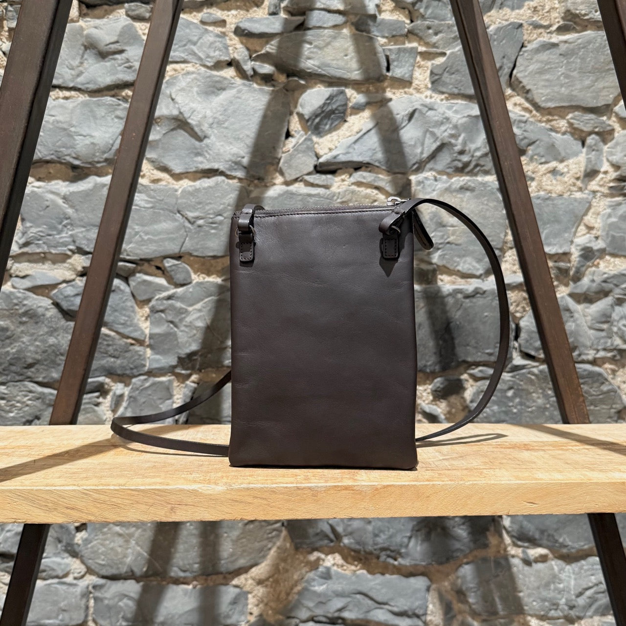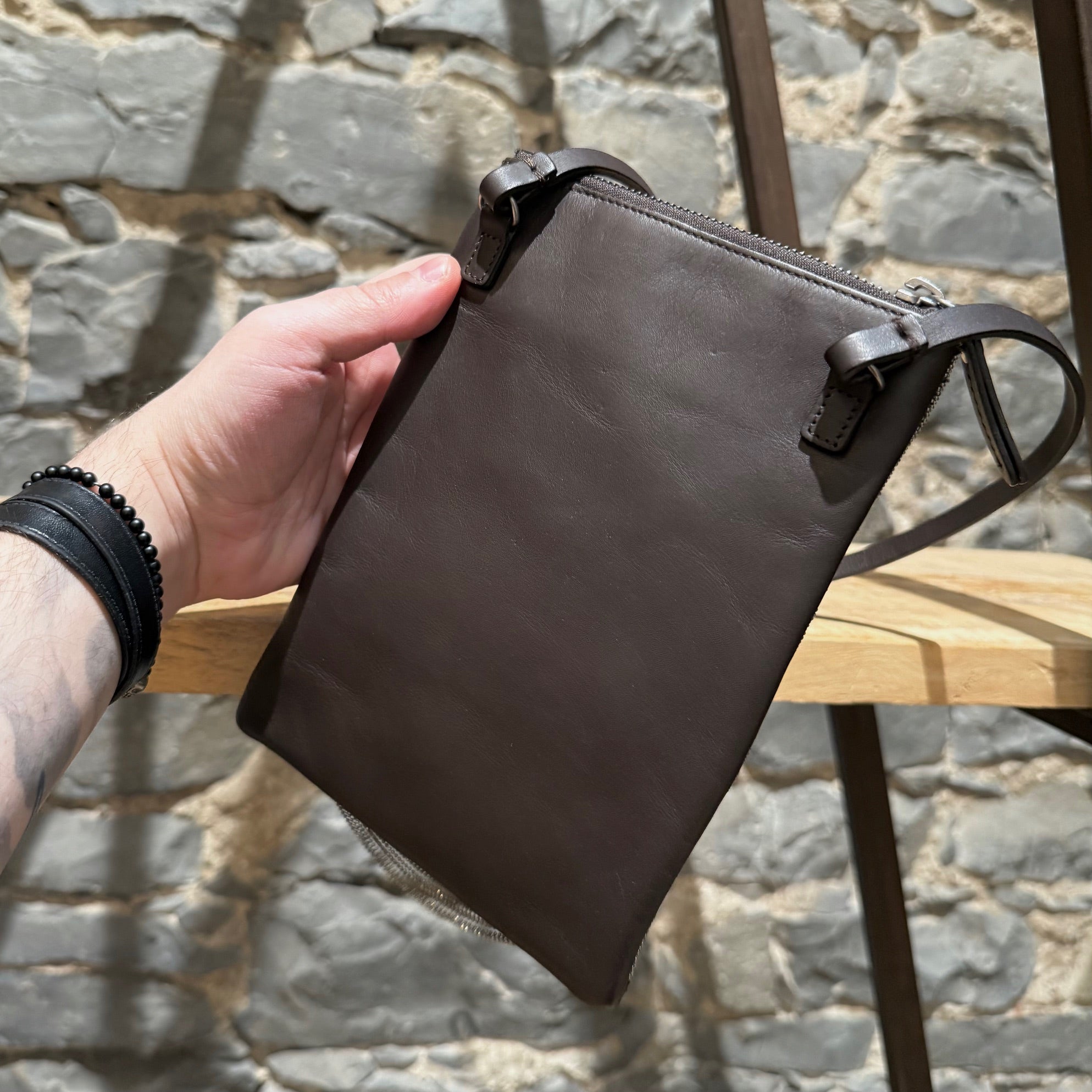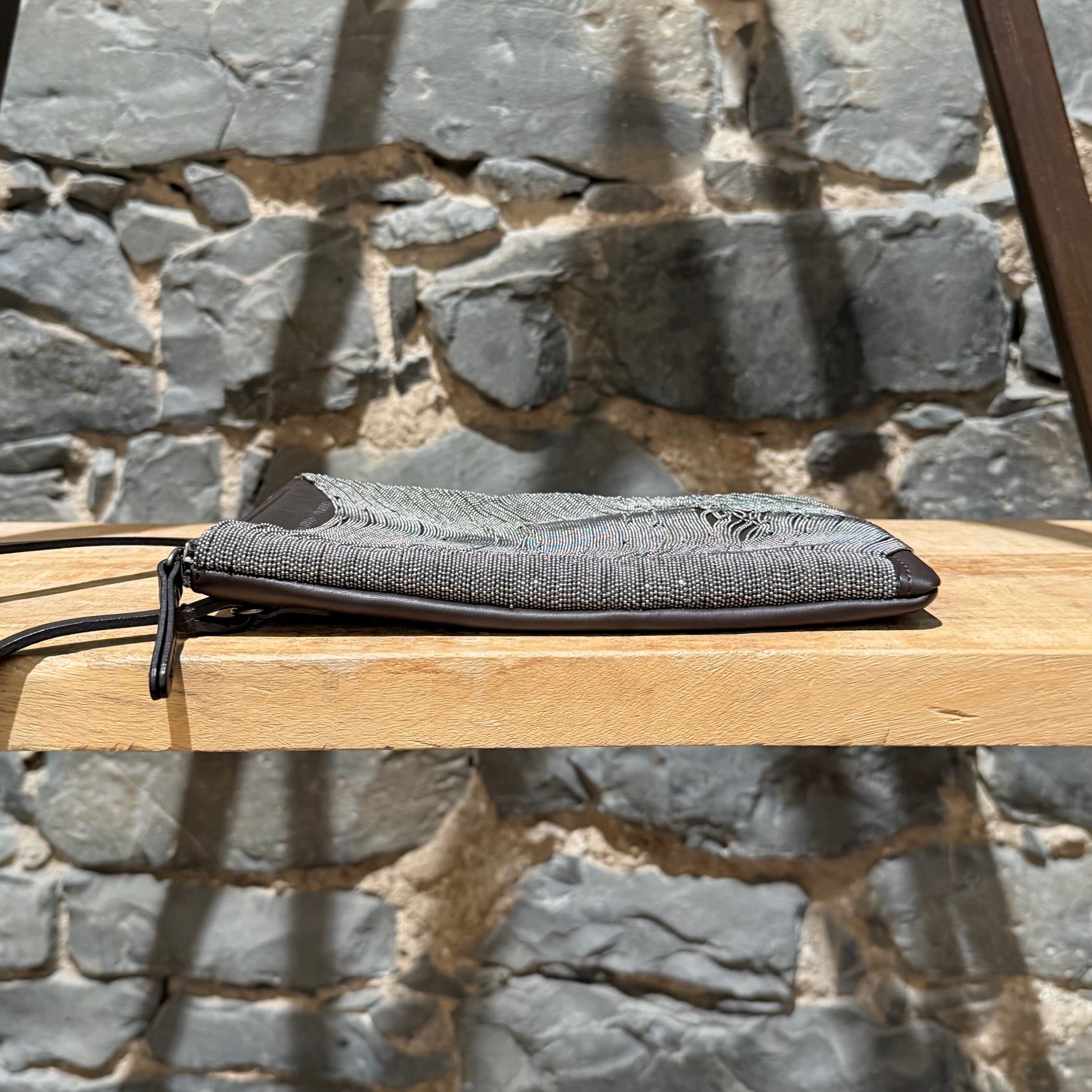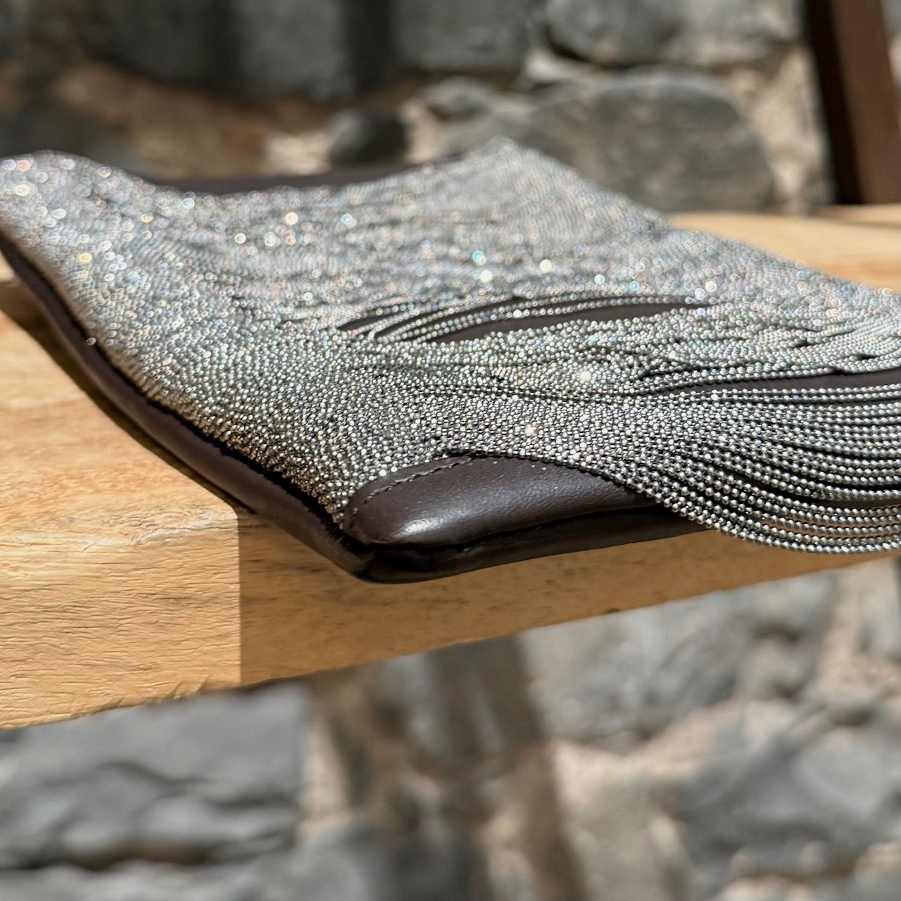 Conception rectangulaire plate et compacte. Corps en cuir brun foncé. Logo de la maison embossé sur le dessus. Panneau avant couvert de franges monili perlées disposées en courbes superposées. Dos en cuir ton sur ton. Fermeture supérieure zippée avec tirette en cuir. Bretelle bandoulière fine en cuir. Intérieur en satin foncé avec une poche plaquée. Étiquette intérieure Brunello Cucinelli emblématique. Fait en Italie. Livré tel quel.