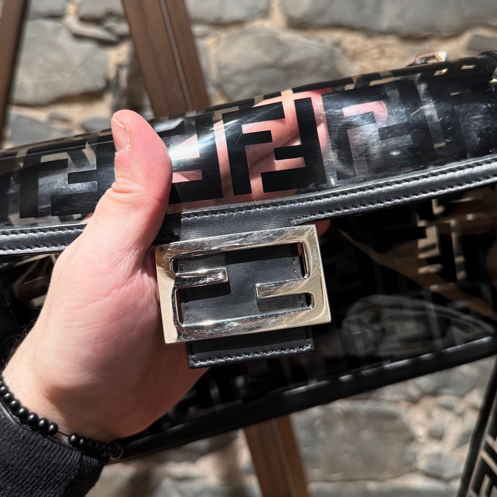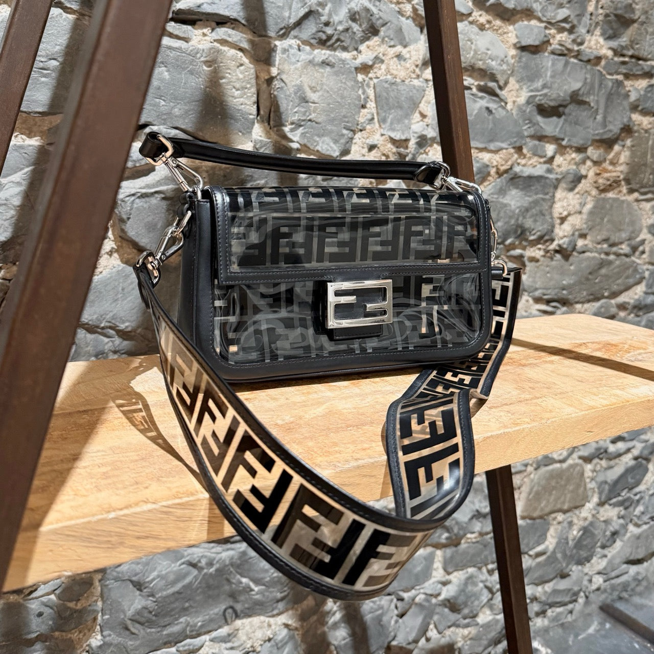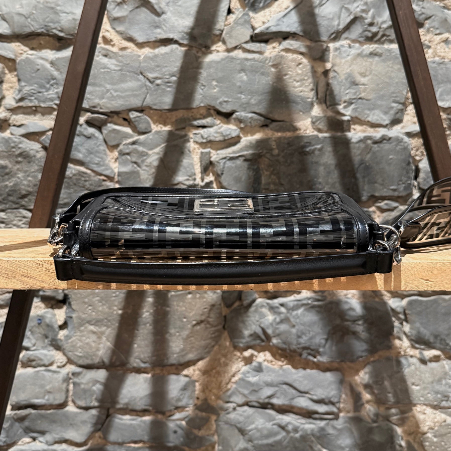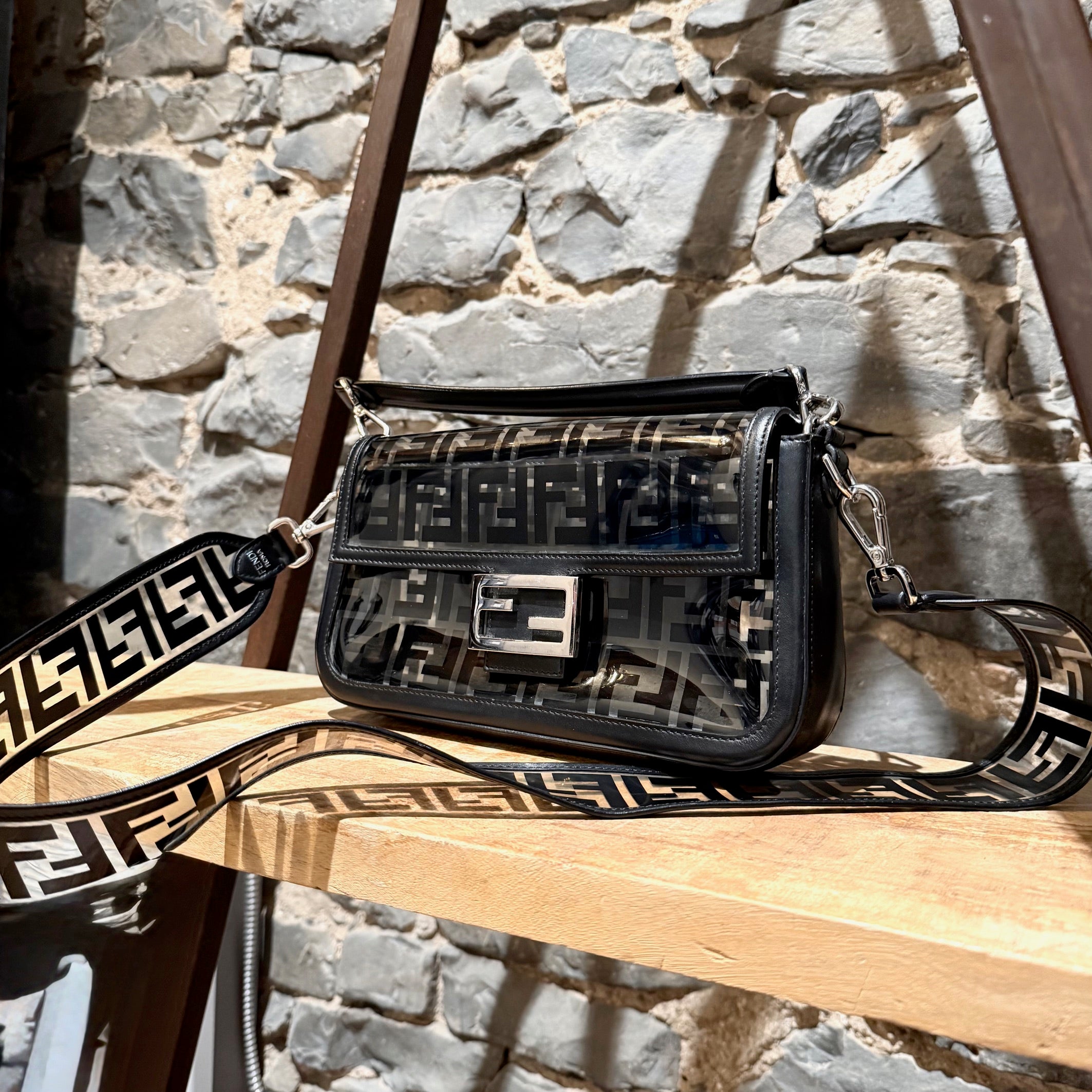 Medium iconic baguette design. Clear PVC exterior with black FF Zucca motif. Black smooth leather trim, edges, base, and flap lining. Front flap with FF metal logo magnetic snap closure. Branded silver-tone hardware. Detachable wide clear PVC FF Zucca shoulder strap. Detachable slim black leather top handle. Shoulder or crossbody wear. Single main compartment. Black leather interior lining with flat pocket and snap closure. . Made in Italy. Comes as is.