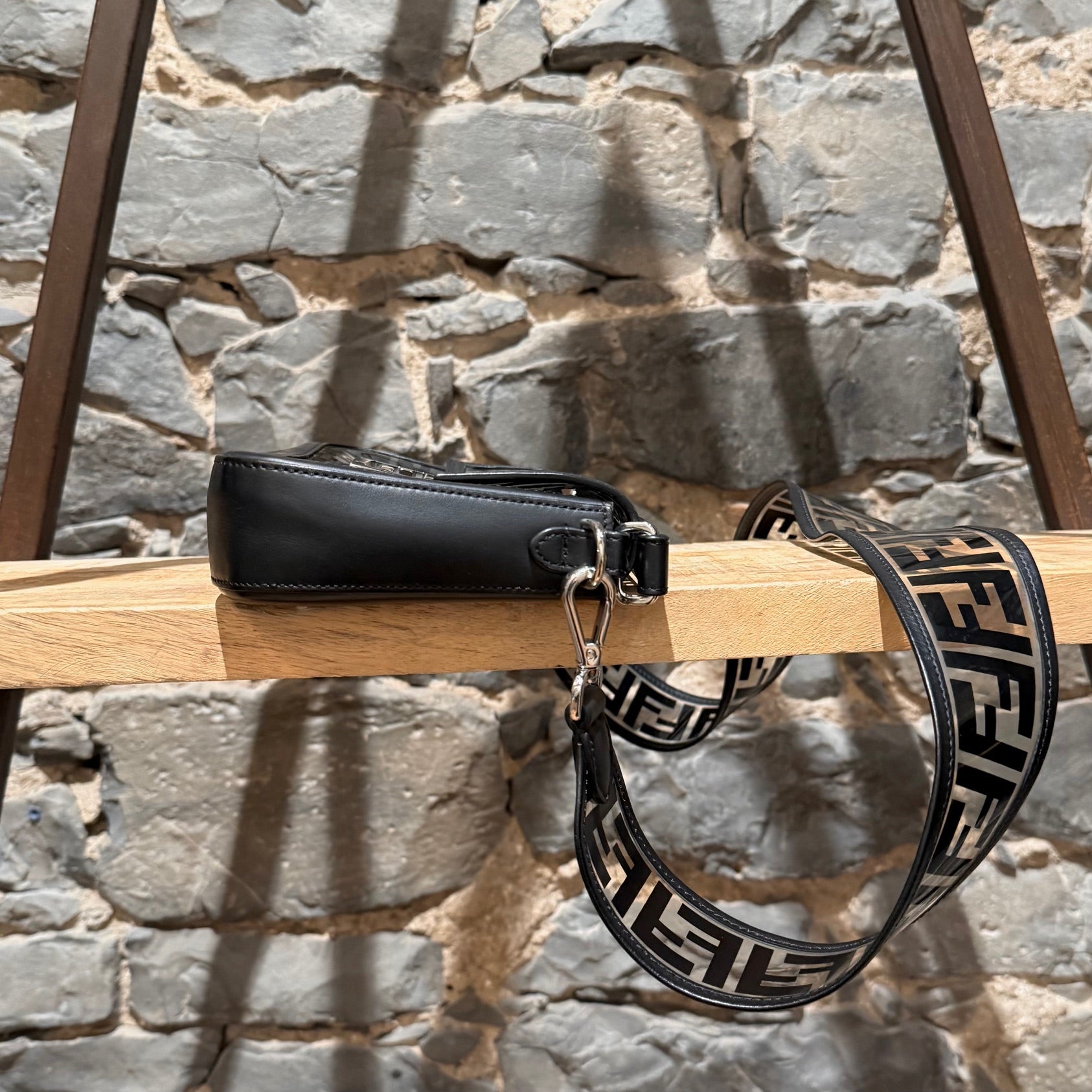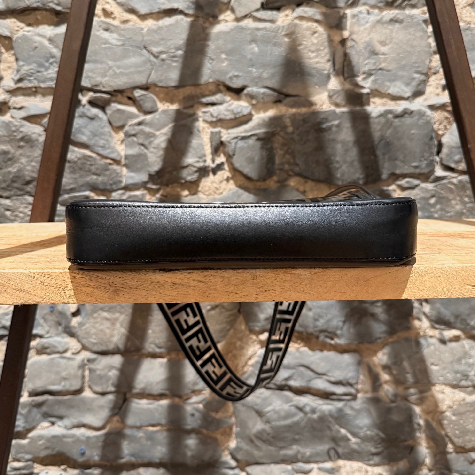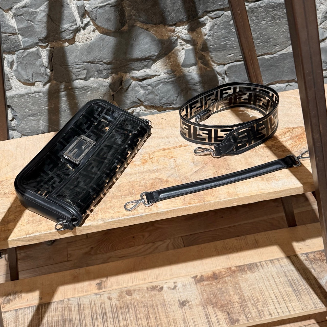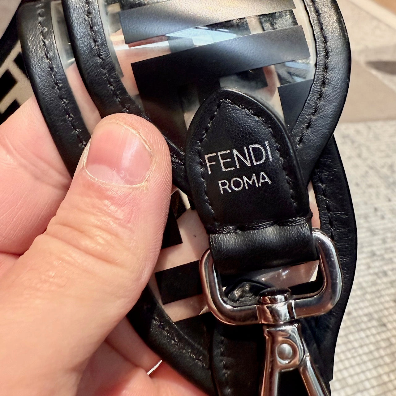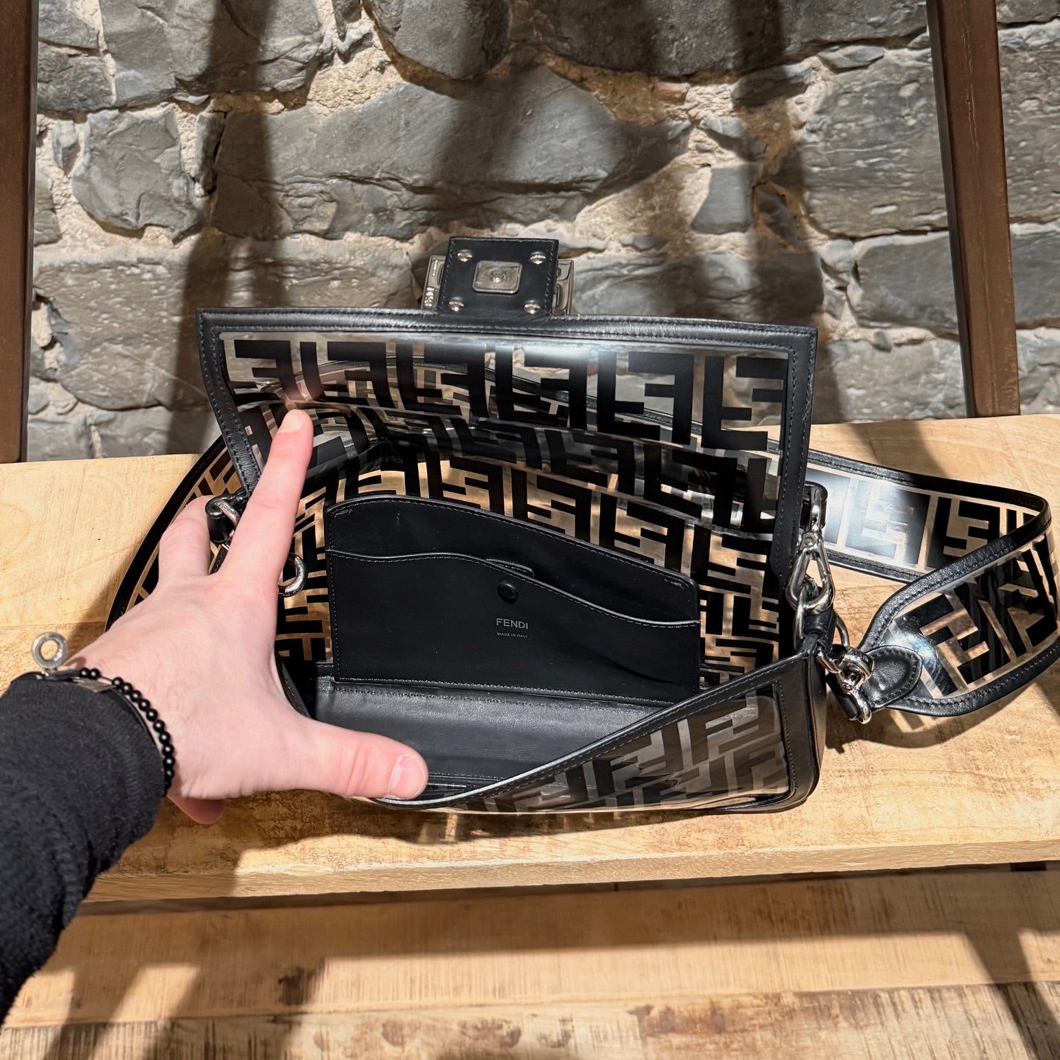 Medium iconic baguette design. Clear PVC exterior with black FF Zucca motif. Black smooth leather trim, edges, base, and flap lining. Front flap with FF metal logo magnetic snap closure. Branded silver-tone hardware. Detachable wide clear PVC FF Zucca shoulder strap. Detachable slim black leather top handle. Shoulder or crossbody wear. Single main compartment. Black leather interior lining with flat pocket and snap closure. . Made in Italy. Comes as is.