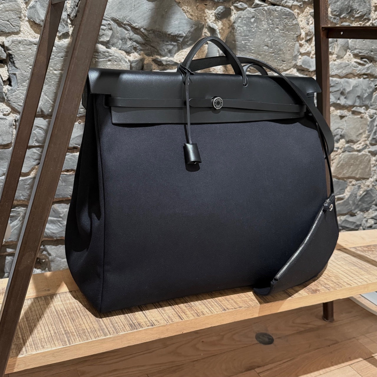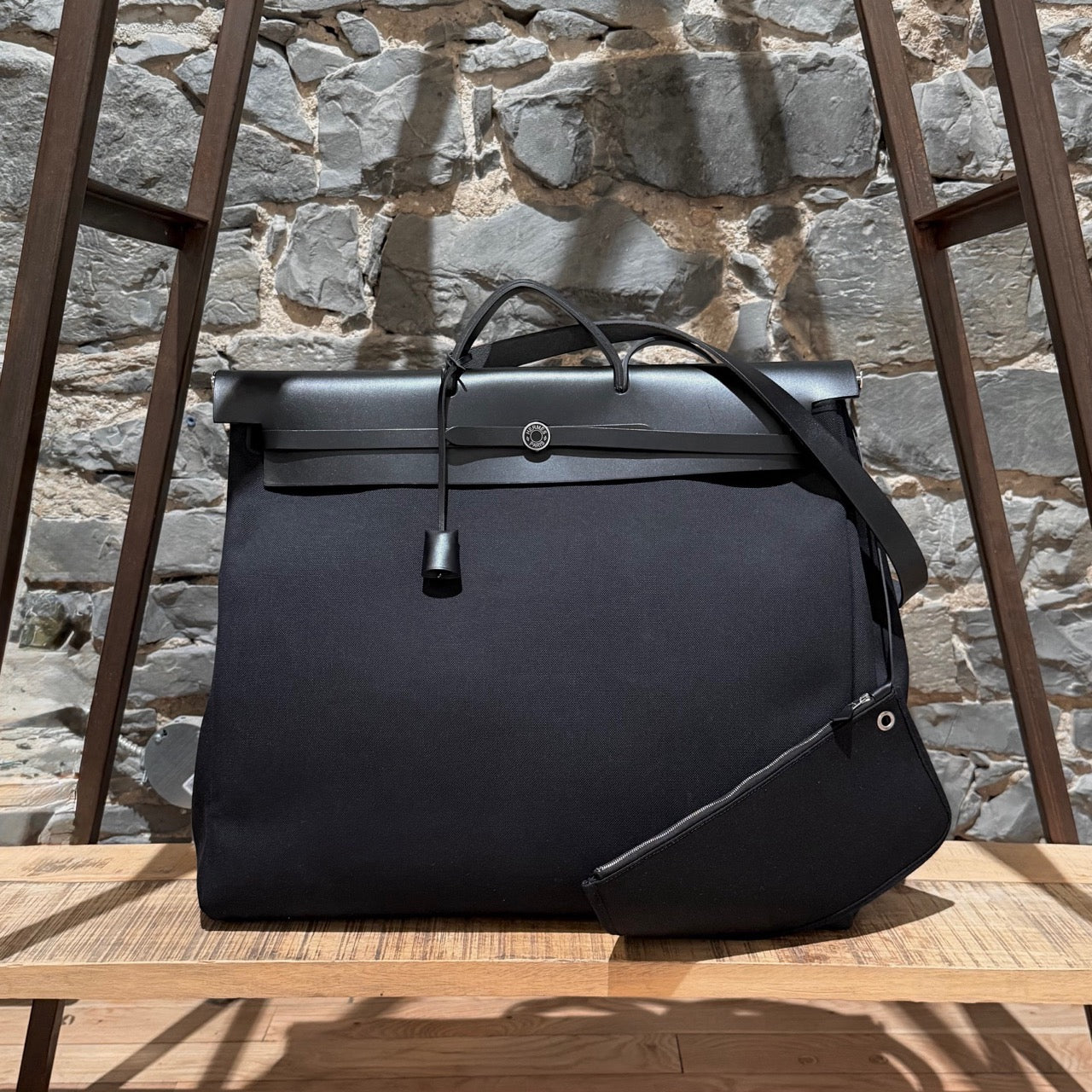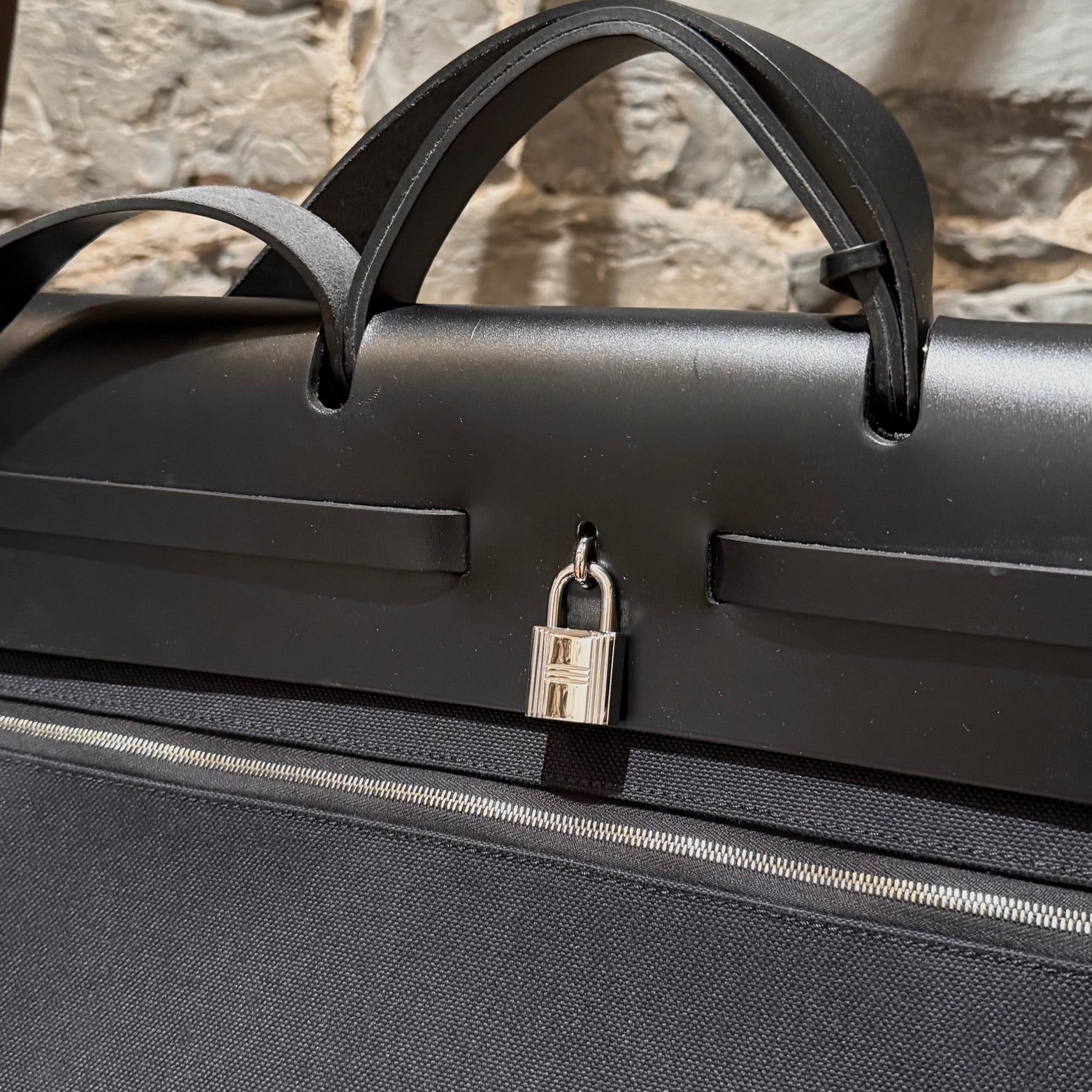 Silhouette de voyage structurée et grand format en toile Officier noire avec rabat supérieur, poignée et courroie d’épaule en cuir Vache Hunter noir. Fermeture avant à bride coulissante en cuir avec bouton clou de selle Hermès Paris. Quincaillerie en métal palladié avec cadenas assorti. Longue courroie en cuir munie d’une clochette et d’une clé assortie. Pochette détachable zippée en toile avec étiquette Hermès intérieure. Poche extérieure arrière zippée. Structure supérieure renforcée en cuir. Intérieur très spacieux non doublé. Estampille Y – 2020. Fait en France. Livré tel quel.