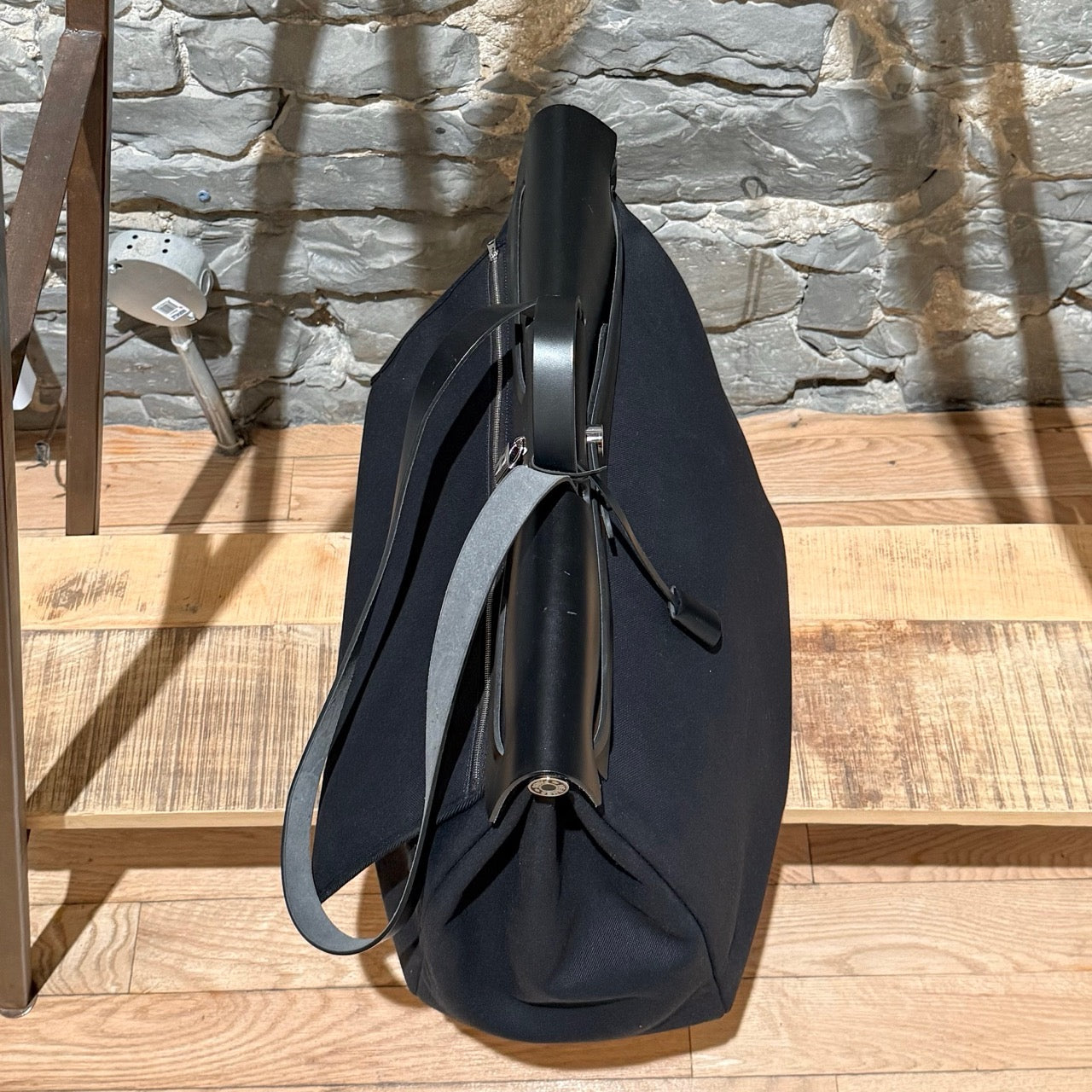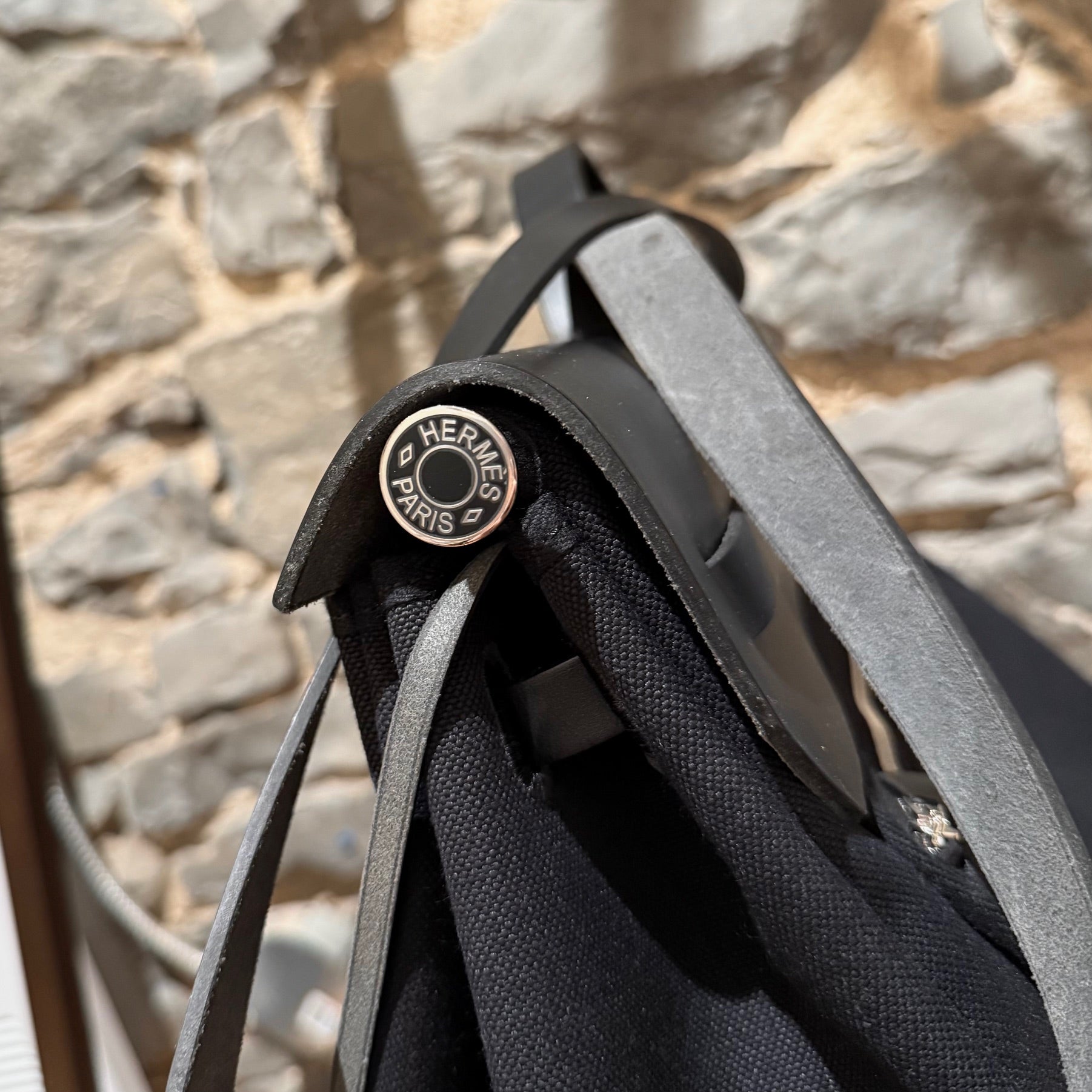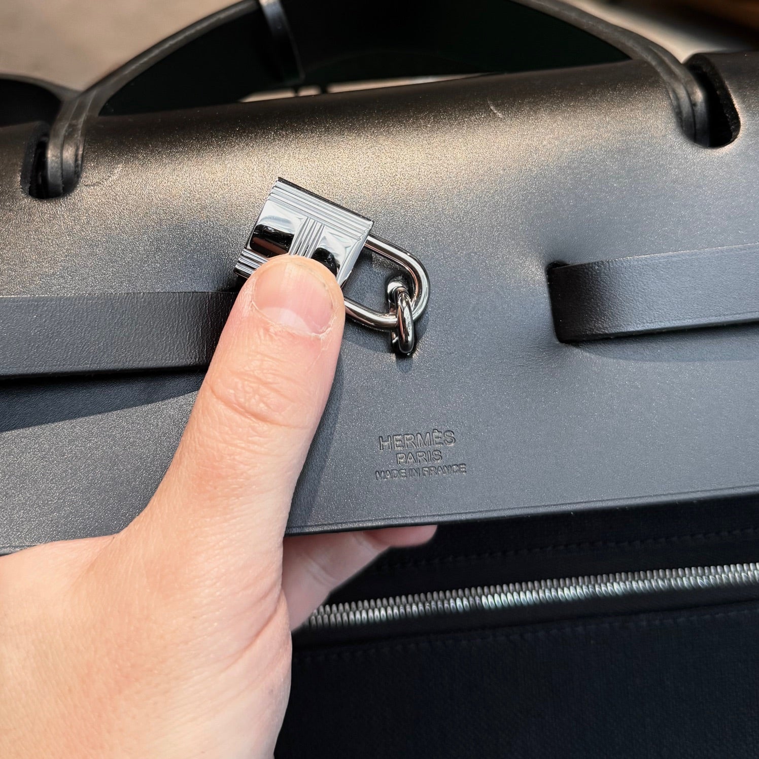 Silhouette de voyage structurée et grand format en toile Officier noire avec rabat supérieur, poignée et courroie d’épaule en cuir Vache Hunter noir. Fermeture avant à bride coulissante en cuir avec bouton clou de selle Hermès Paris. Quincaillerie en métal palladié avec cadenas assorti. Longue courroie en cuir munie d’une clochette et d’une clé assortie. Pochette détachable zippée en toile avec étiquette Hermès intérieure. Poche extérieure arrière zippée. Structure supérieure renforcée en cuir. Intérieur très spacieux non doublé. Estampille Y – 2020. Fait en France. Livré tel quel.