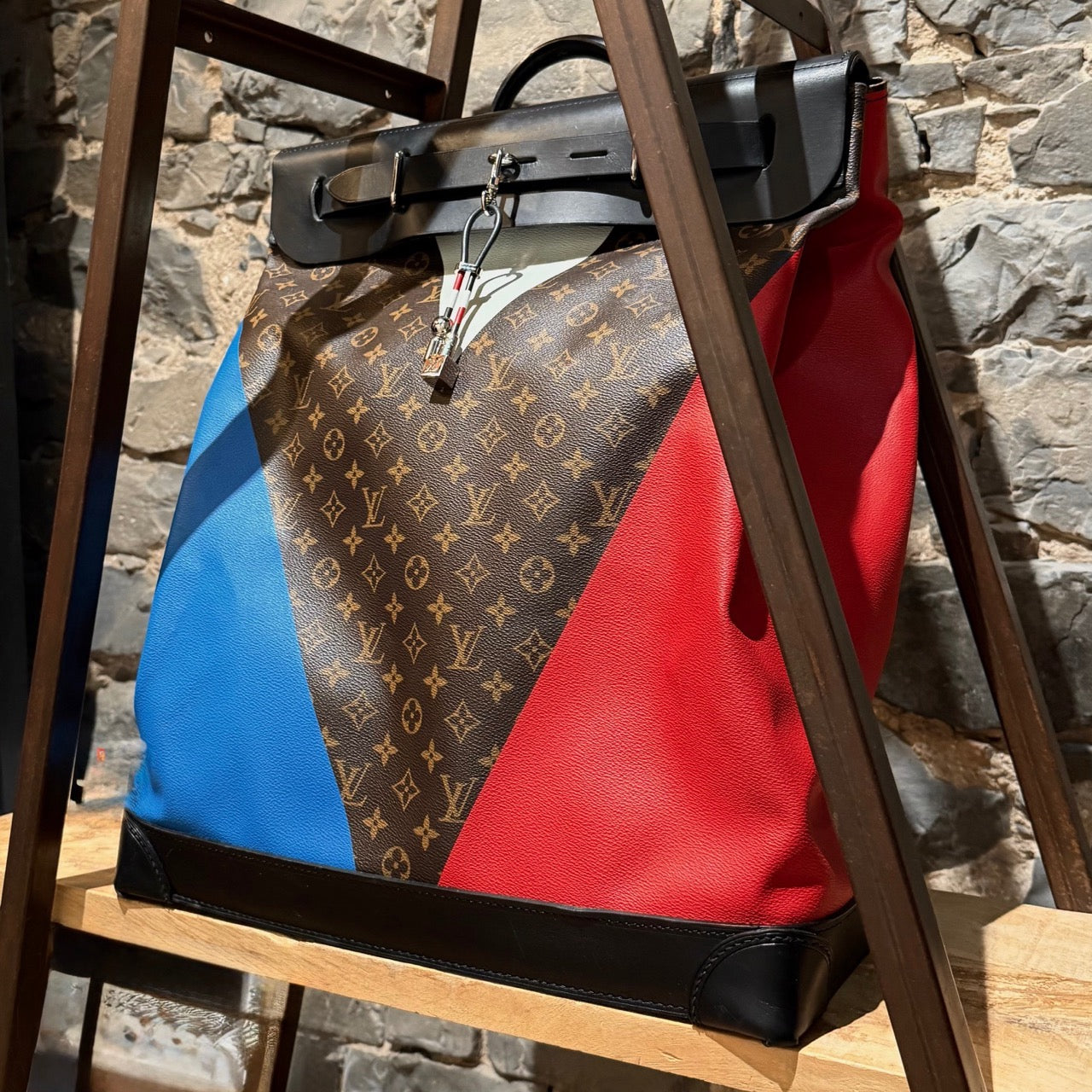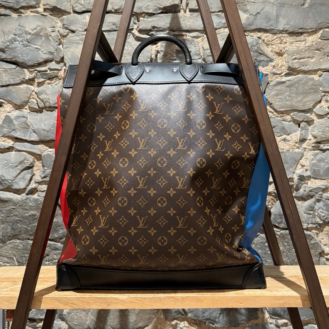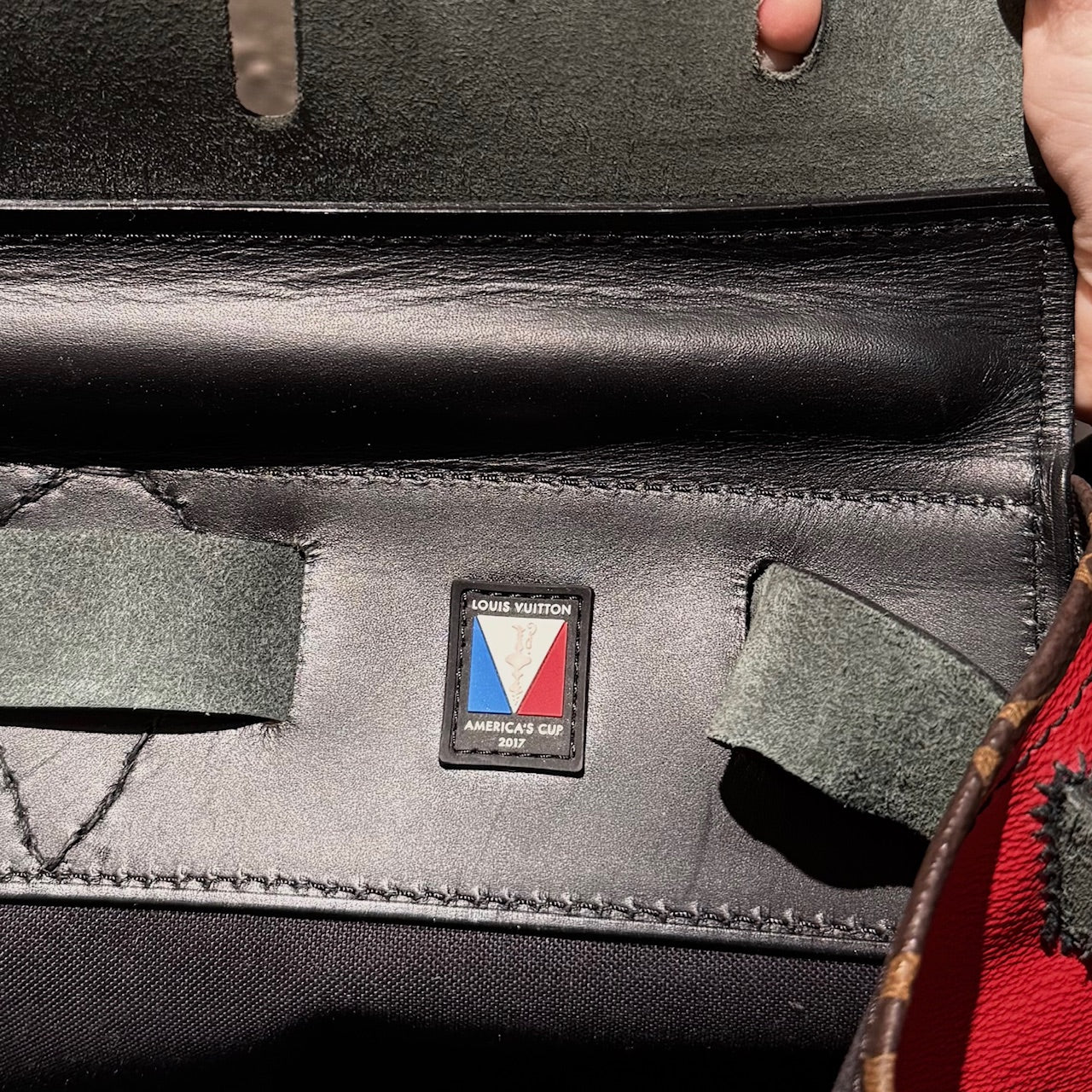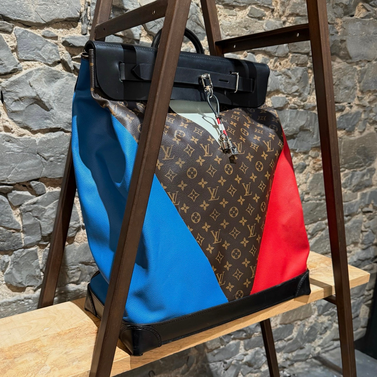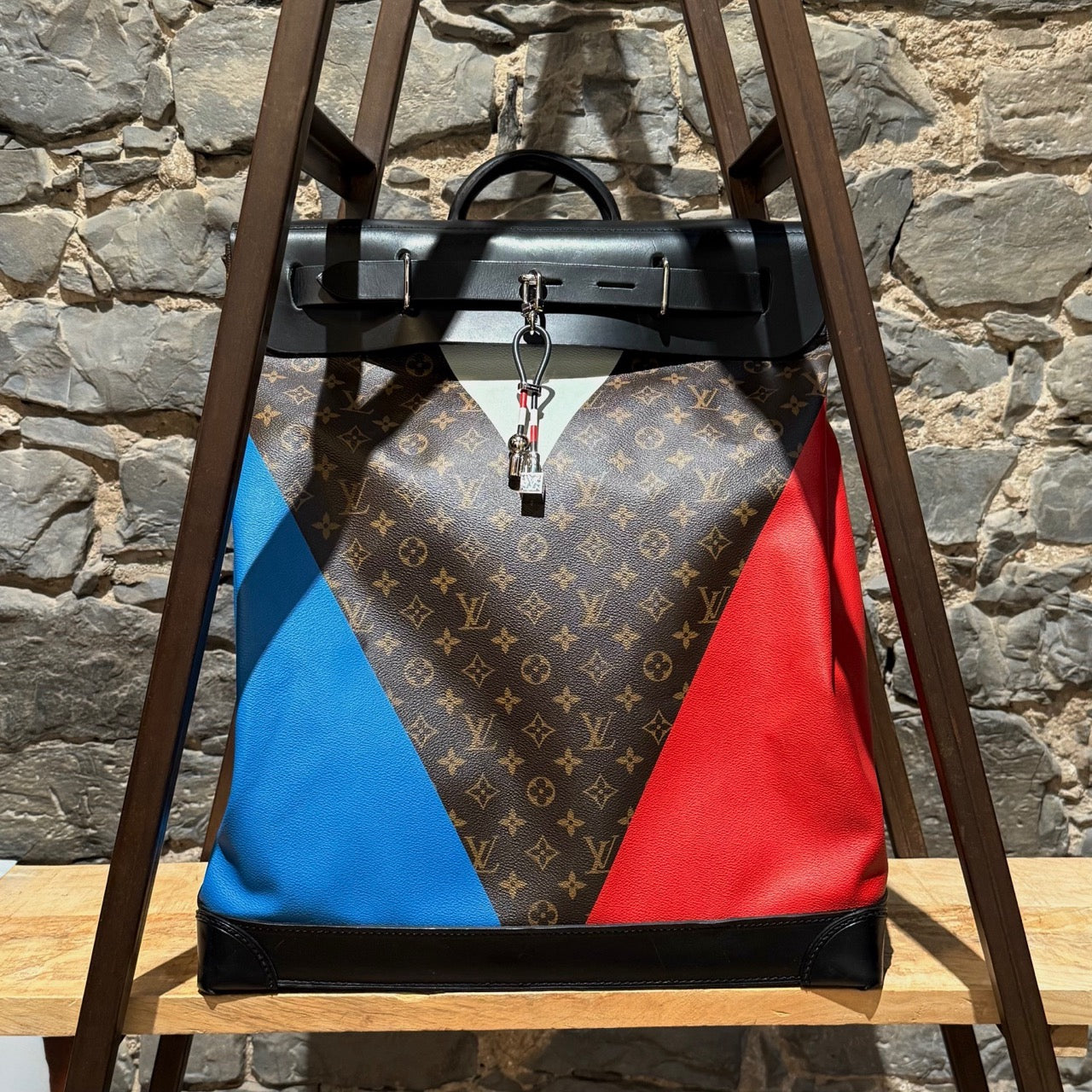 Sac Steamer en édition limitée issu de la collaboration Louis Vuitton America’s Cup 2017. Design Steamer structuré de grand format. Sac de voyage. Quincaillerie argentée. Toile enduite Monogram avec panneaux peints tricolores inspirés de la palette de l’America’s Cup, en blanc, bleu et rouge. Garnitures en cuir lisse noir sur l’ensemble. Poignée supérieure roulée en cuir noir. Ouverture sur le dessus avec fermeture par sangle et cadenas. Breloque de sac en métal gravée amovible avec attache en cuir tricolore et cordon. Base rigide plate en cuir noir avec renforts de protection aux coins. Intérieur spacieux avec doublure textile noire. Étiquette intérieure en cuir America’s Cup 2017. Fait en France. Livré tel quel.